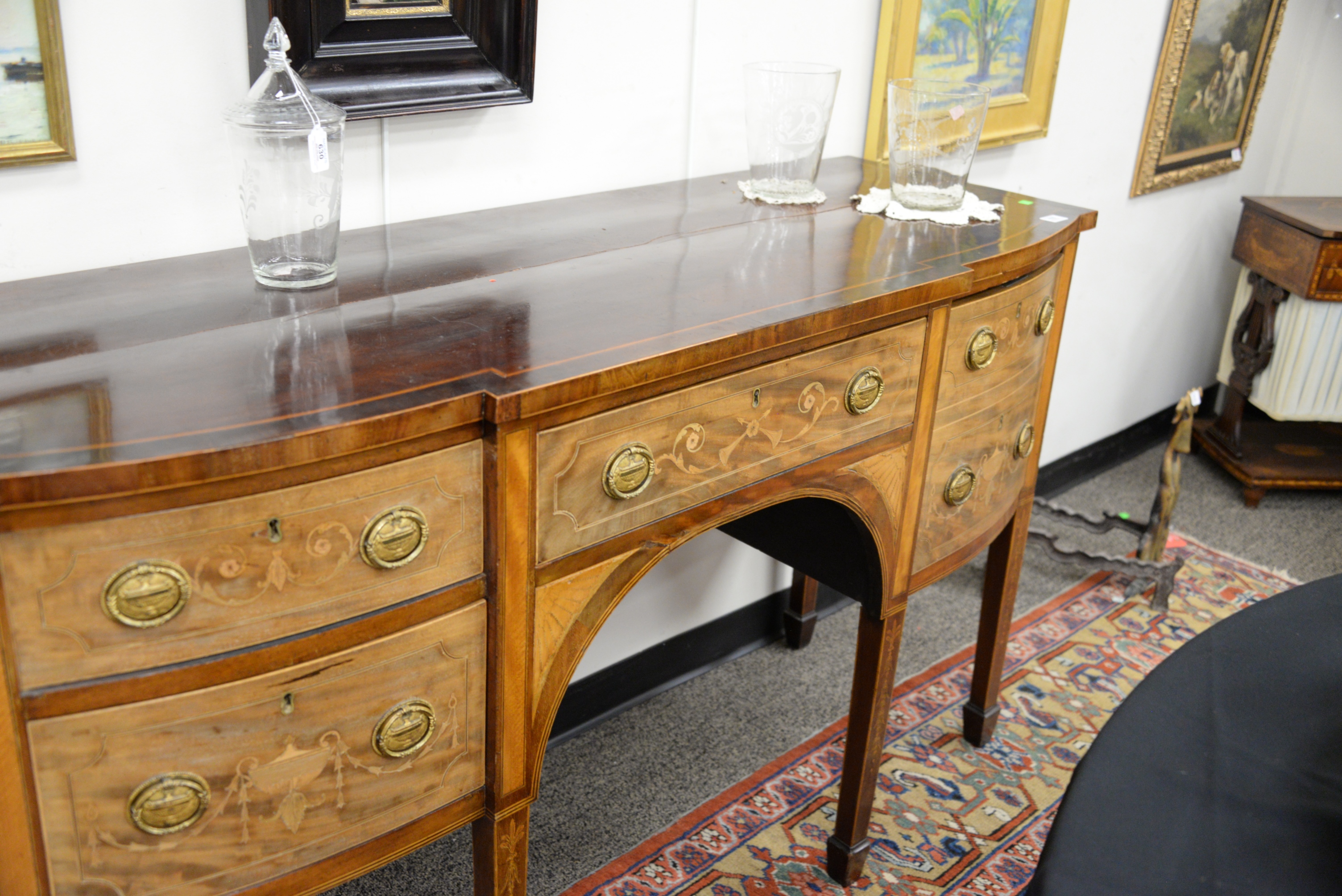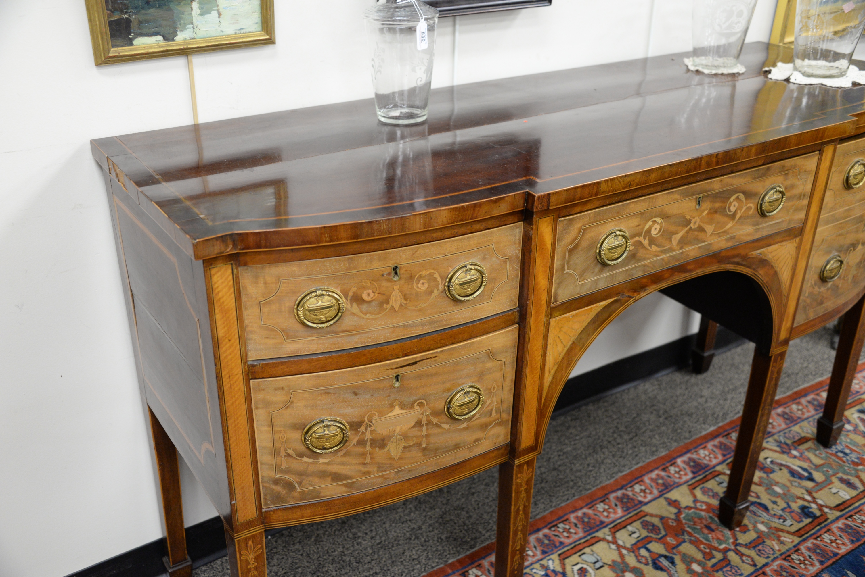 George III Mahogany Sideboard, having modified D-shaped top with slight bow over conforming case with center drawer flanked by deep cellarette drawer, two drawers having arched center, raised on square tapered legs ending in spade feet, entire front with marquetry and panel inlays, crack in top, sun faded front, height 37 inches, top 22″ x 63 1/4 inches. Provenance: Sotheby Parke-Bernet, December 8, 1973, item #131, Julius H Jacobson II a Fifth Avenue Estate.