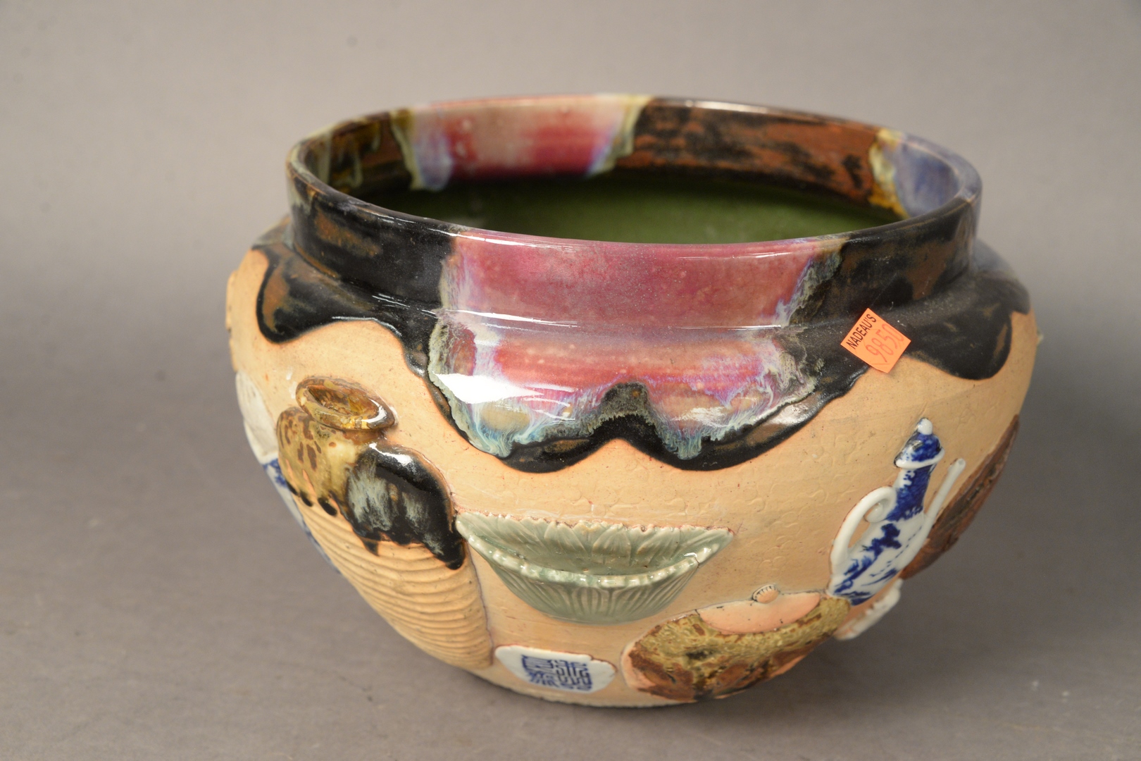 Japanese Ceramic Jardiniere having green interior glaze and multicolor exterior glazes having miniature ceramic vessels mounted along the body, height 7 1/2 inches, diameter 9 inches.