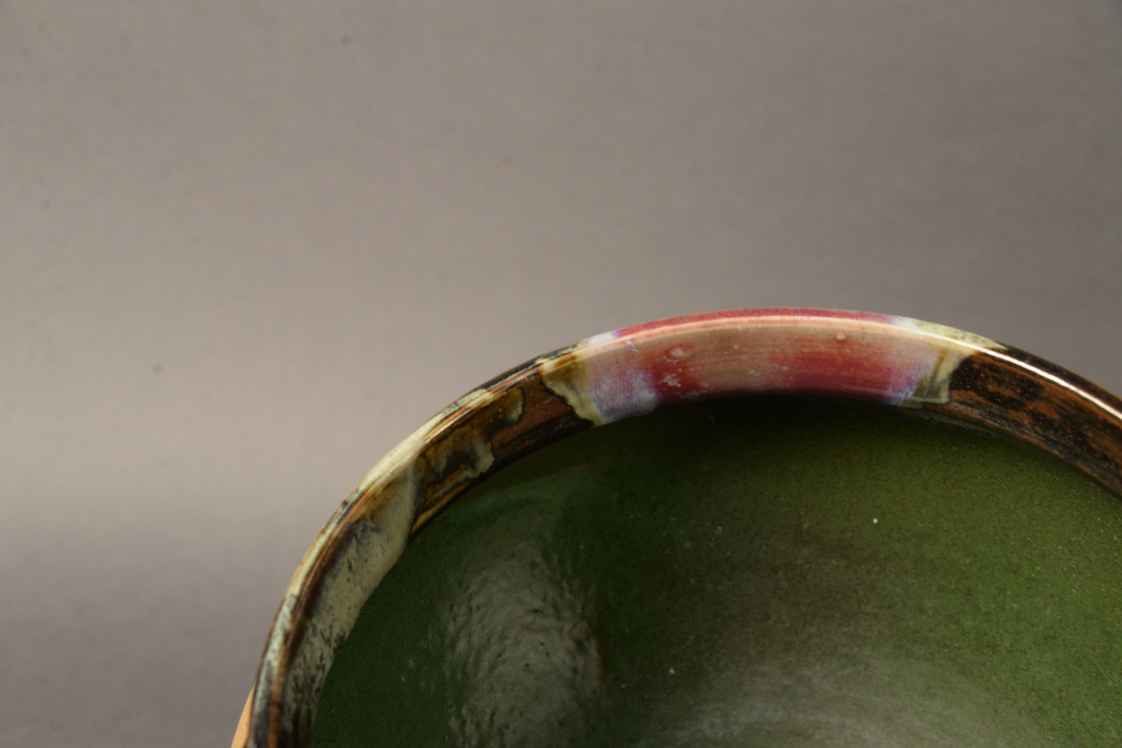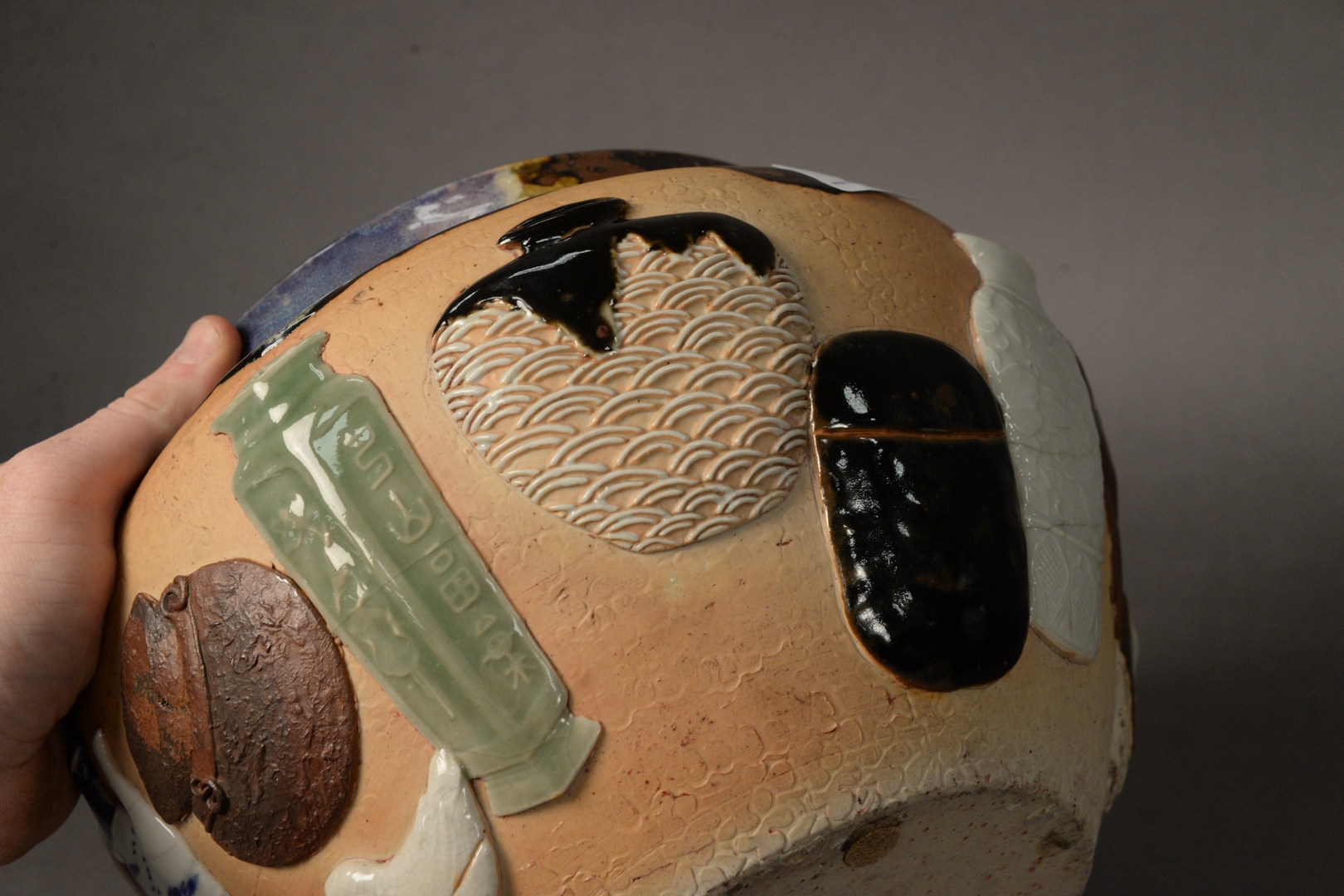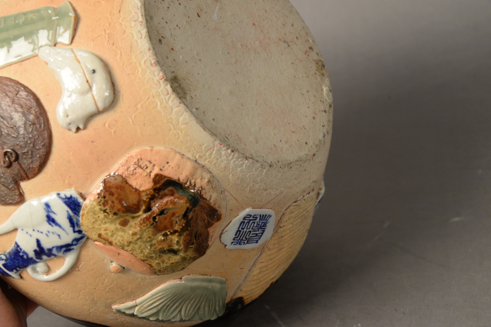 Lot 616: Japanese Ceramic Jardiniere having green interior glaze and multicolor exterior glazes having miniature ceramic vessels mounted alon…