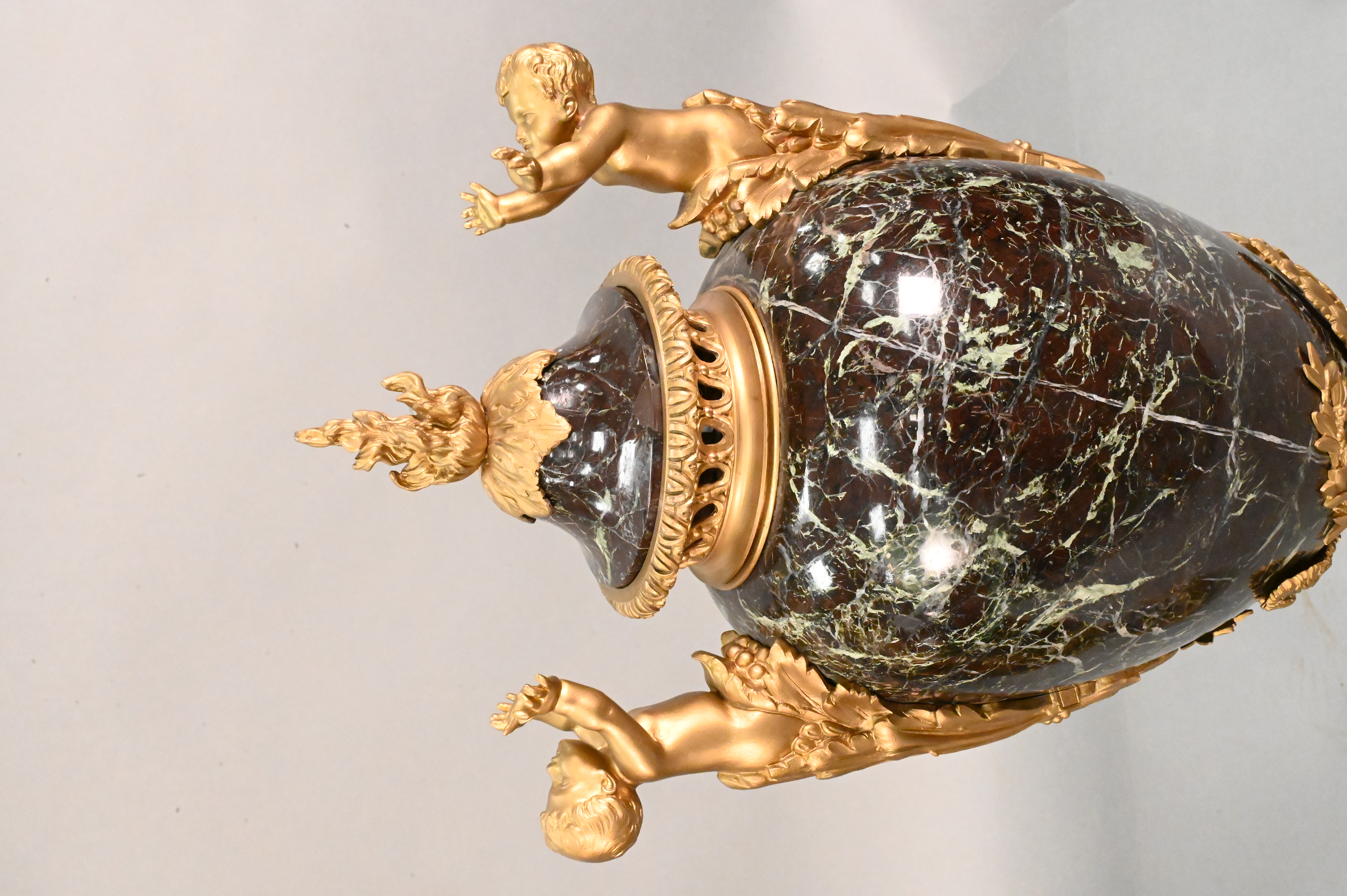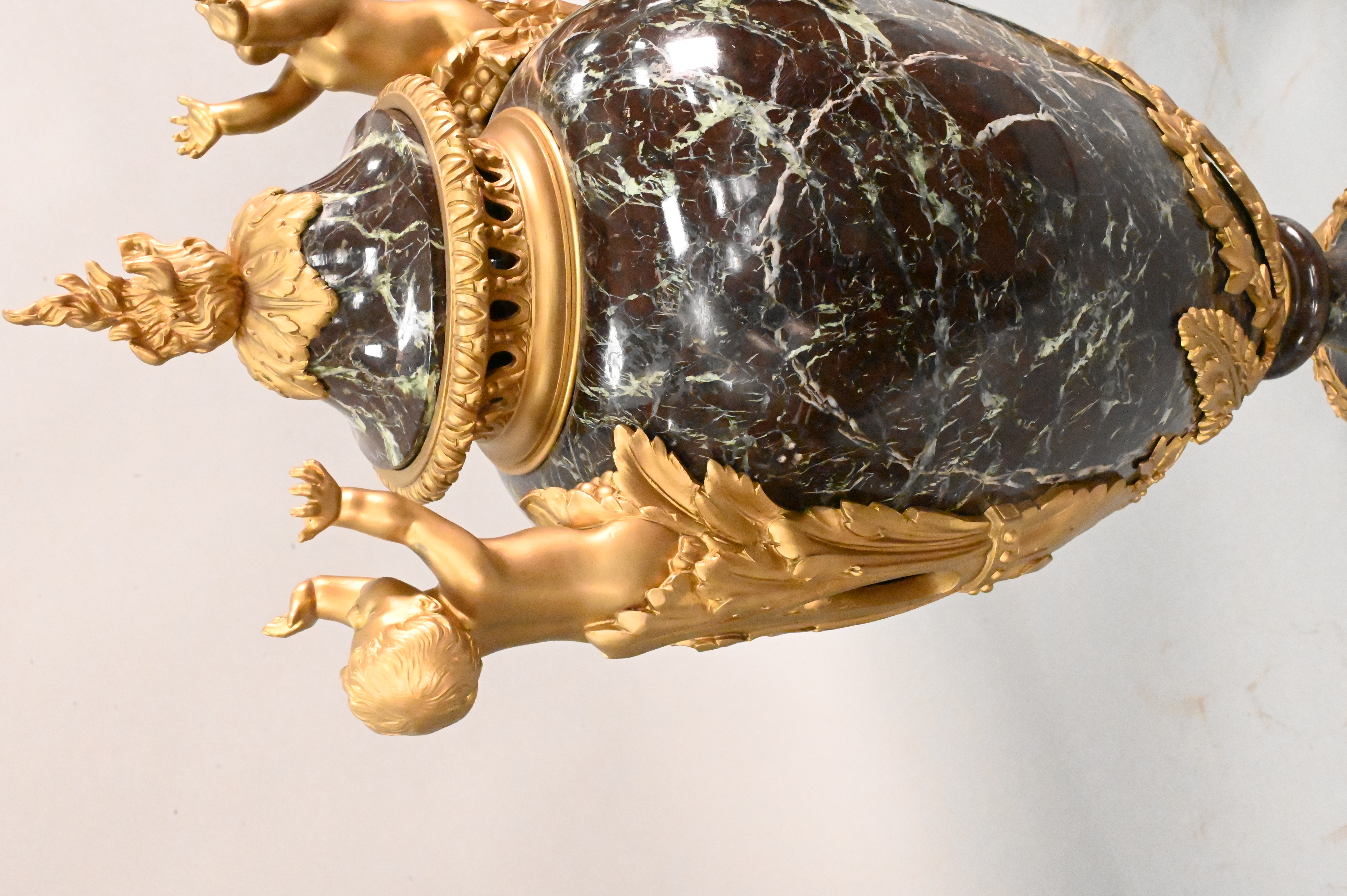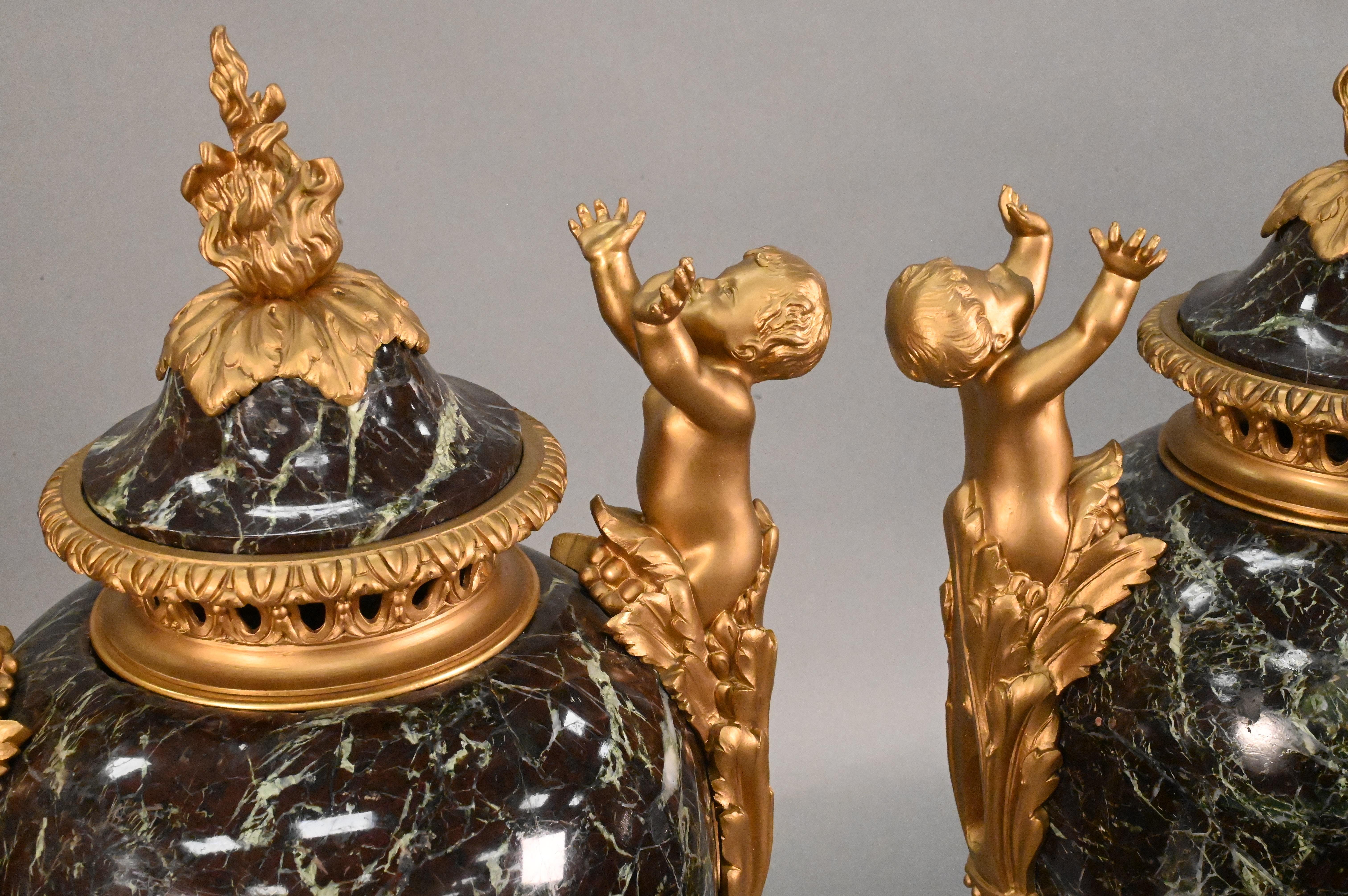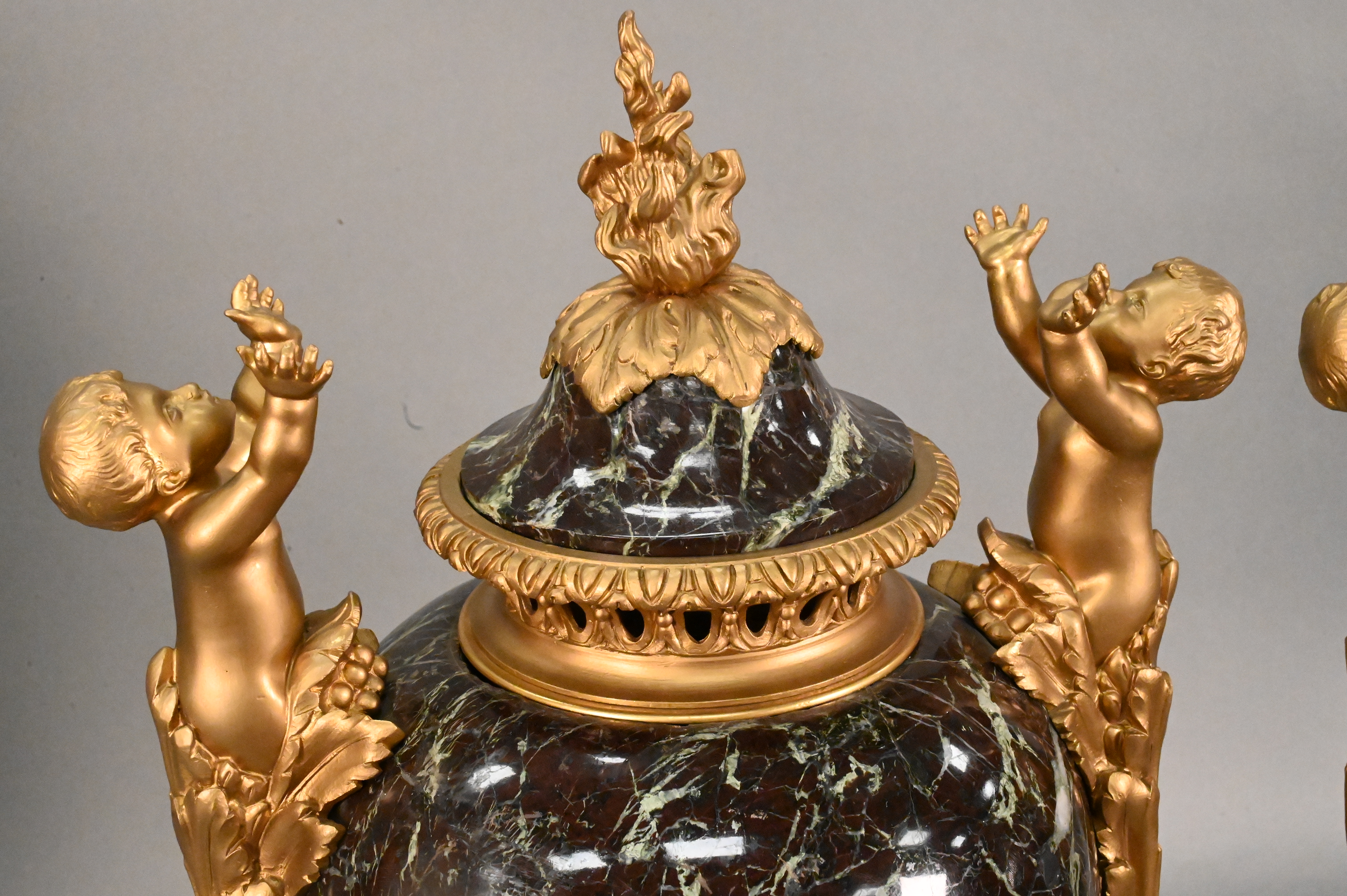 each having flame form finial flanked by putto term figure handles on a baluster body with applied ormolu and gilt metal foliate and floral sprays, raised on a waisted socle and shaped plinth