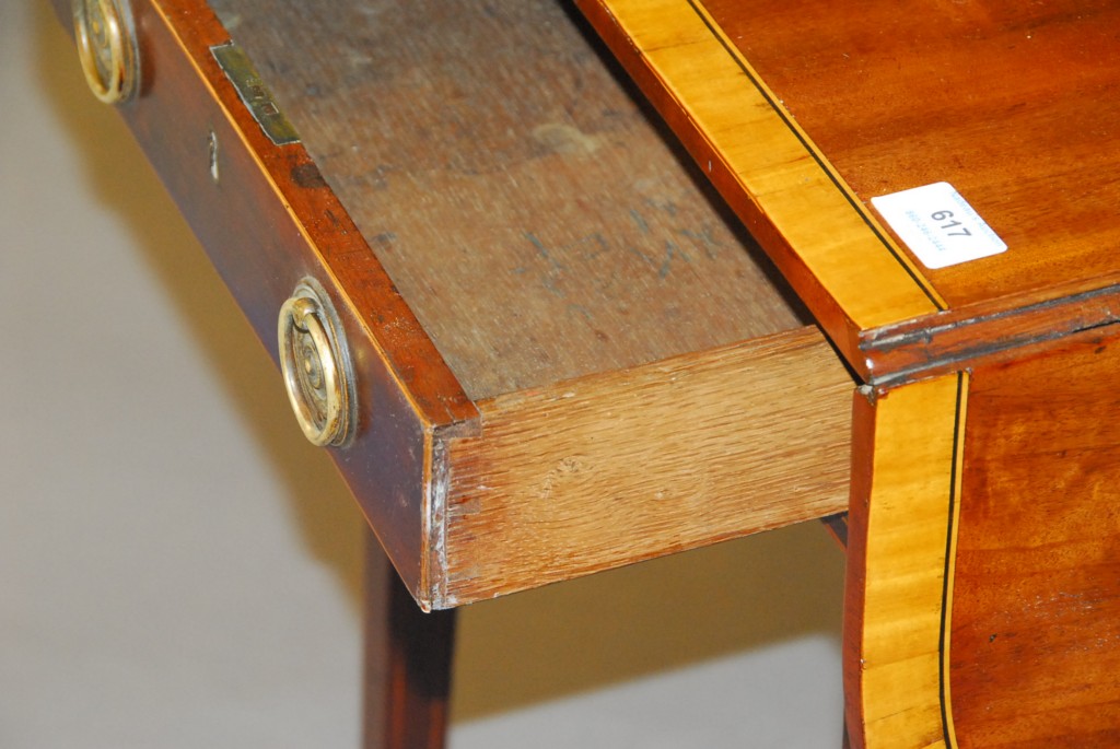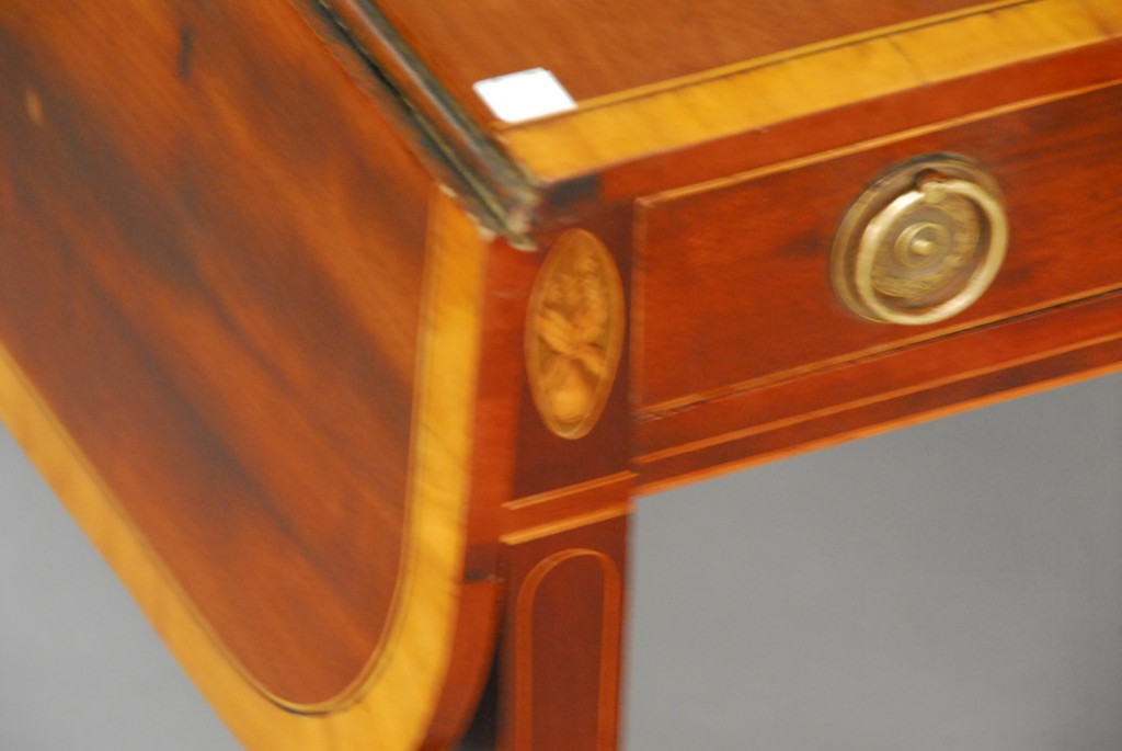 Lot 617: Hepplewhite mahogany and satinwood inlaid Pembroke table, the rectangular top with double drop leaves, having a large round central …