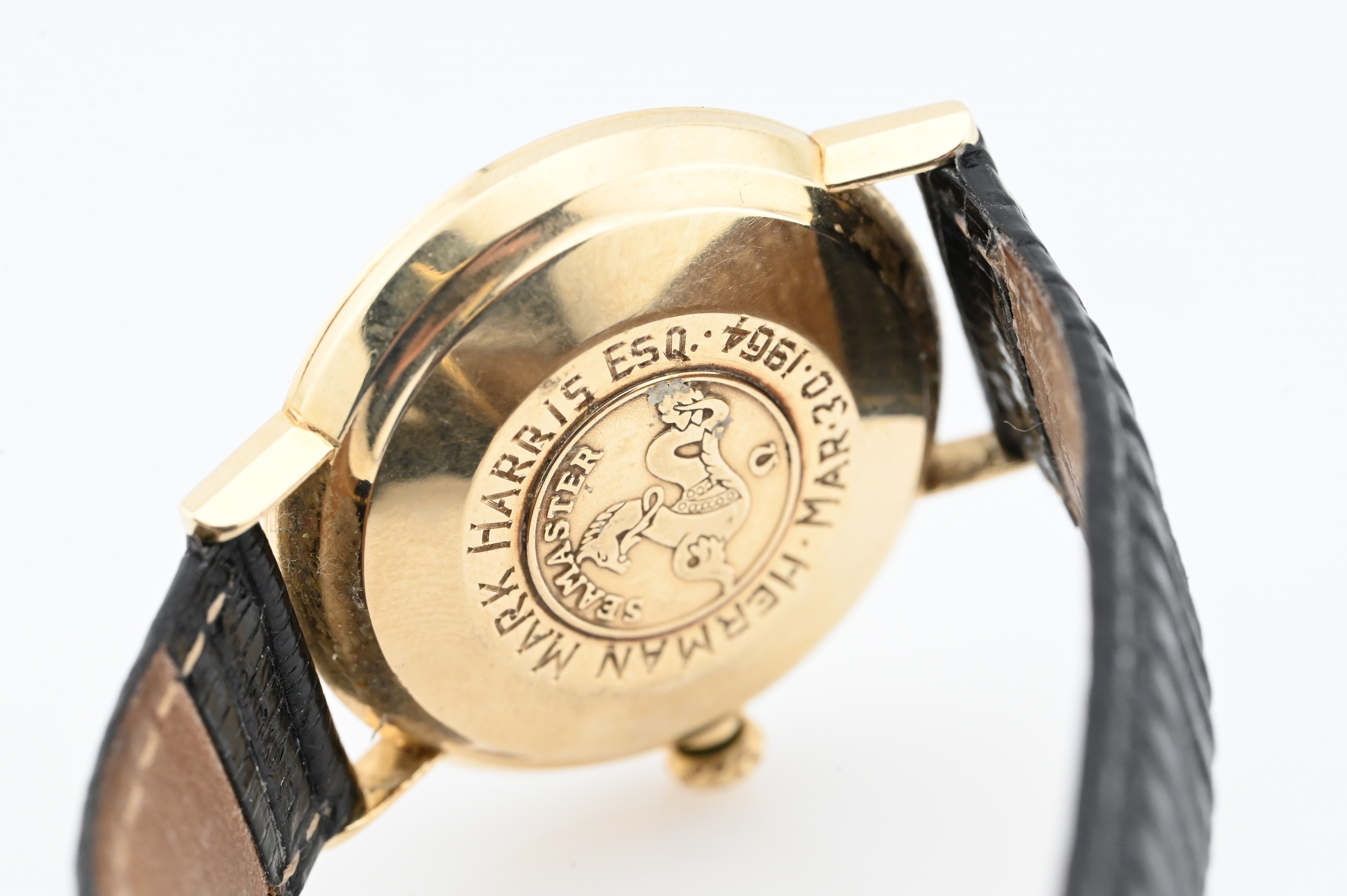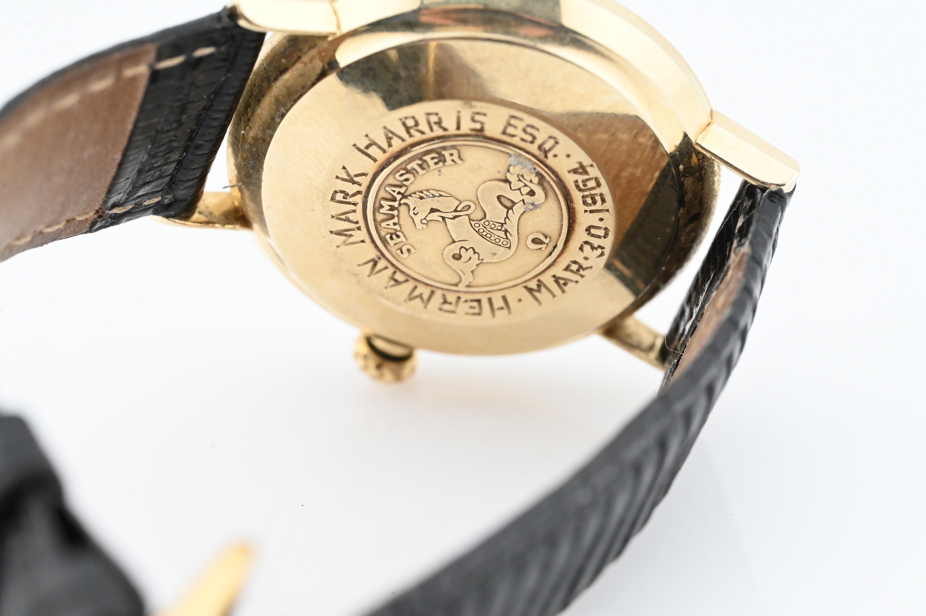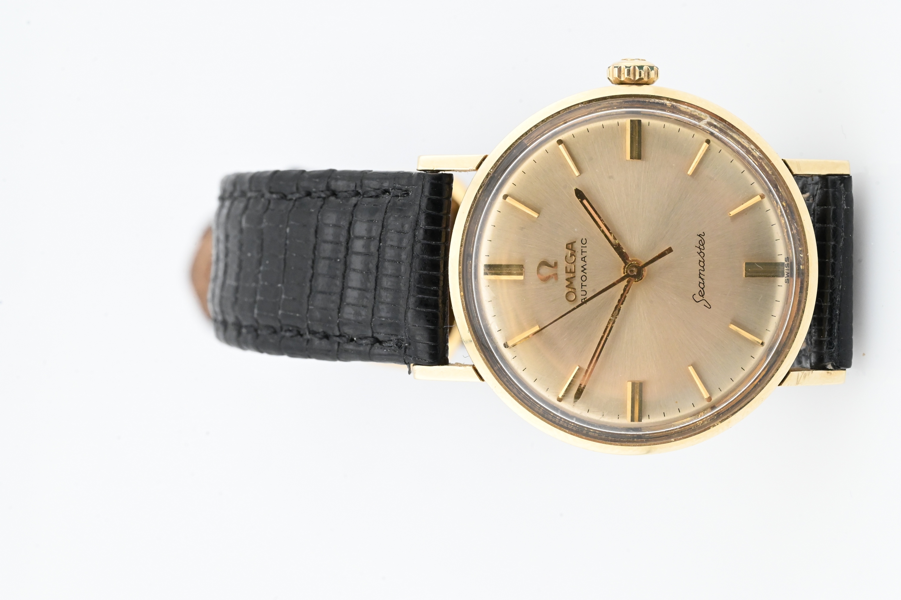 sunburst champagne dial with baton markers, gold hands, 14K gold case with Seamaster hippocampus medallion; black textured strap, automatic