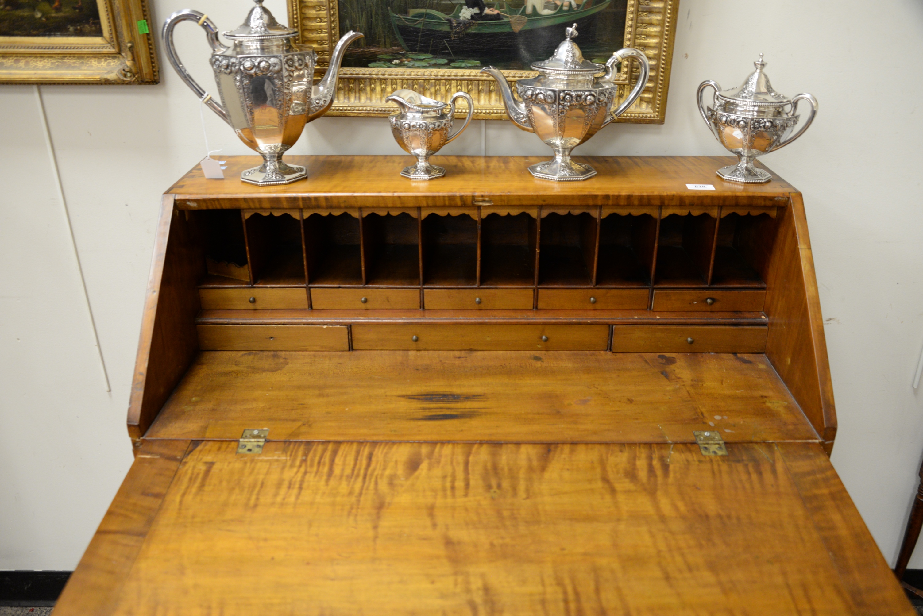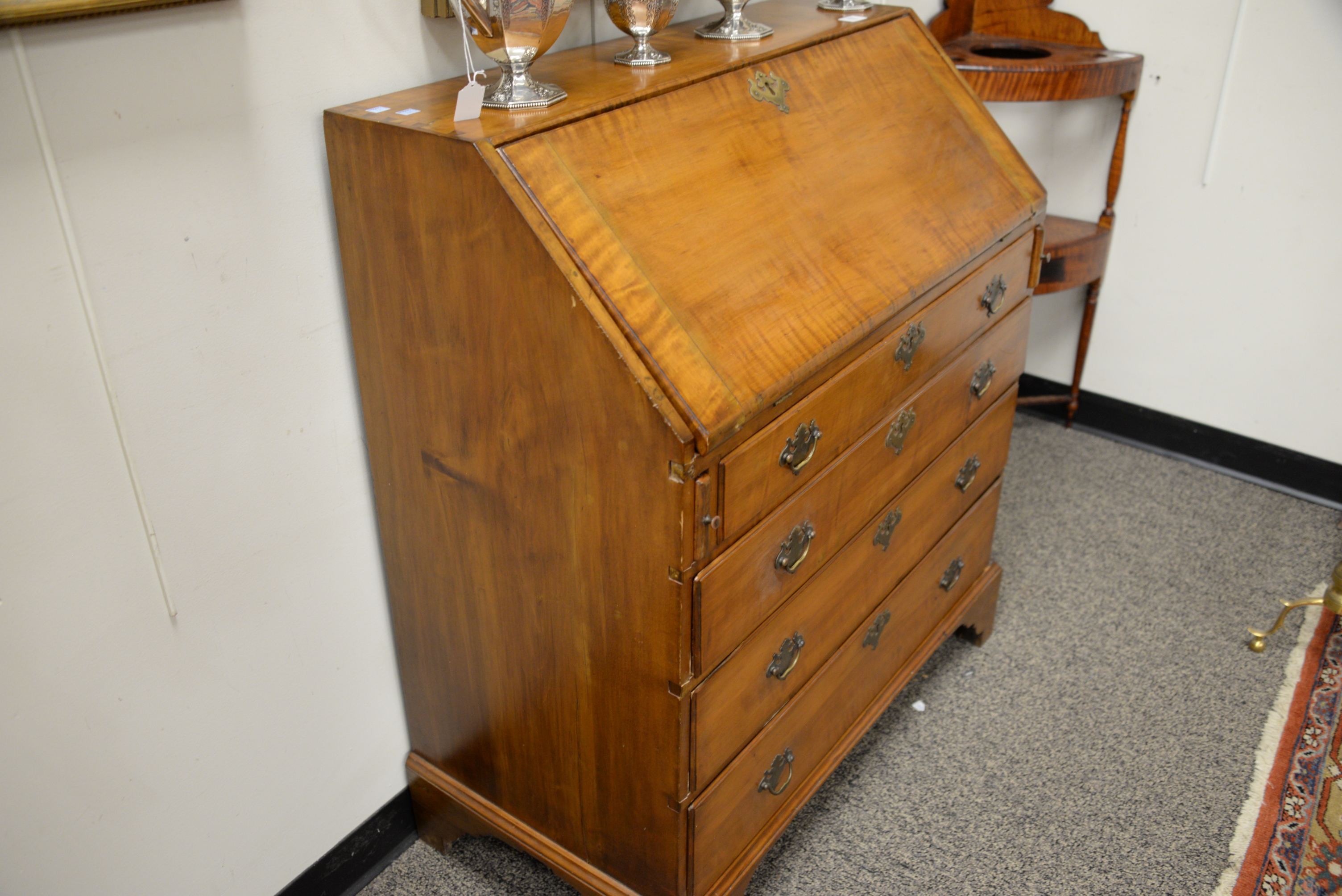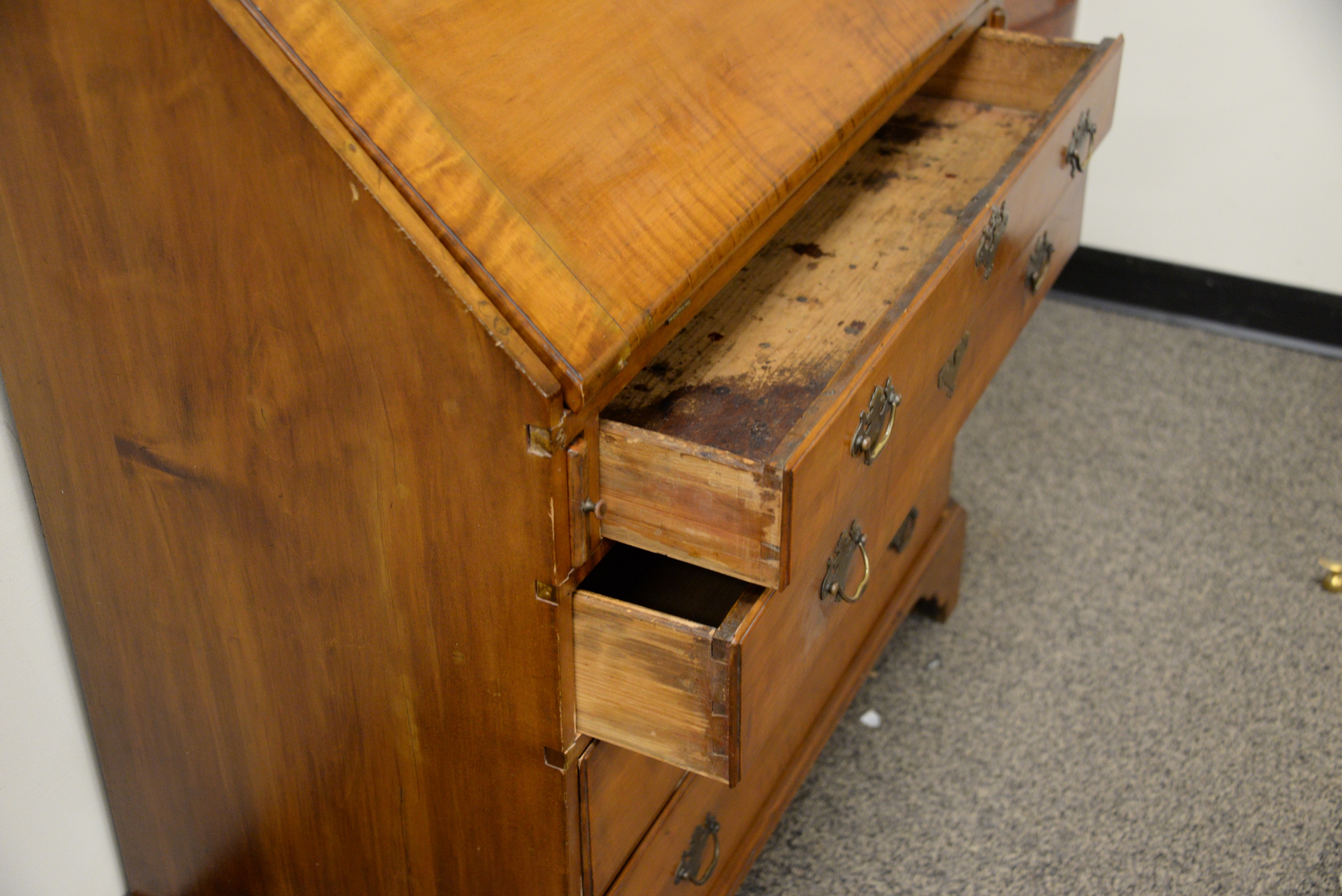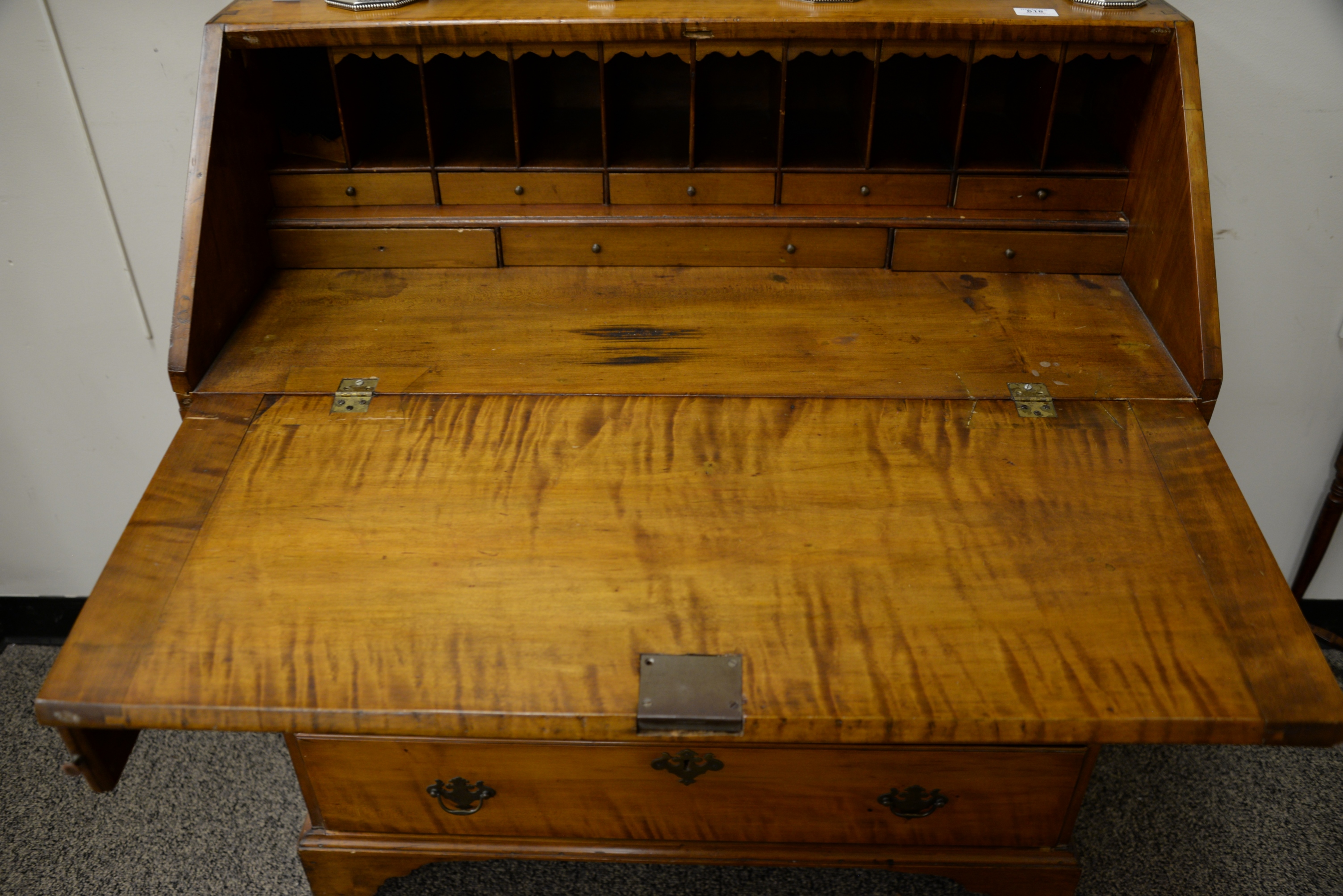 Chippendale Maple Tiger Maple Desk, slant front is over four graduated drawers, all set on cutout bracket feet, 18th century, height 41 inches, width 36 inches.