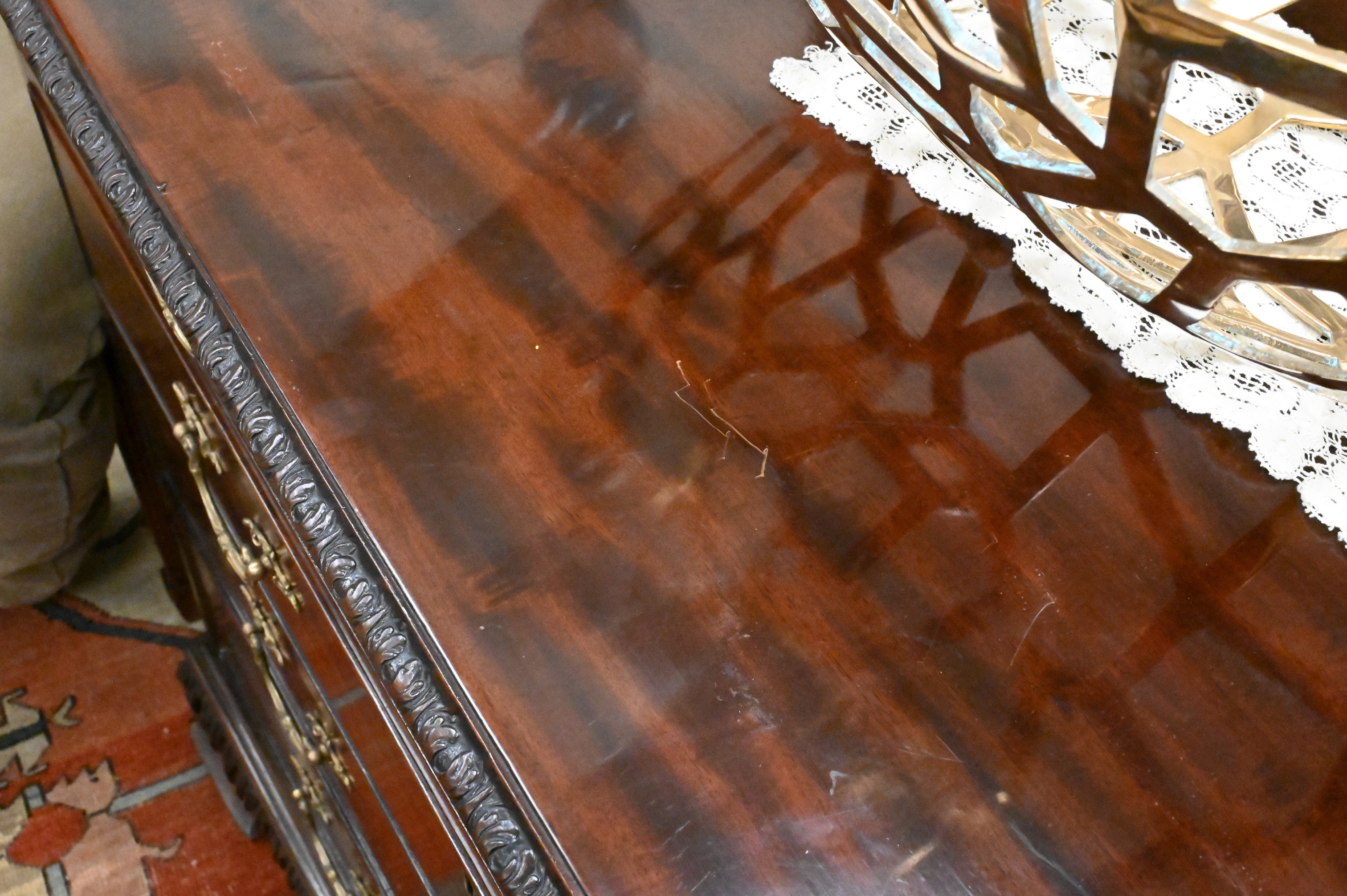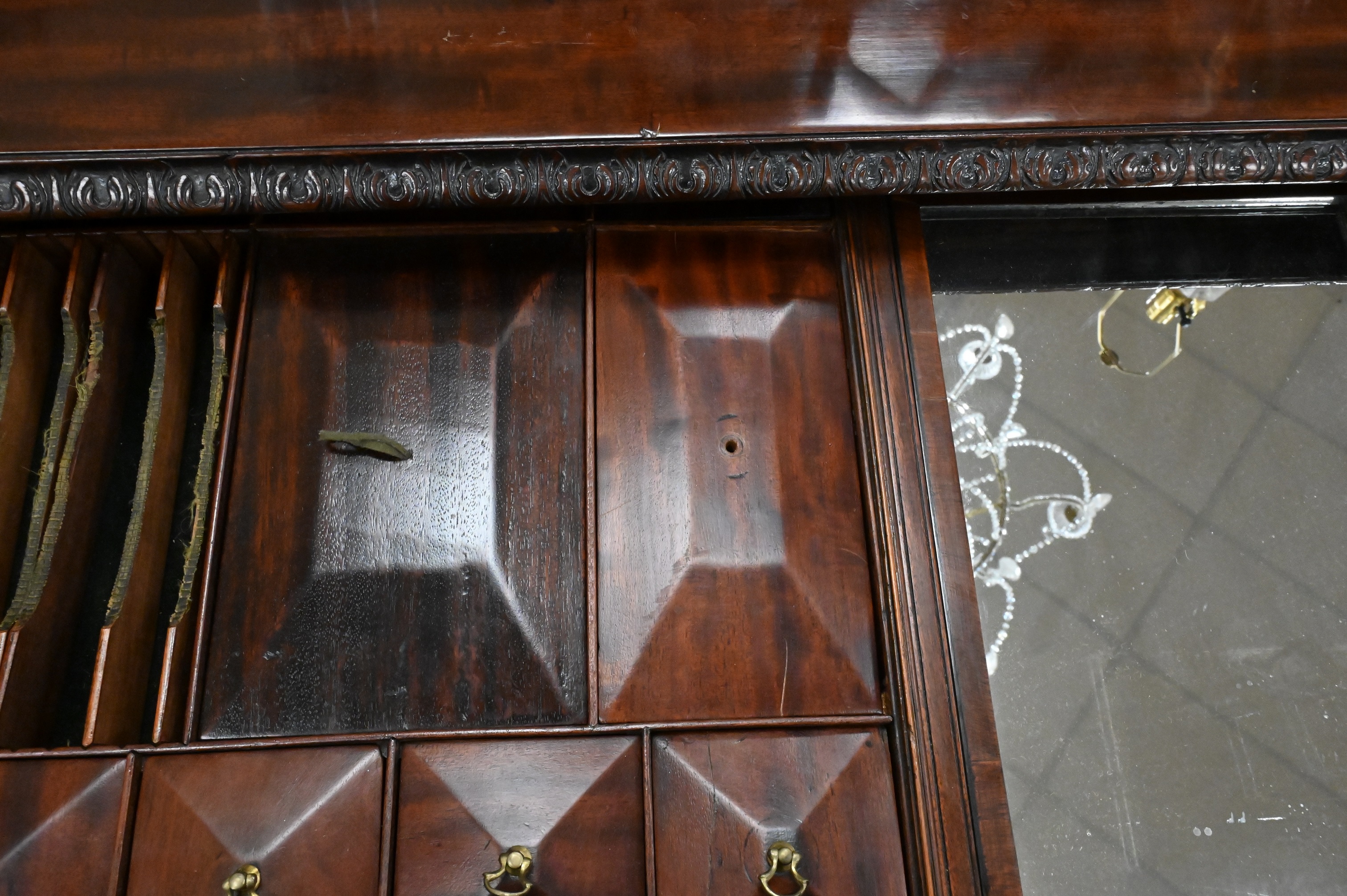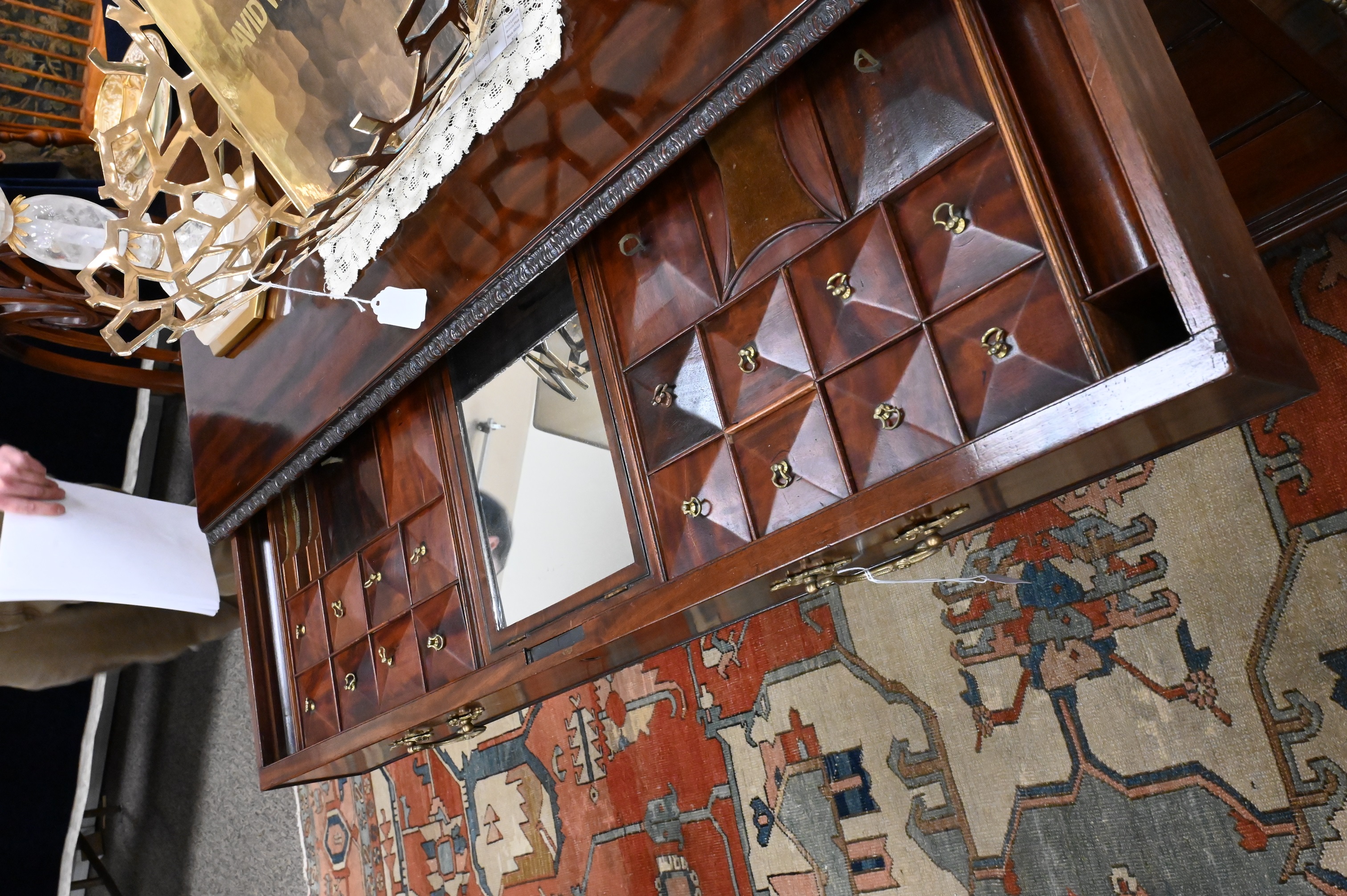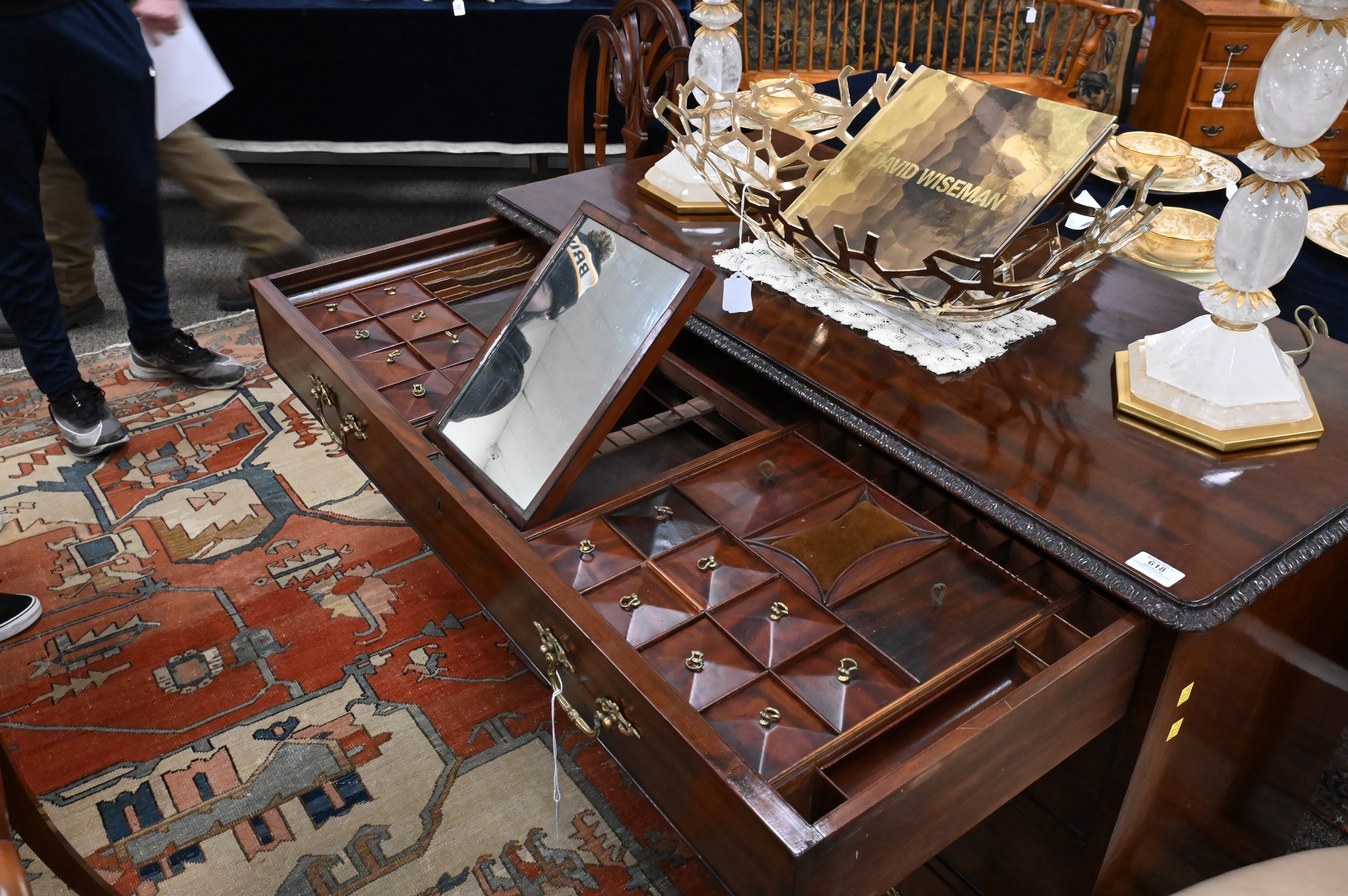 top drawer having 27 covered compartments and a mirror, over three drawers, top with imbricated edge, icicle carving on ogee feet, 18th century