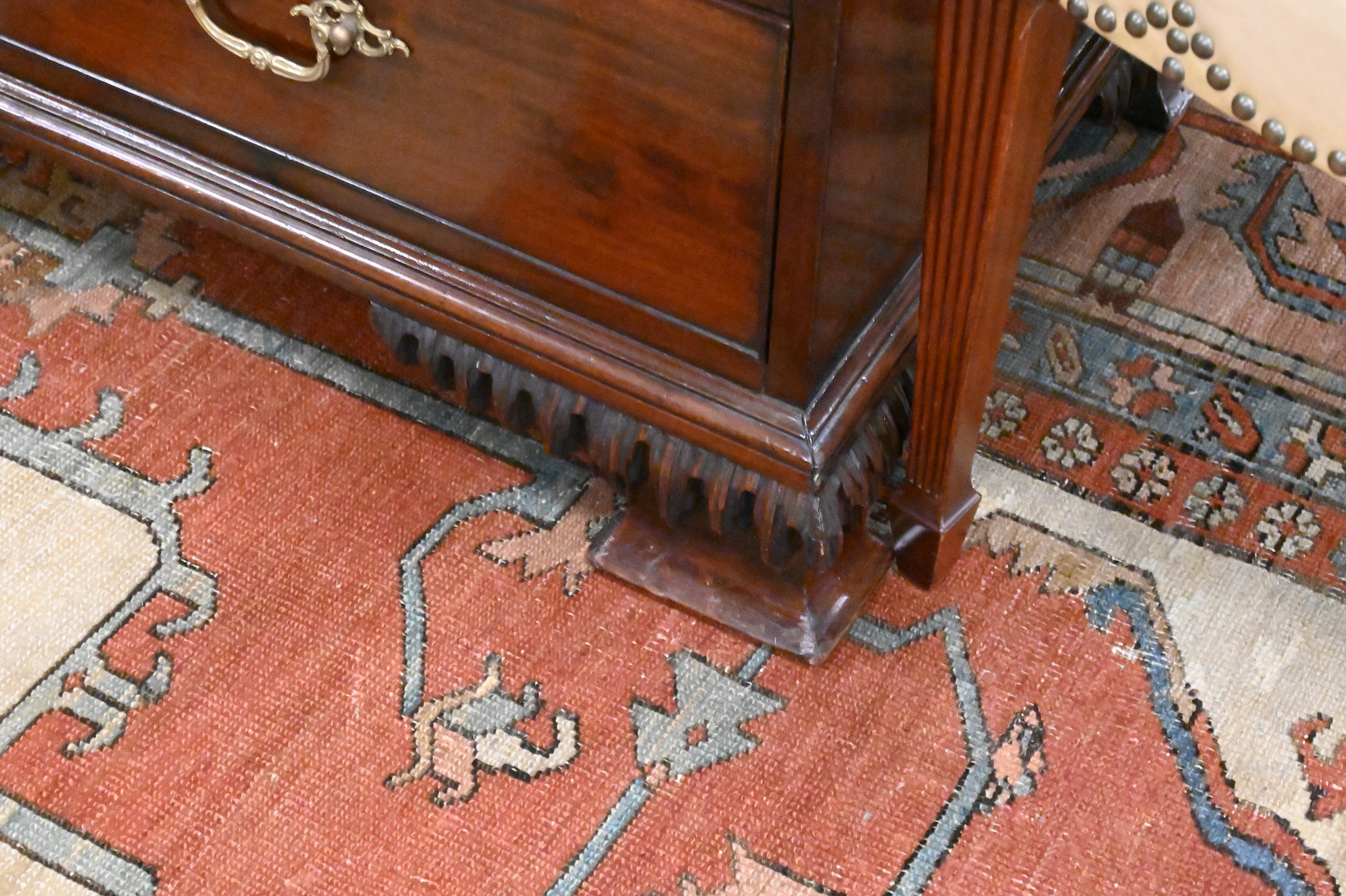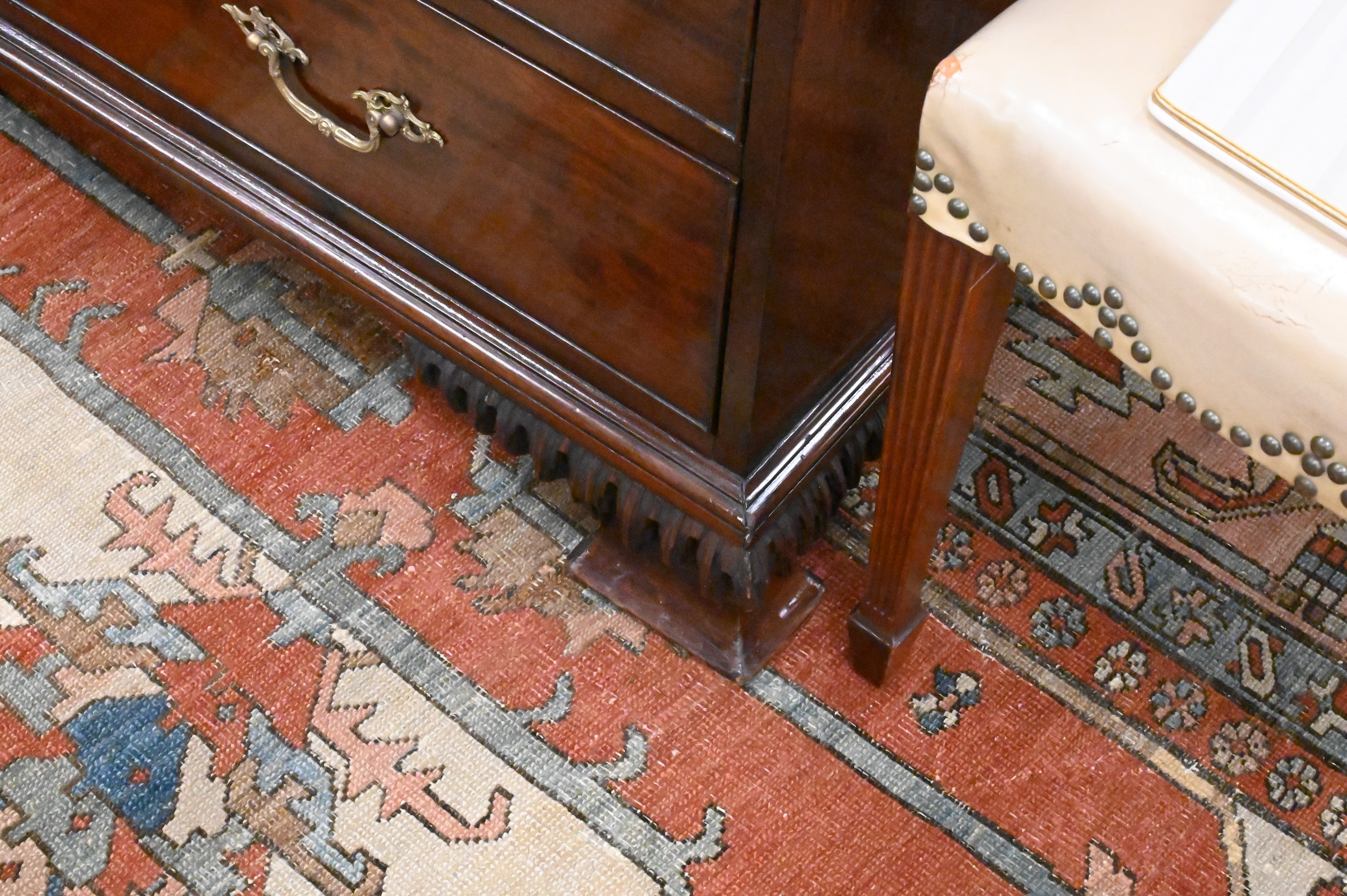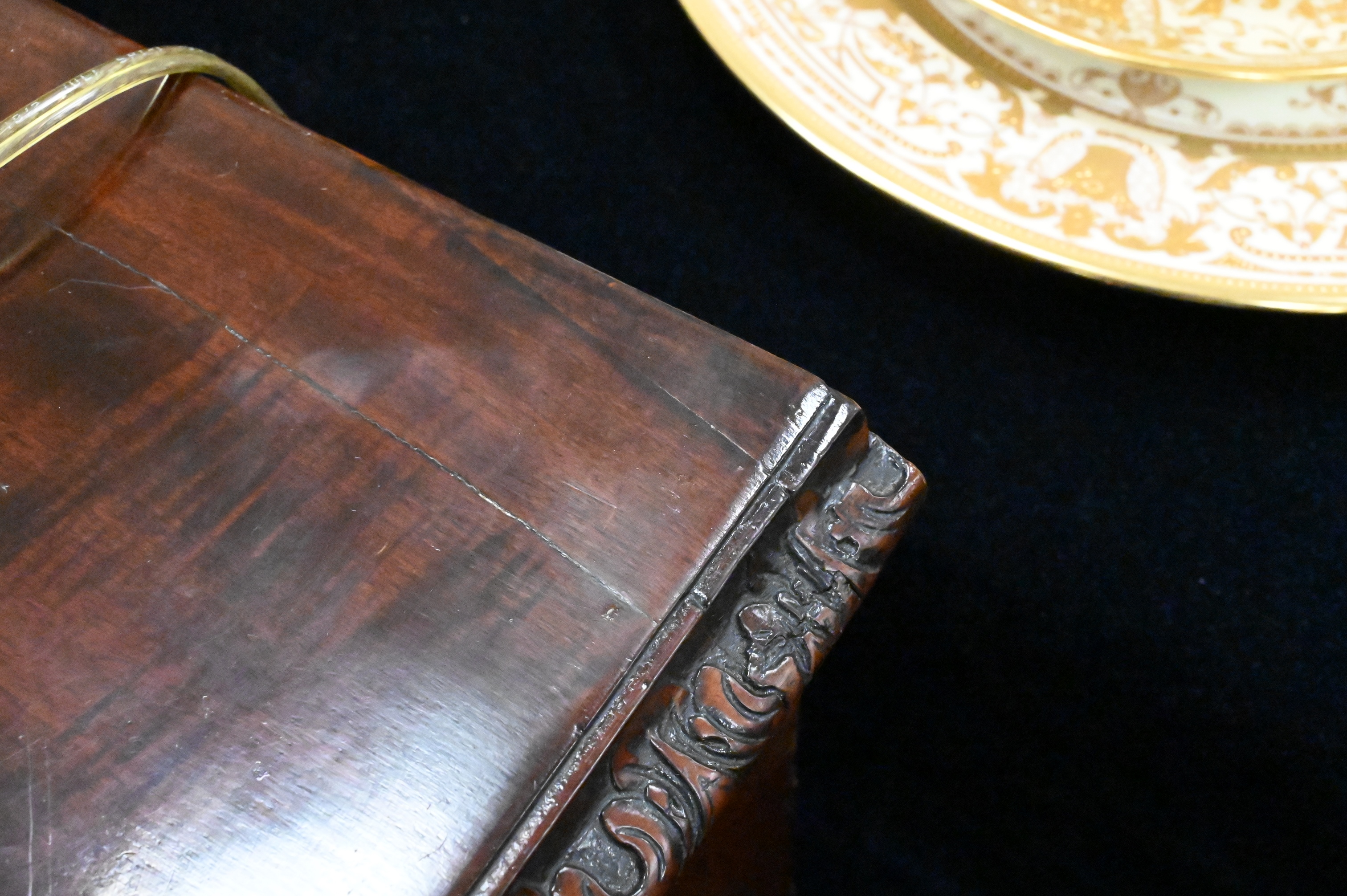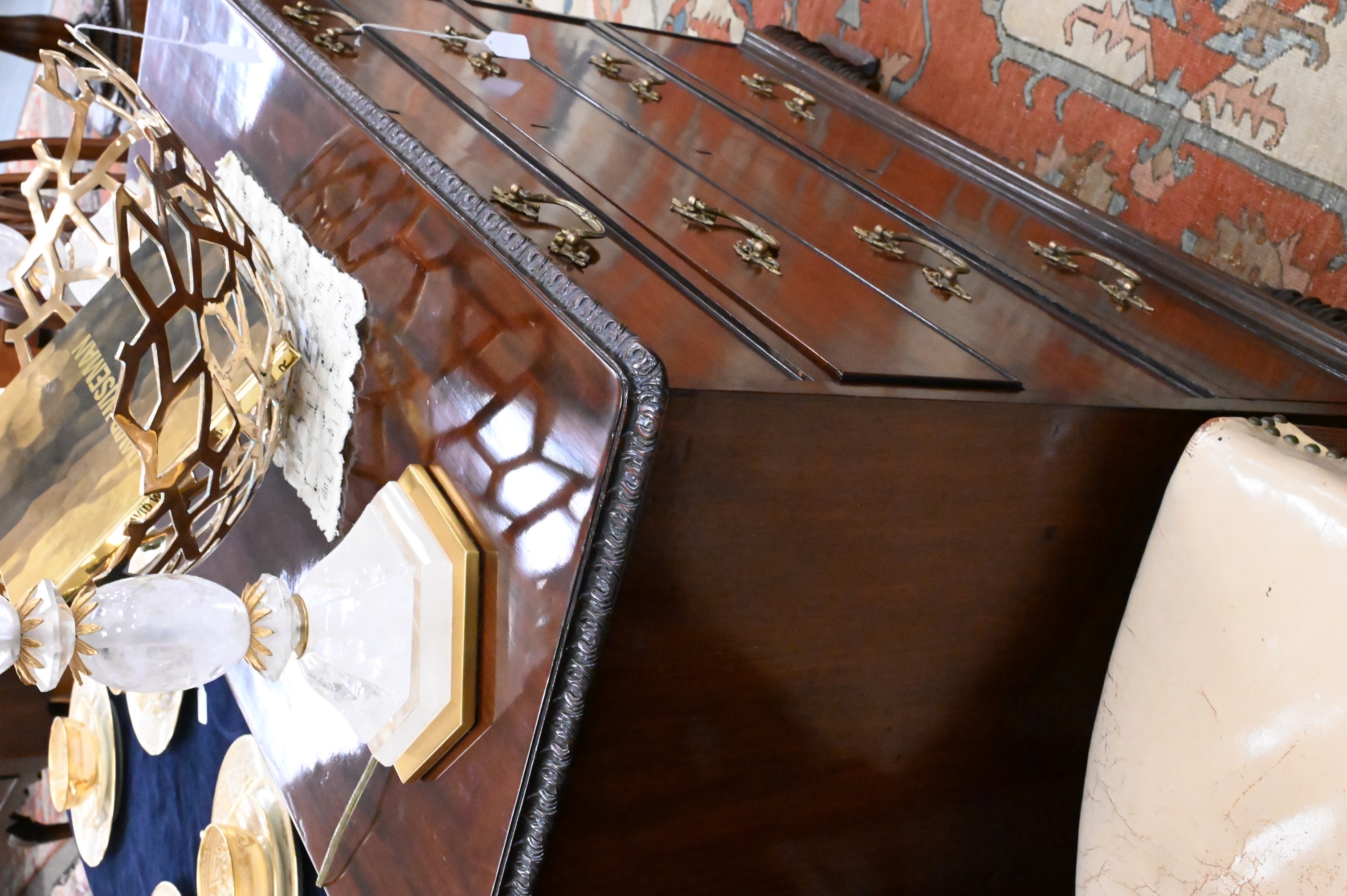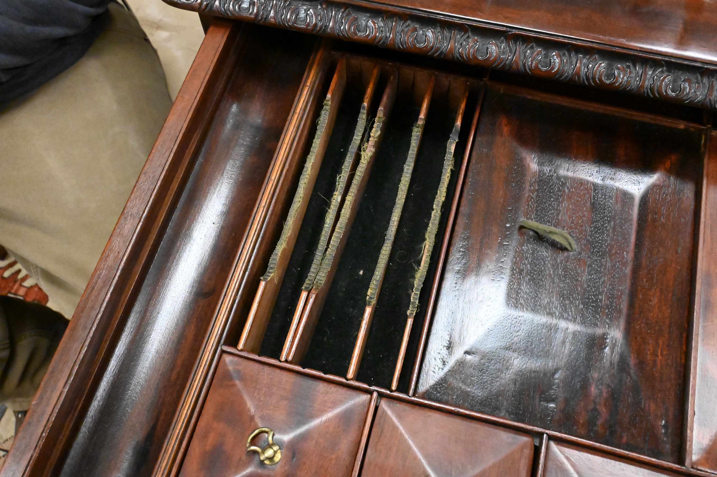 top drawer having 27 covered compartments and a mirror, over three drawers, top with imbricated edge, icicle carving on ogee feet, 18th century