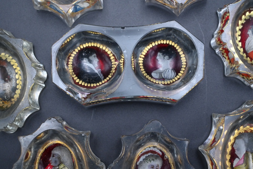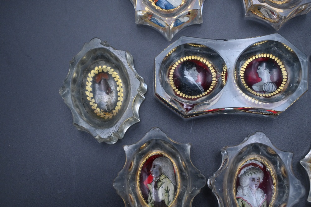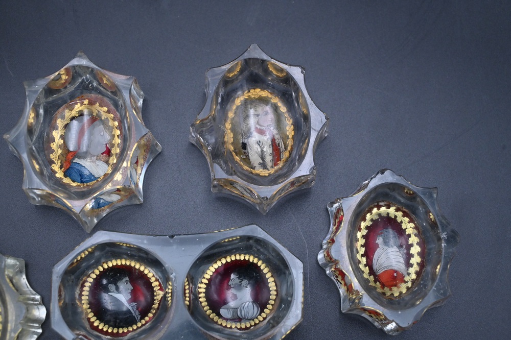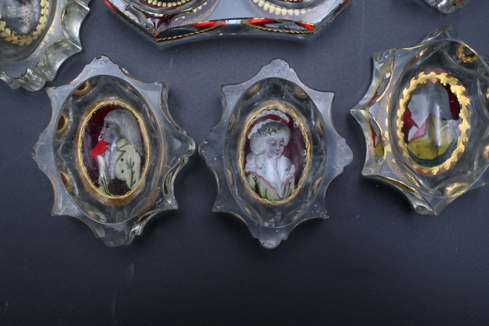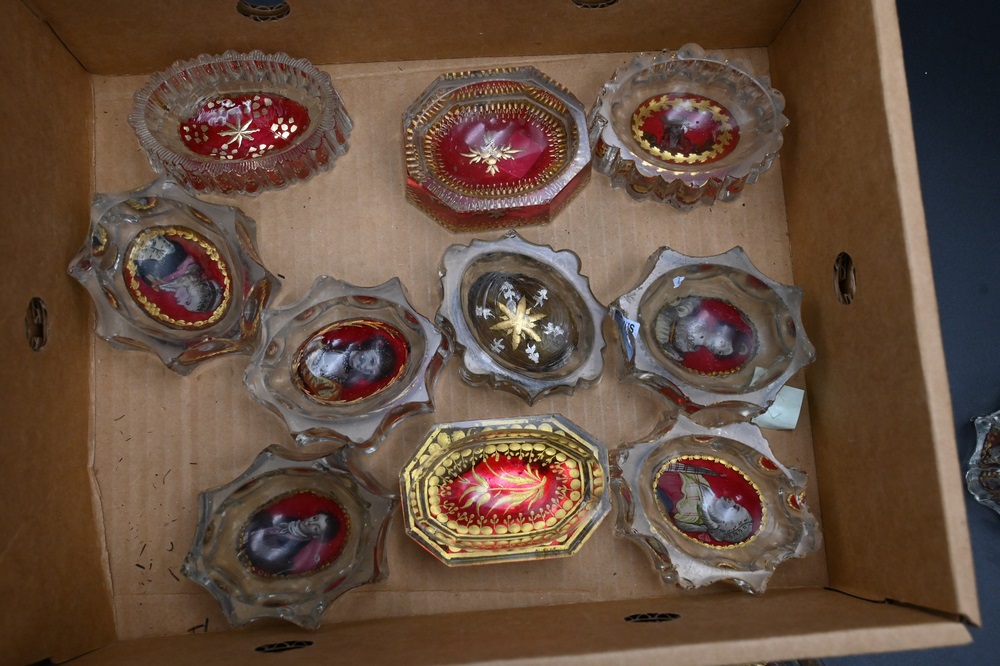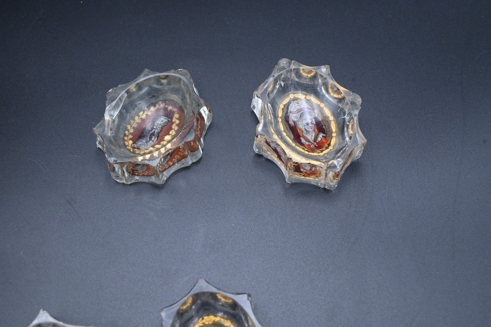 Lot 618: Large Group of 20 Glass Salts, having painted portraits with cranberry background and gold wreath, four having gilt gold and cranber…