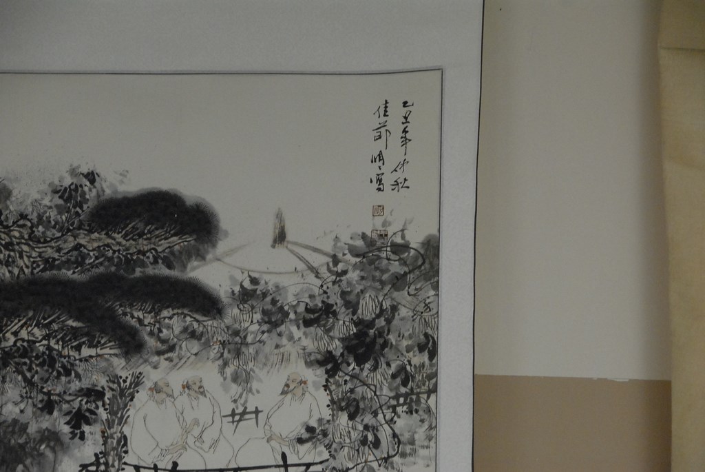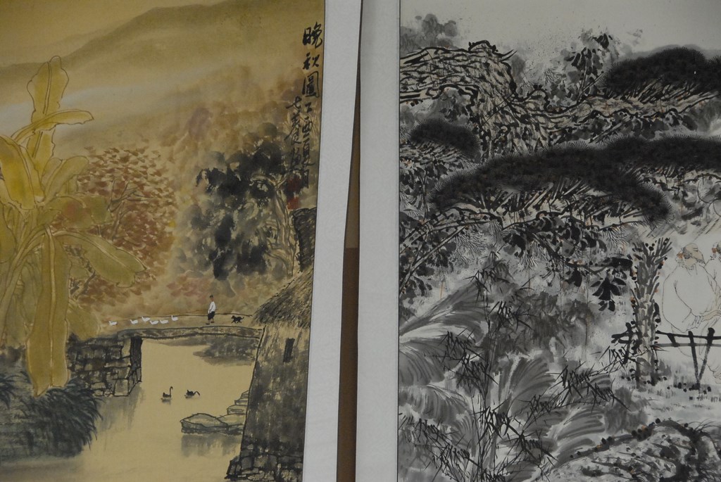 Two Oriental scroll landscape watercolors on paper. 27 x 27