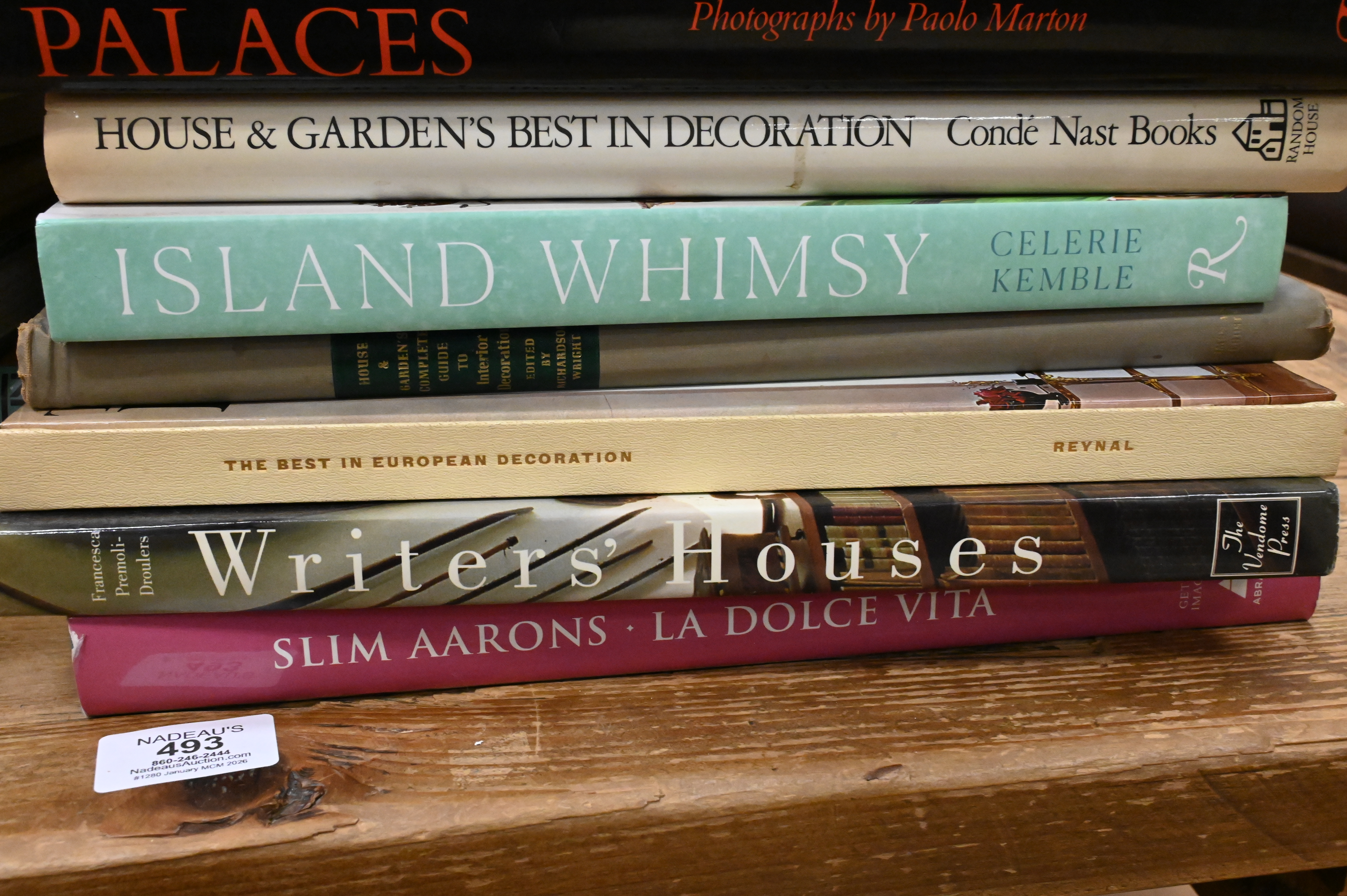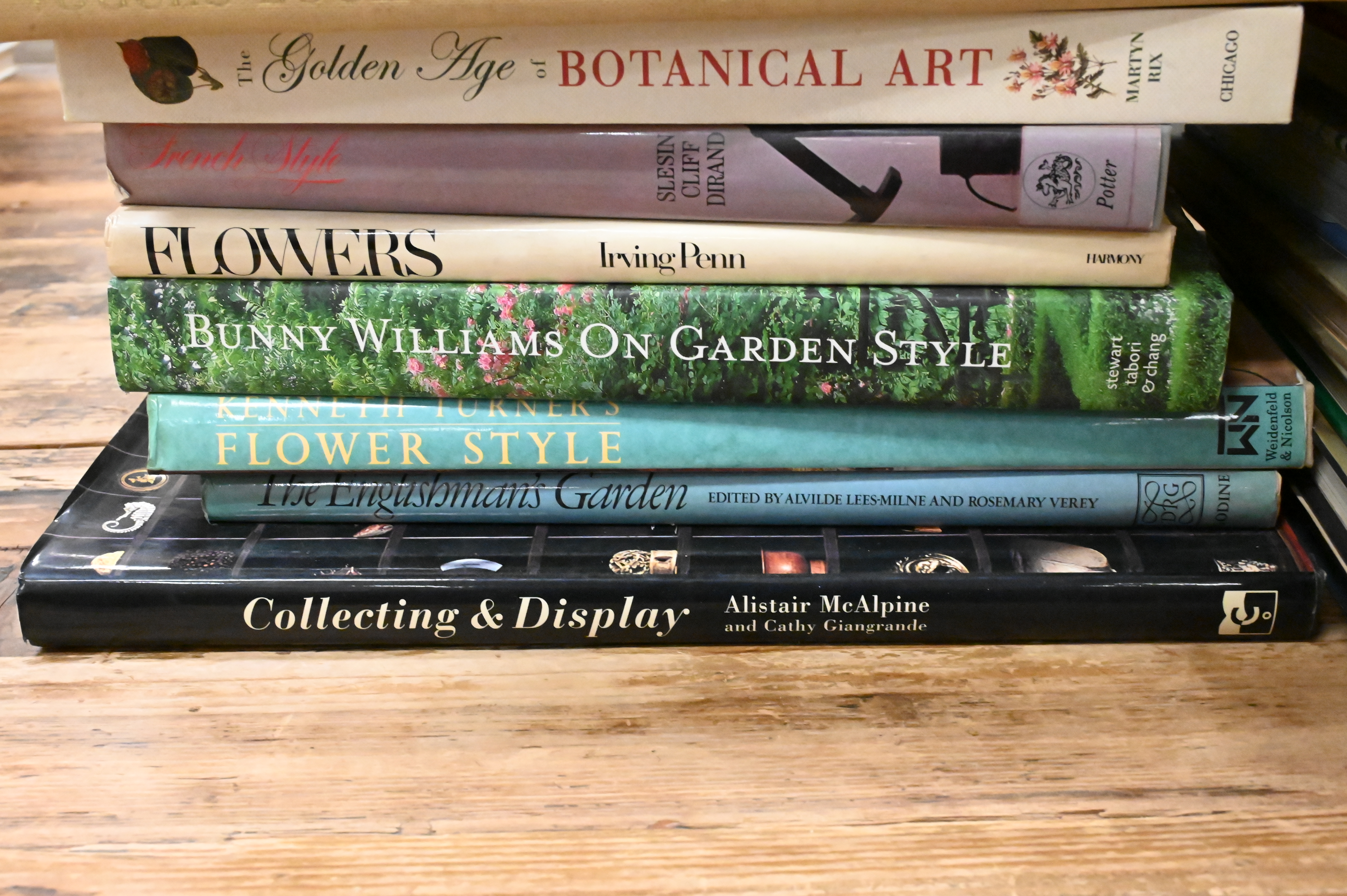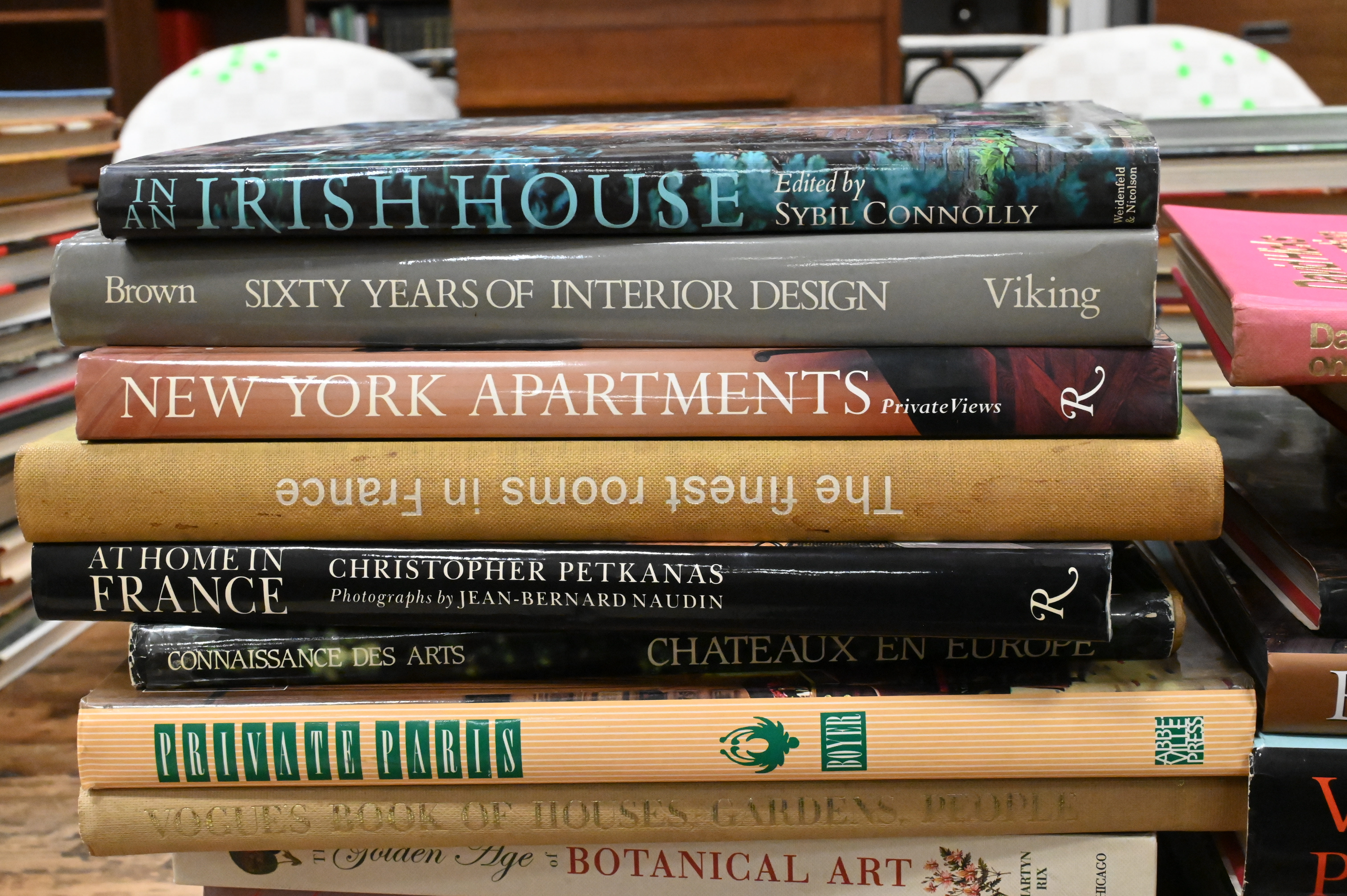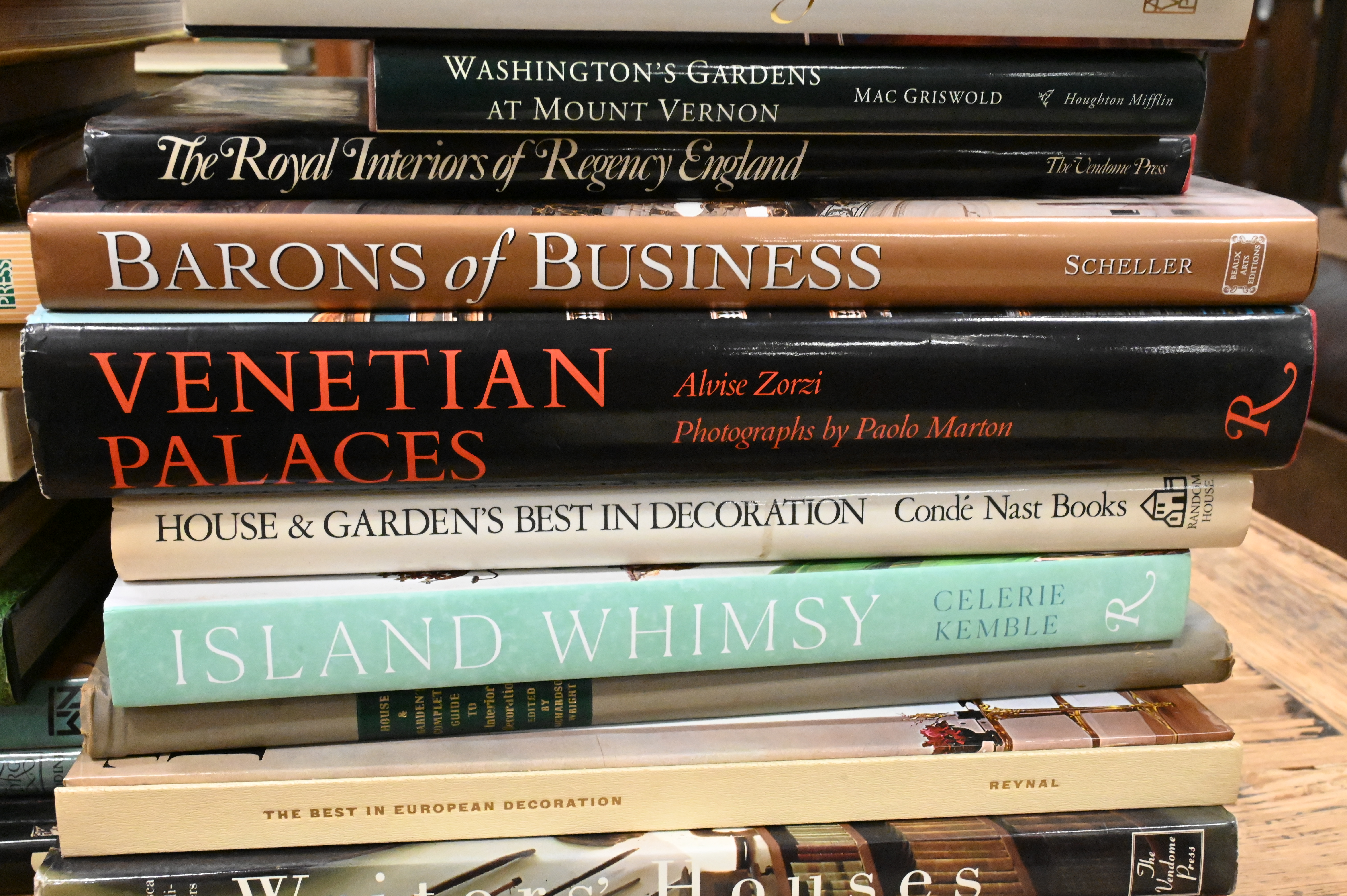 Including David Hicks, On Decoration; American Elegance (Winterthur); Mac Griswold, Washington’s Gardens at Mount Vernon; The Royal Interiors of Regency England; Barons of Business; Alvise Zorzi, Venetian Palaces; House & Garden’s Best in Decoration; Celerie Kemble, Island Whimsy; Writers’ Houses; Slim Aarons, La Dolce Vita; An Irish House; Sixty Years of Interior Design; New York Apartments; The Finest Rooms in France; Christopher Petkanas, At Home in France; Châteaux en Europe; Private Paris; Vogue’s Book of Houses, Gardens & People; The Golden Age of Botanical Art; Irving Penn, Flowers; Bunny Williams, On Garden Style; Kenneth Turner, Flower Style; Collecting & Display; For the King’s Pleasure; and Laura Ashley at Home.