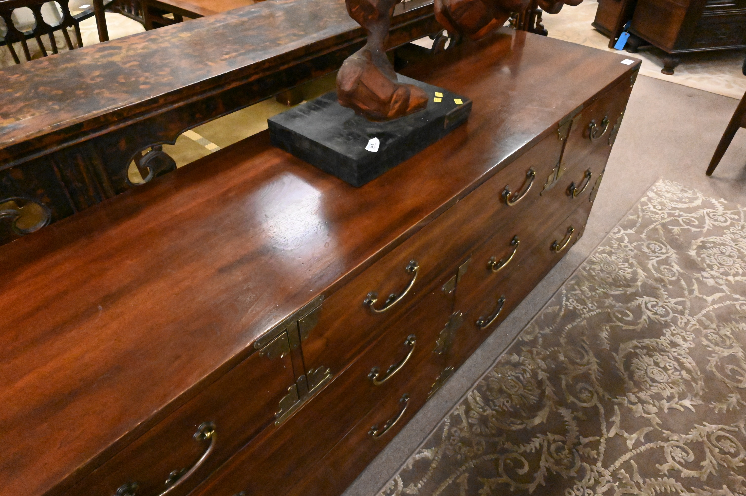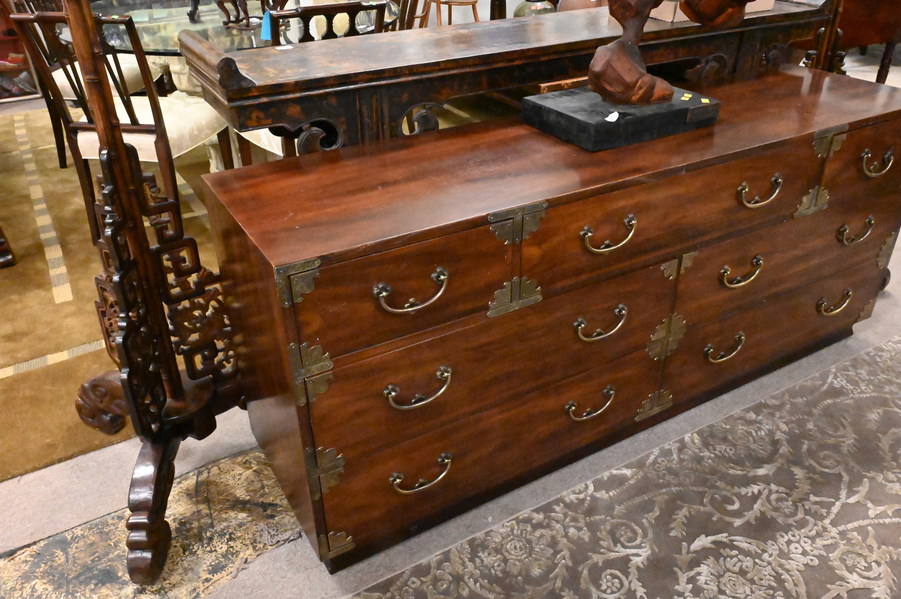 Campaign Style Double Chest, having brass hardware in the oriental taste, height 30 inches, top 72″ x 19″