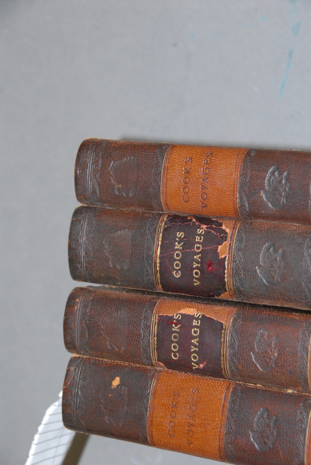 Cook’s Voyages of The Pacific Ocean London 1784, four volumes 1st abbreviated set 370 pages, 359 pages, 400 pages and 310 pages bound in treed calf.