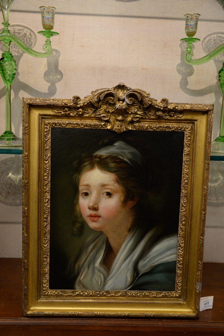 Lot 619: School of Jean-Baptiste Greuze Portrait of a Young Girl oil on canvas unsigned relined 16 x 12 3/4 Provenance: The Est…
