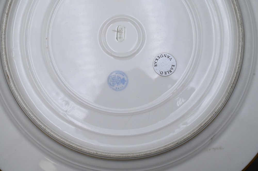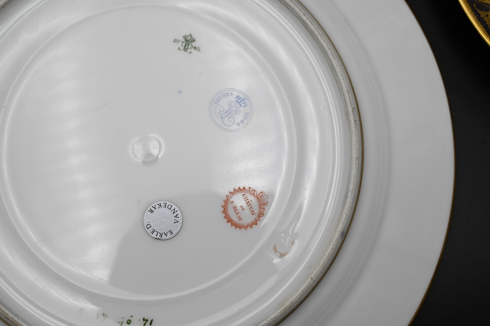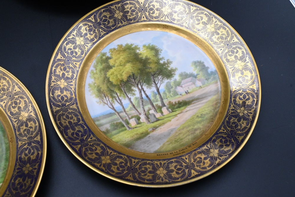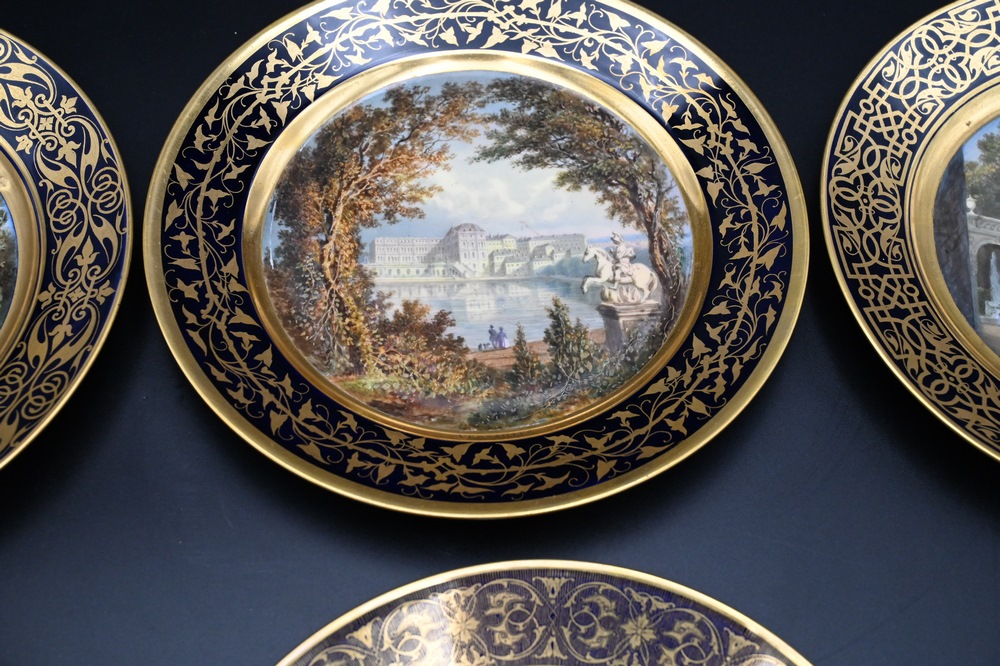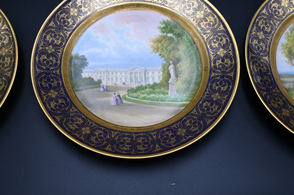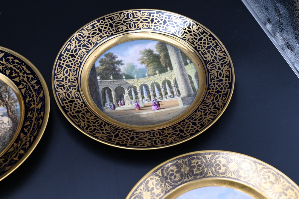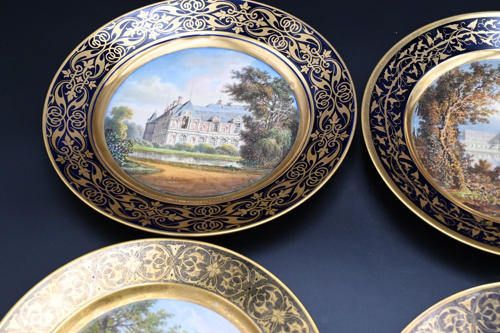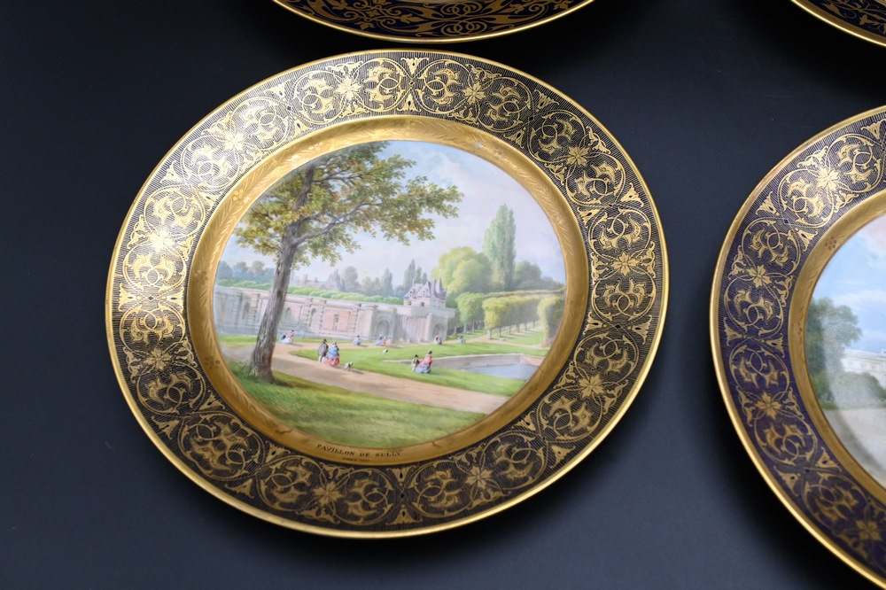 Lot 619: Two Sets of Three Sevres Porcelain Plates, royal blue with gilt border and landscape painted centers, 1844, Chateau De Compiegne, Re…