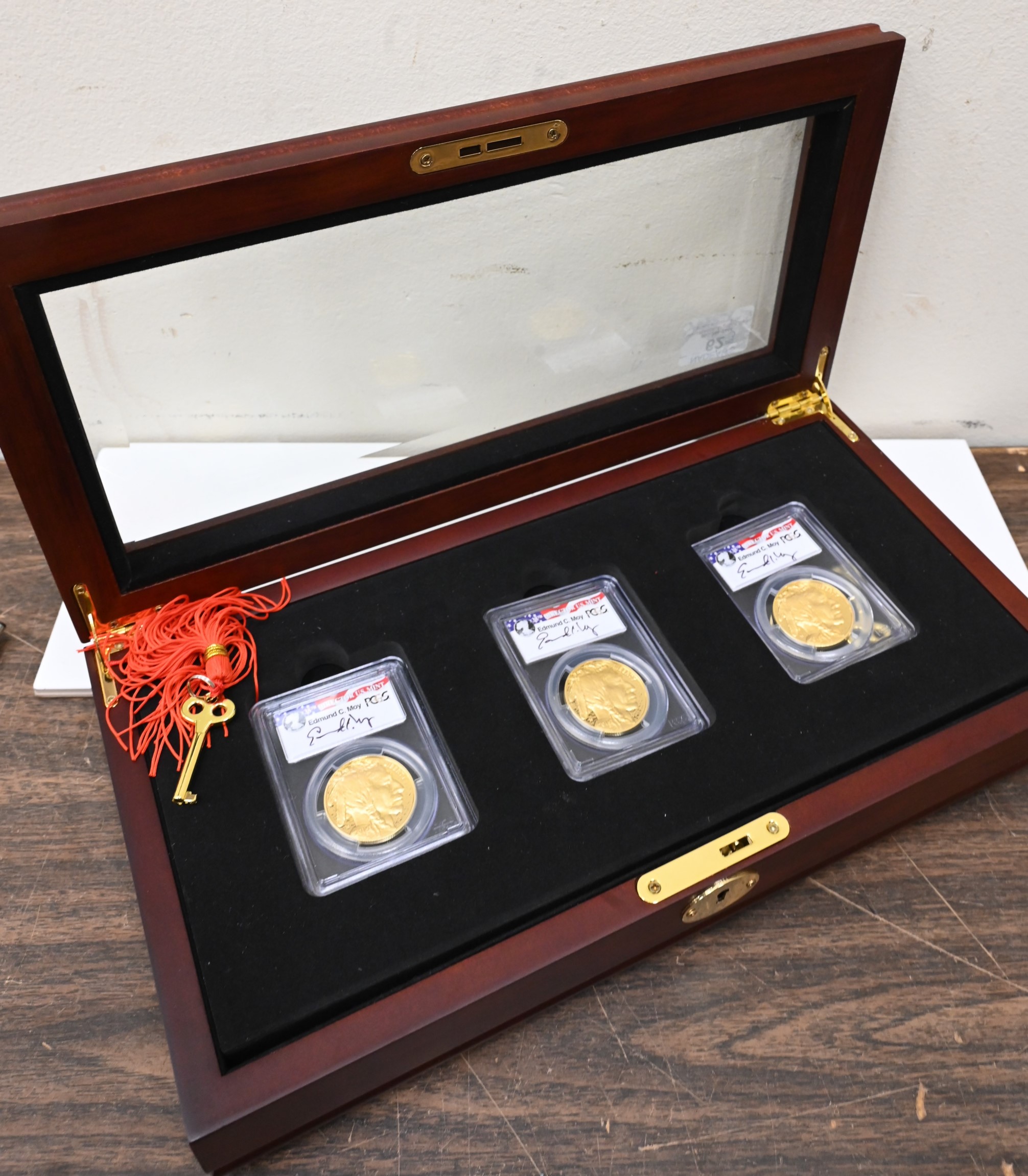 2015W PCGS Proof 70 D Cameo One Ounce $50 Gold Buffalo, in a presentation wood case.