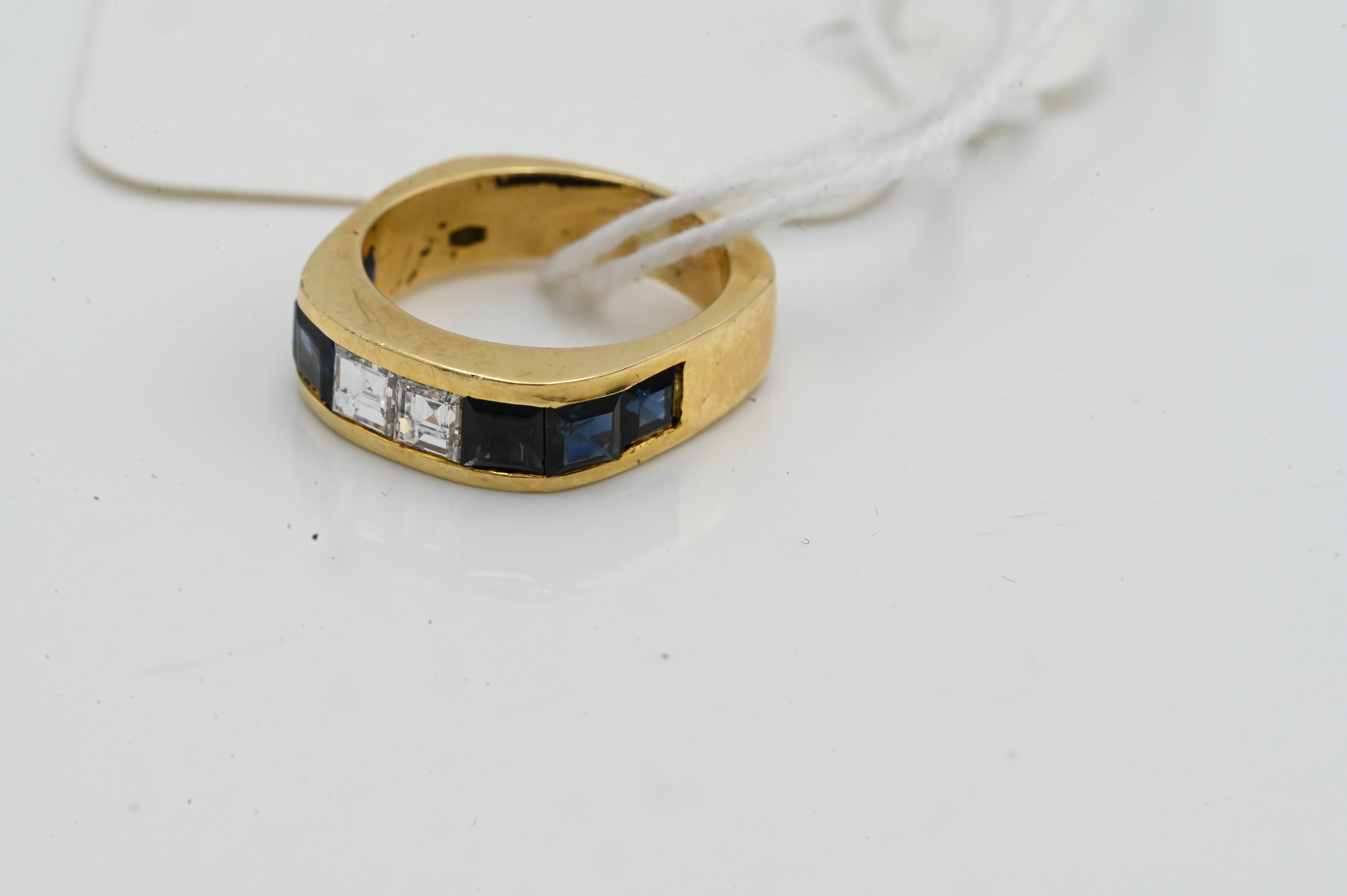18 Karat Yellow Gold Channel Set, having two square cut diamonds flanked by three blue stones on either side, size 4 3/4, 6.7 grams total weight.