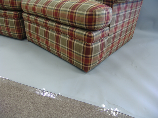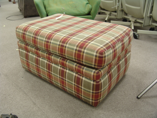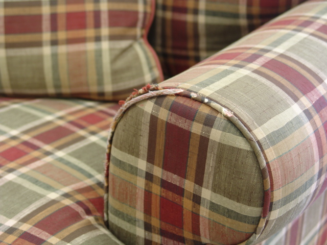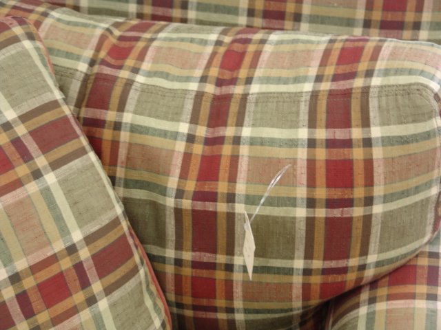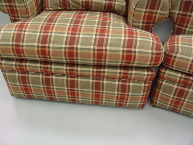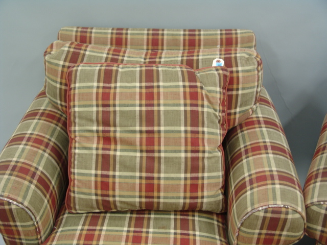 A pair of plaid upholstered easy chairs and one footstool, slight wear on the arms