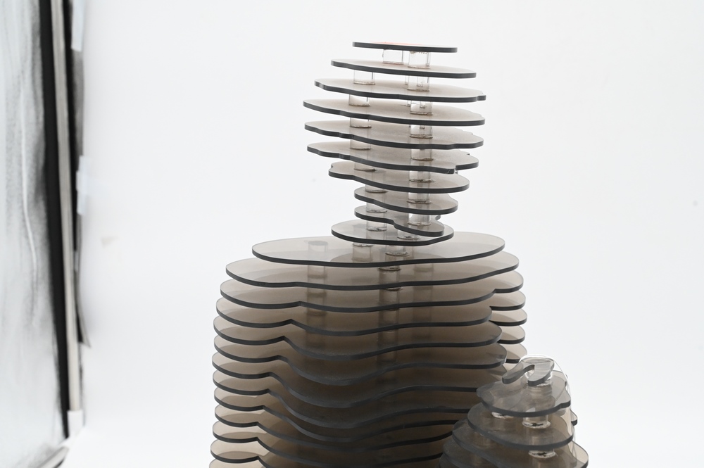 Artist Unknown, Two Layered Plastic Figural Sculptures, tinted gray plastic figures in seated position, unsigned, heights 10.5 and 16 inches.