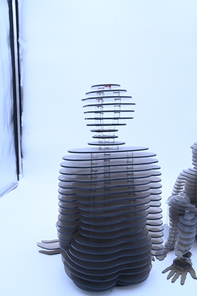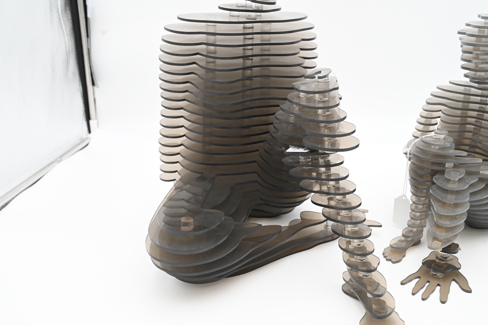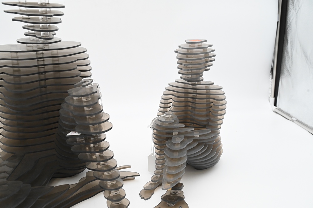 Lot 62: Artist Unknown, Two Layered Plastic Figural Sculptures, tinted gray plastic figures in seated position, unsigned, heights 10.5 and 16 inches.