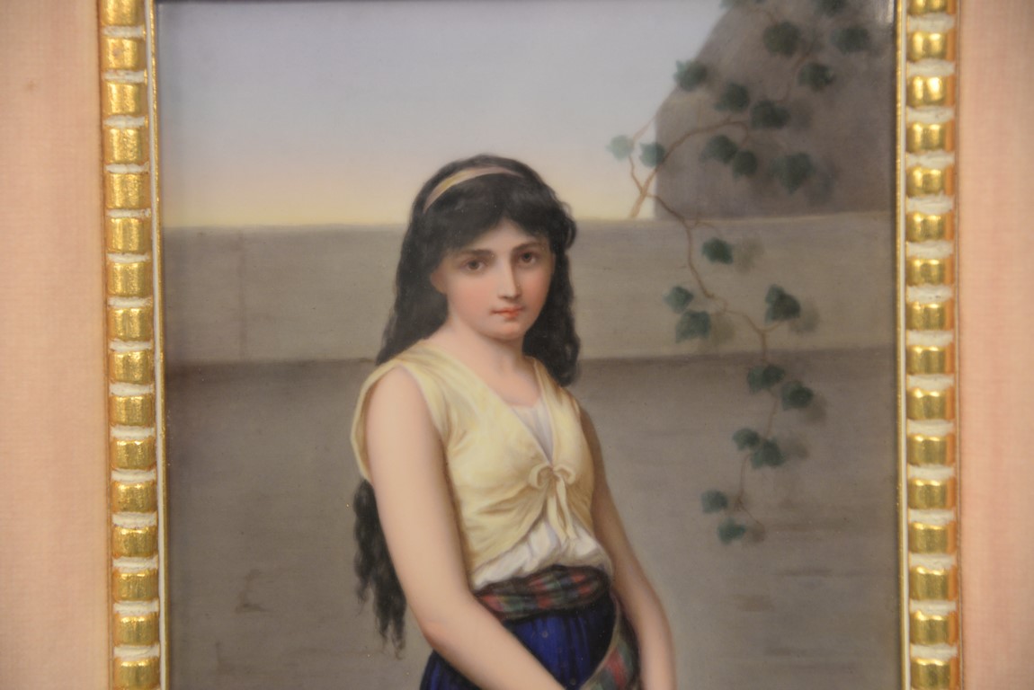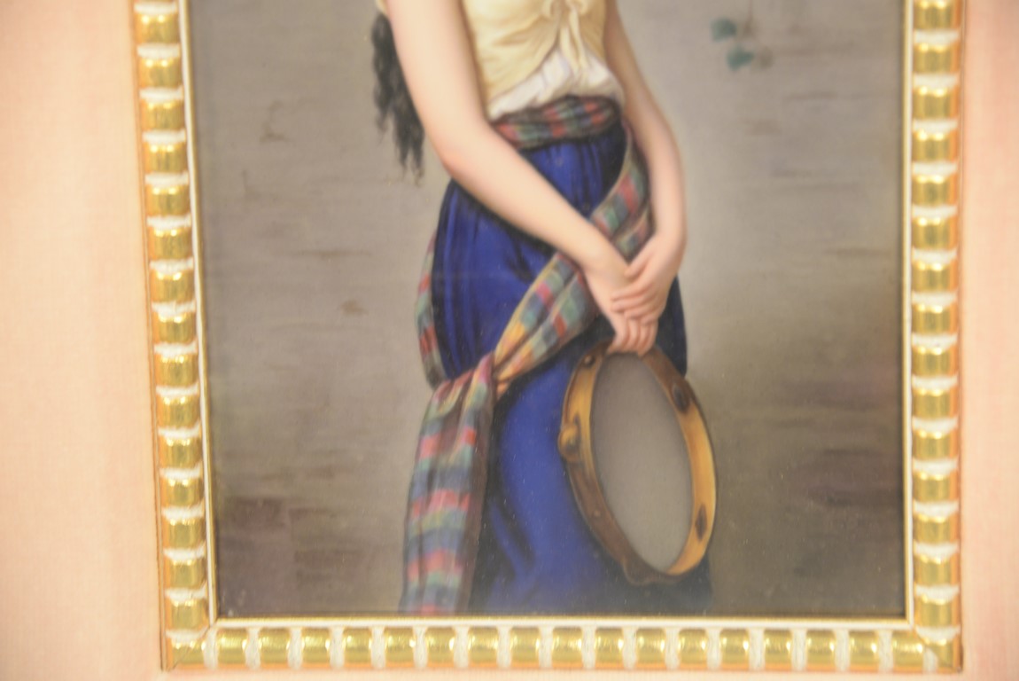 Circle of GEORGE HOM 1838-1911 Mignon oval painting on porcelain depicting a woman with a tambourine marked on back Mignon nach G. Hom 8 3/4 x 5 3/4