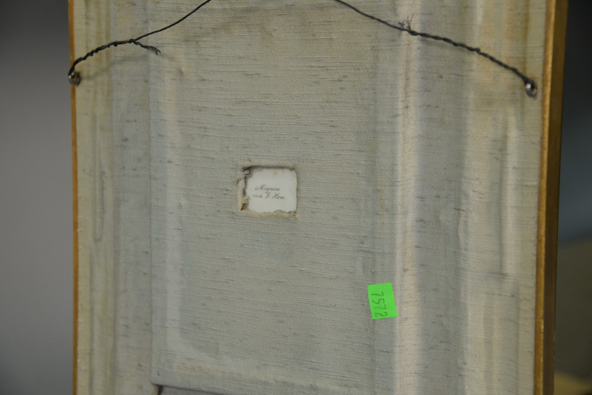 Lot 62: Circle of GEORGE HOM 1838-1911 Mignon oval painting on porcelain depicting a woman with a tambourine marked on back Mignon nach G. Hom 8 3/4 x 5 3/4