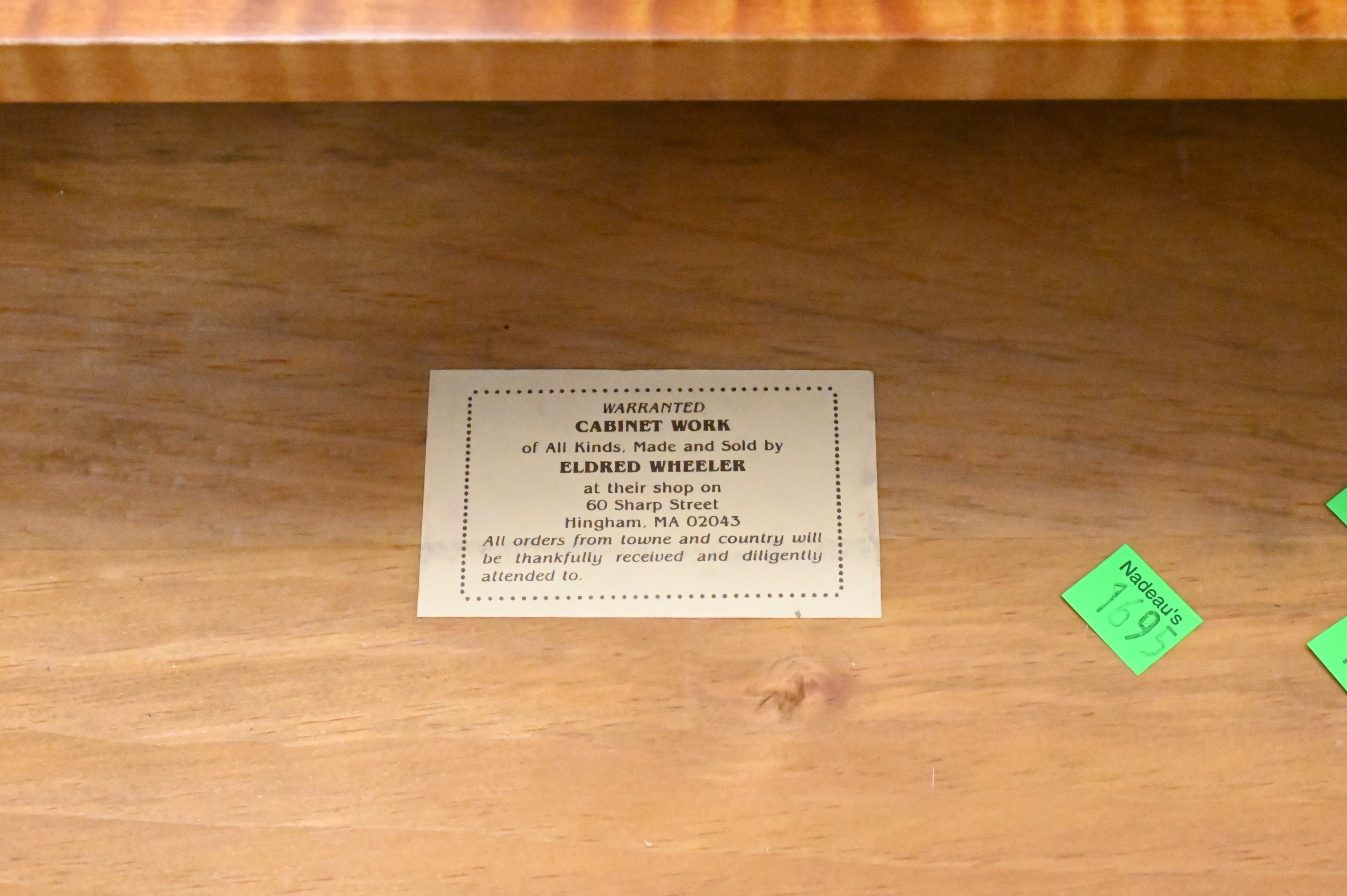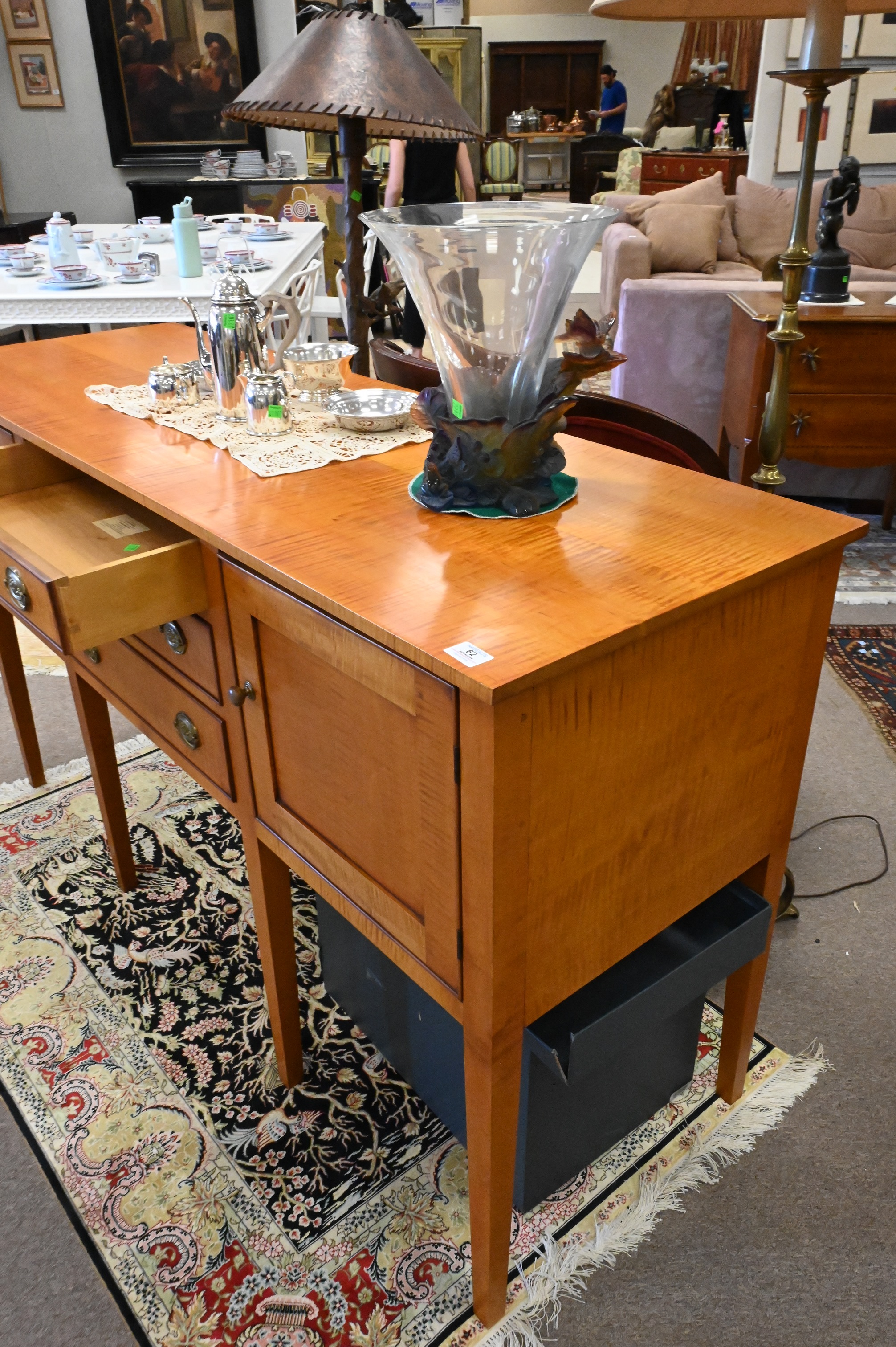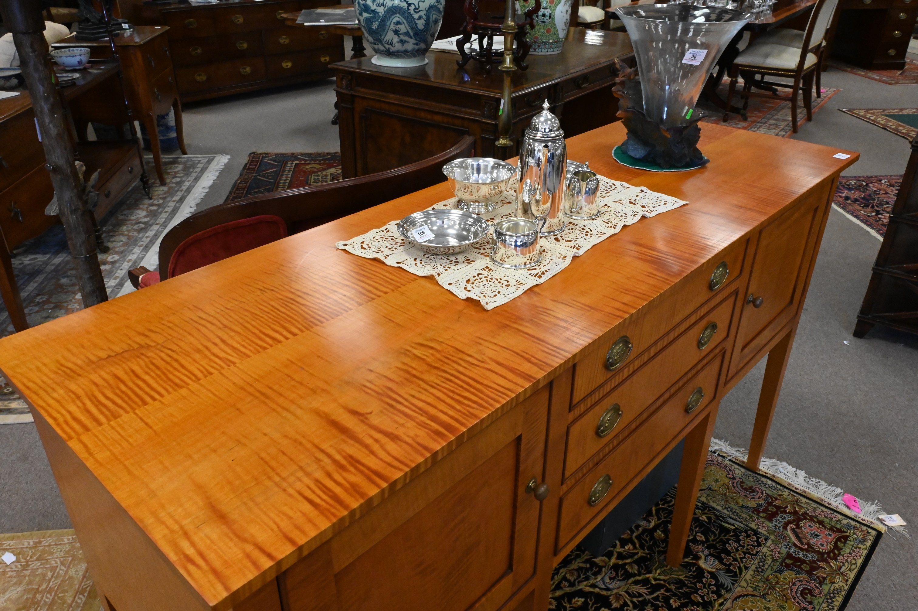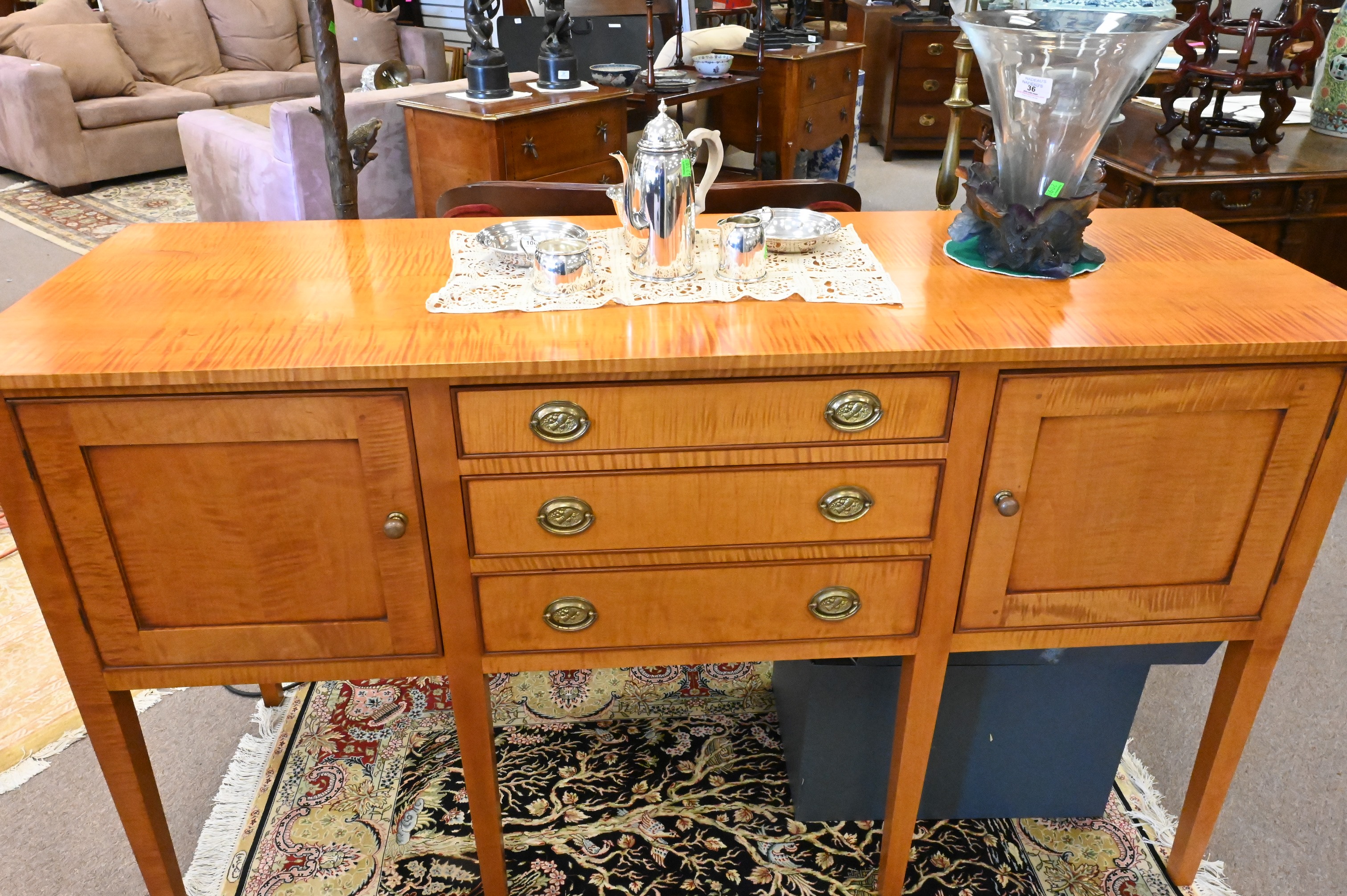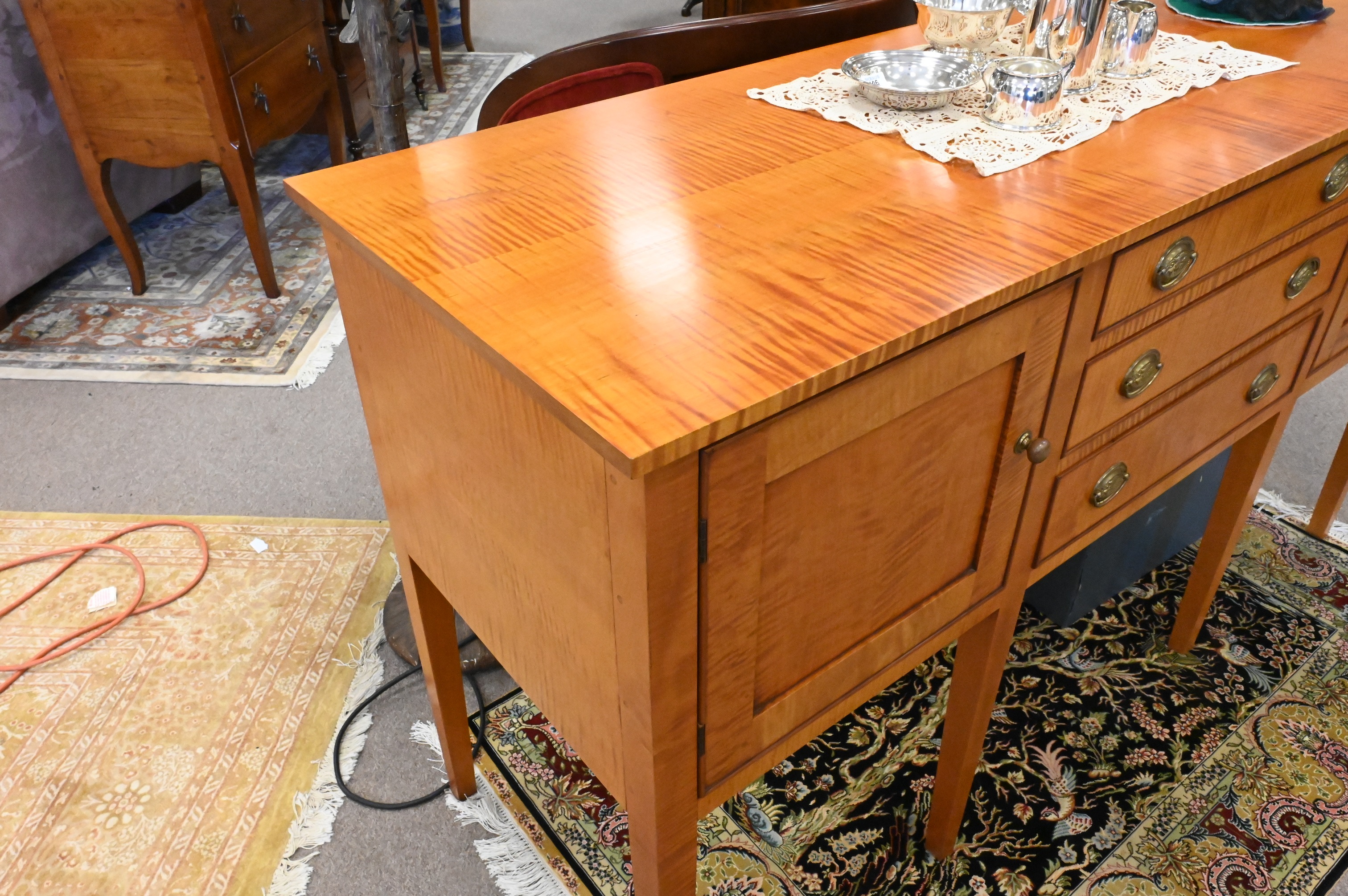 Eldred Wheeler Custom Tiger Maple Federal Style Sideboard, height 37 inches, top 21 1/2″ x 64″
