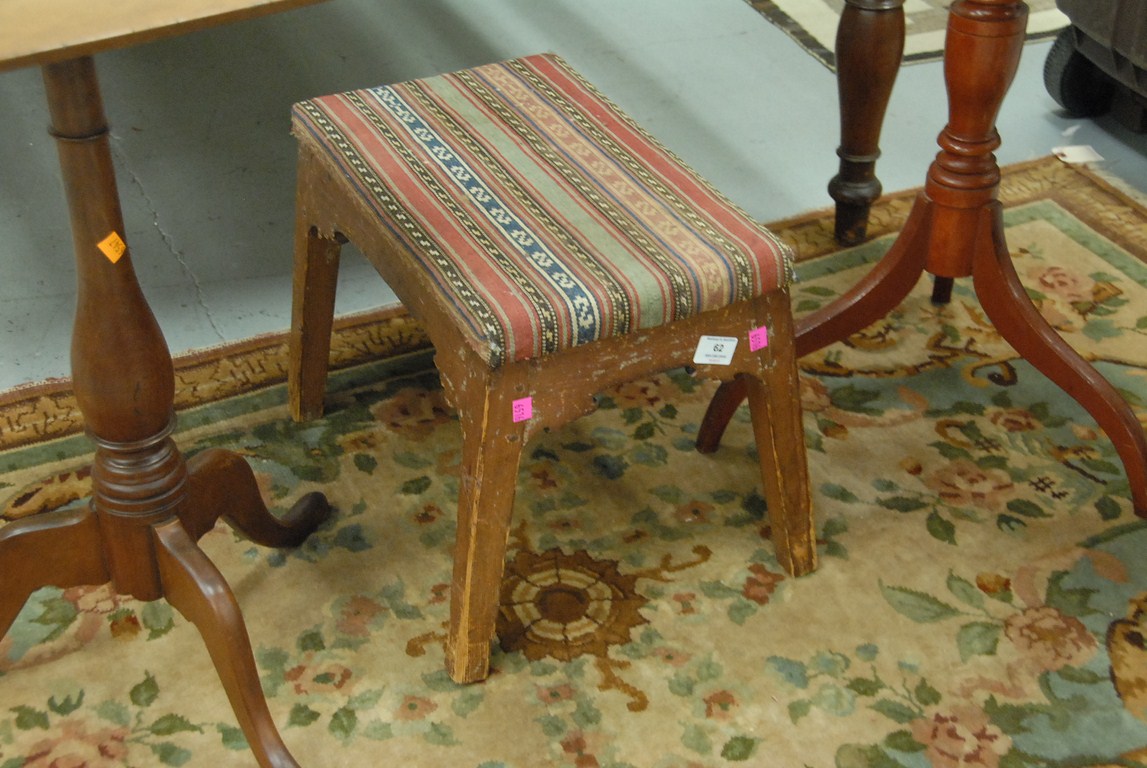 Lot 62: Federal footstool with upholstered top on square tapered legs, circa 1800. ht. 28in. top: 16 1/2 x 17 1/2 & ht. 26in. top: 16 x…