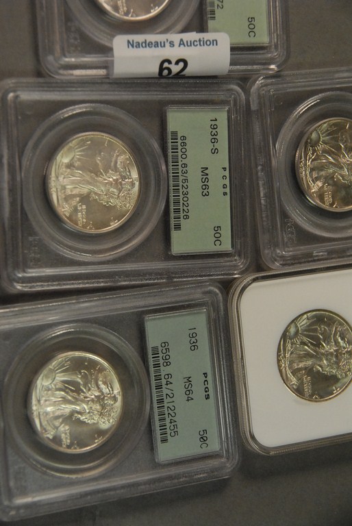 Lot 62: Five half dollars 1936-D PCGS 63, 1936-S PCGS 63, 1936 PCGS 64, 1942 PCGS 64, and 1943-S NGC 64.