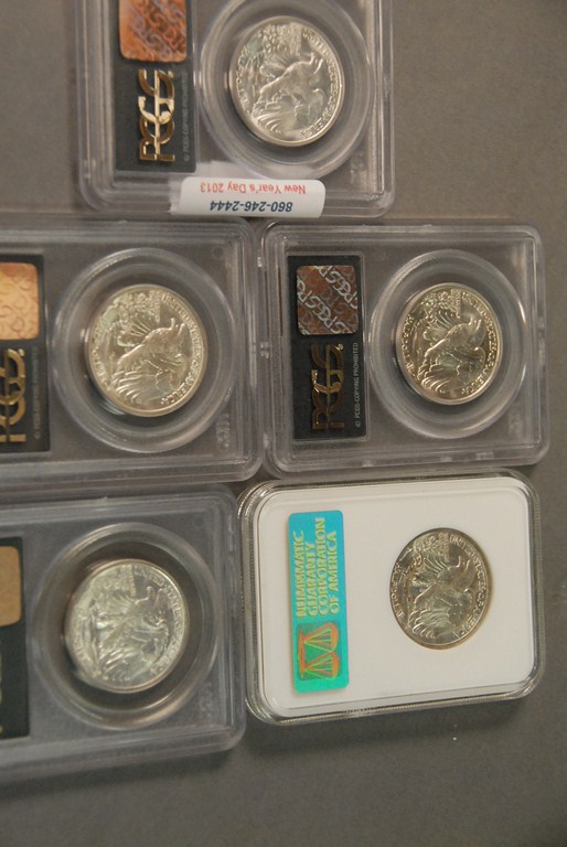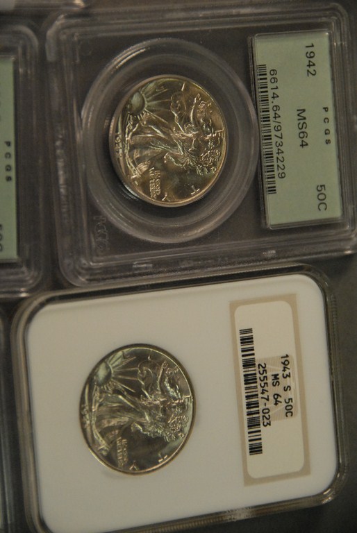 Five half dollars 1936-D PCGS 63, 1936-S PCGS 63, 1936 PCGS 64, 1942 PCGS 64, and 1943-S NGC 64.