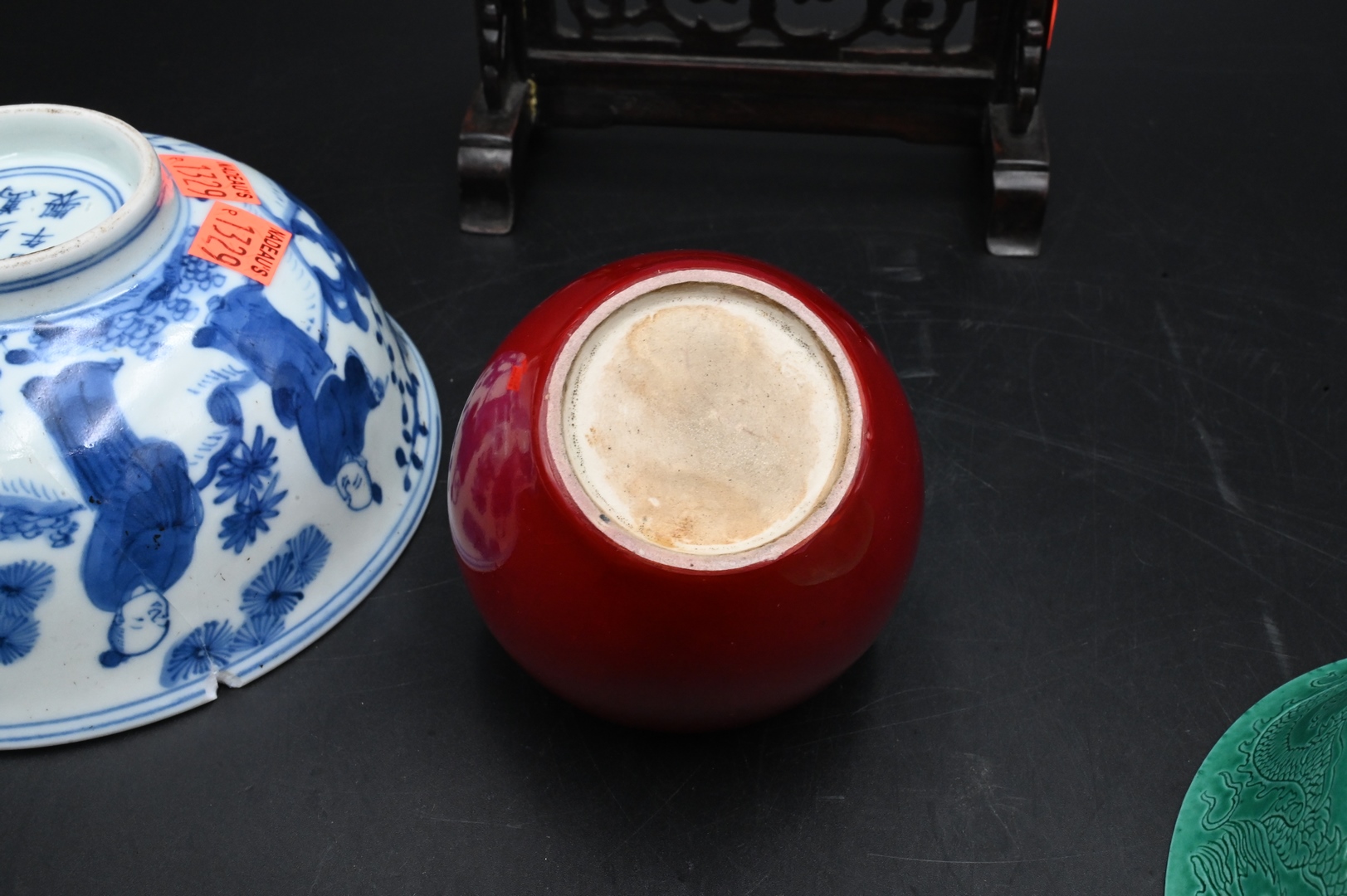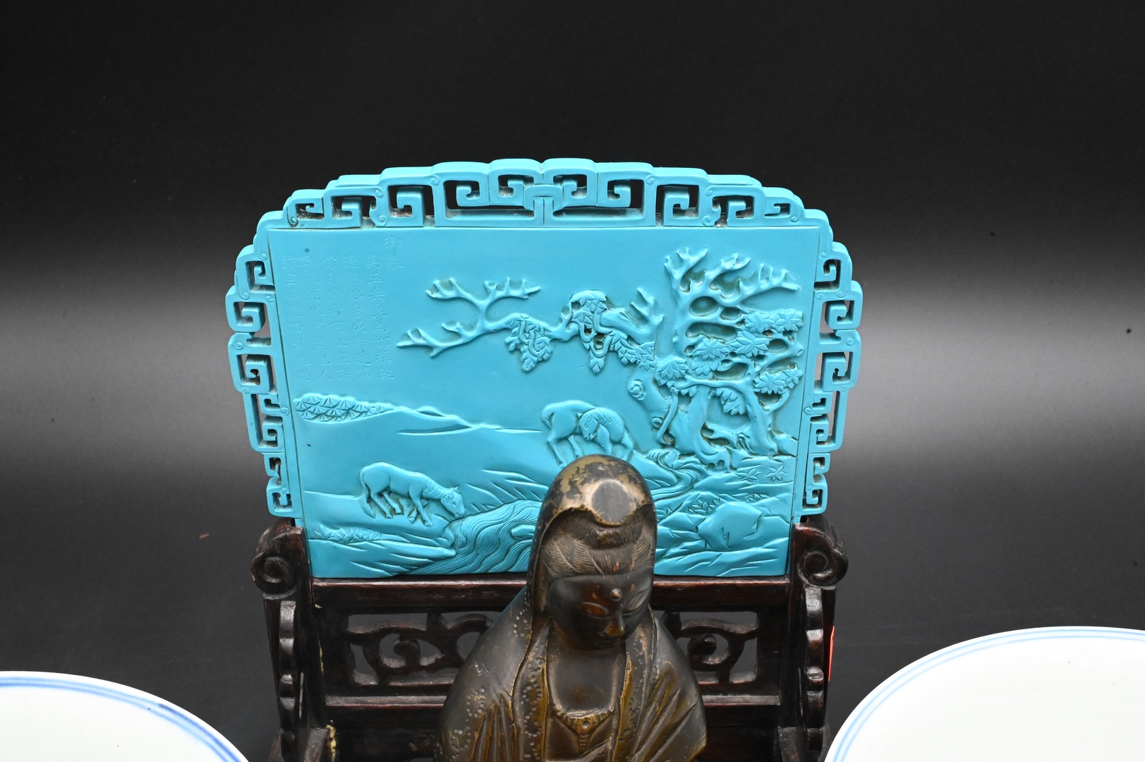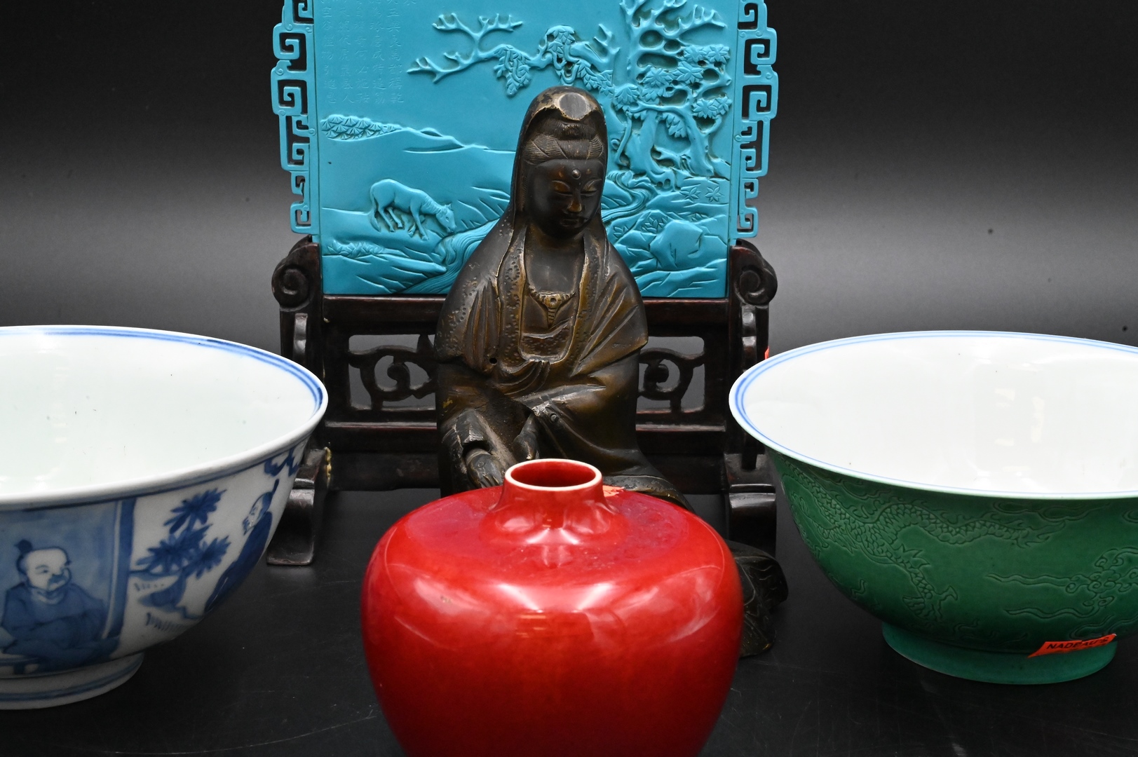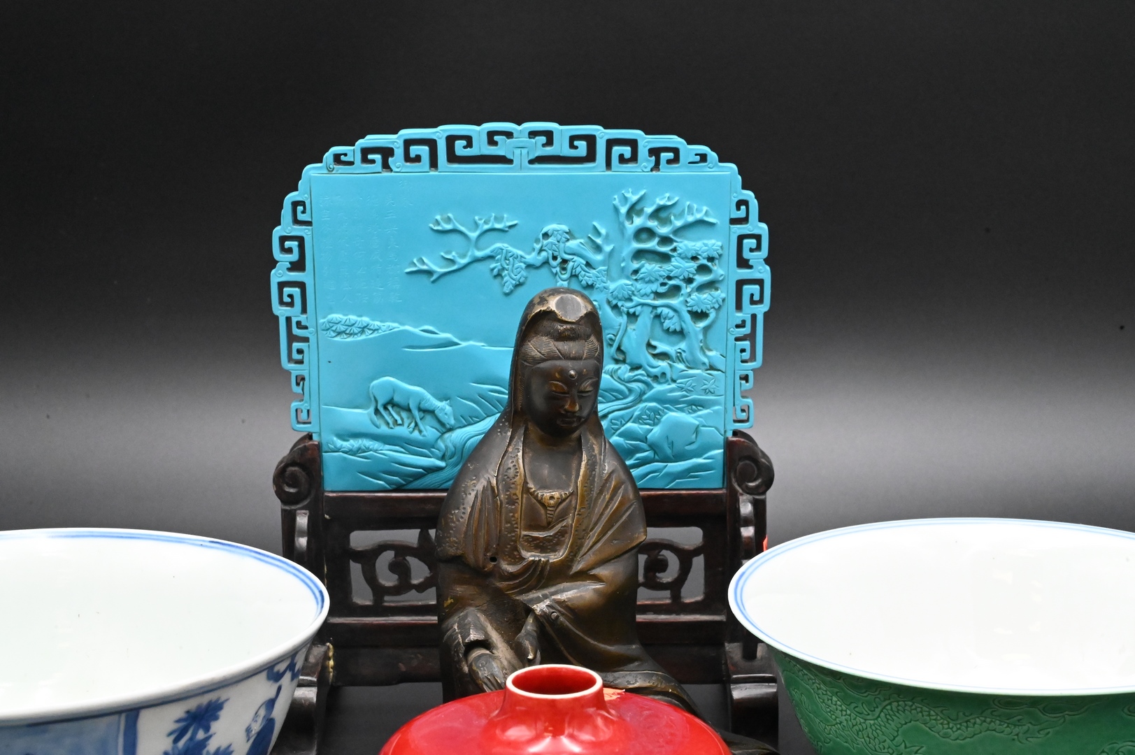 Group of Assorted Chinese Items, to include a small turquoise table screen on stand, a small red glazed bud vase, a bronze Guanyin, a blue and white bowl (repaired), along with a green dragon bowl, tallest height 7 1/2 inches.