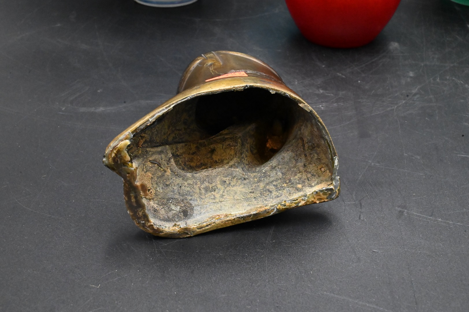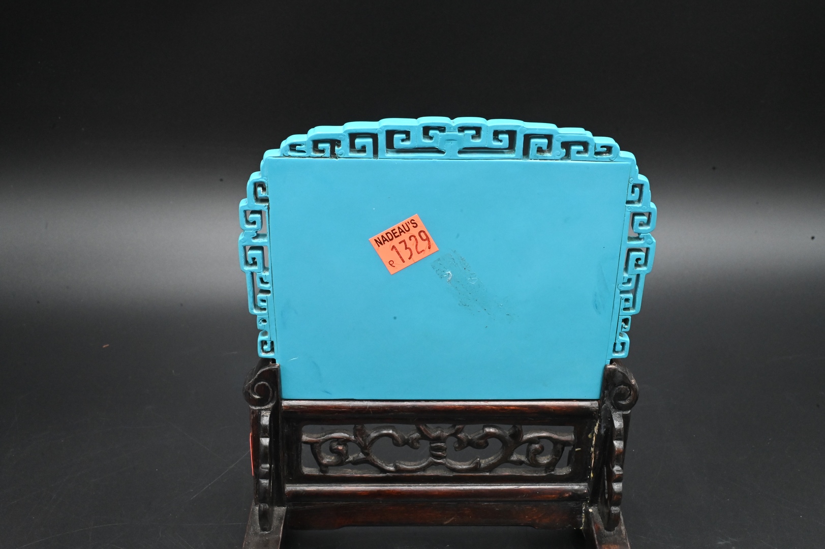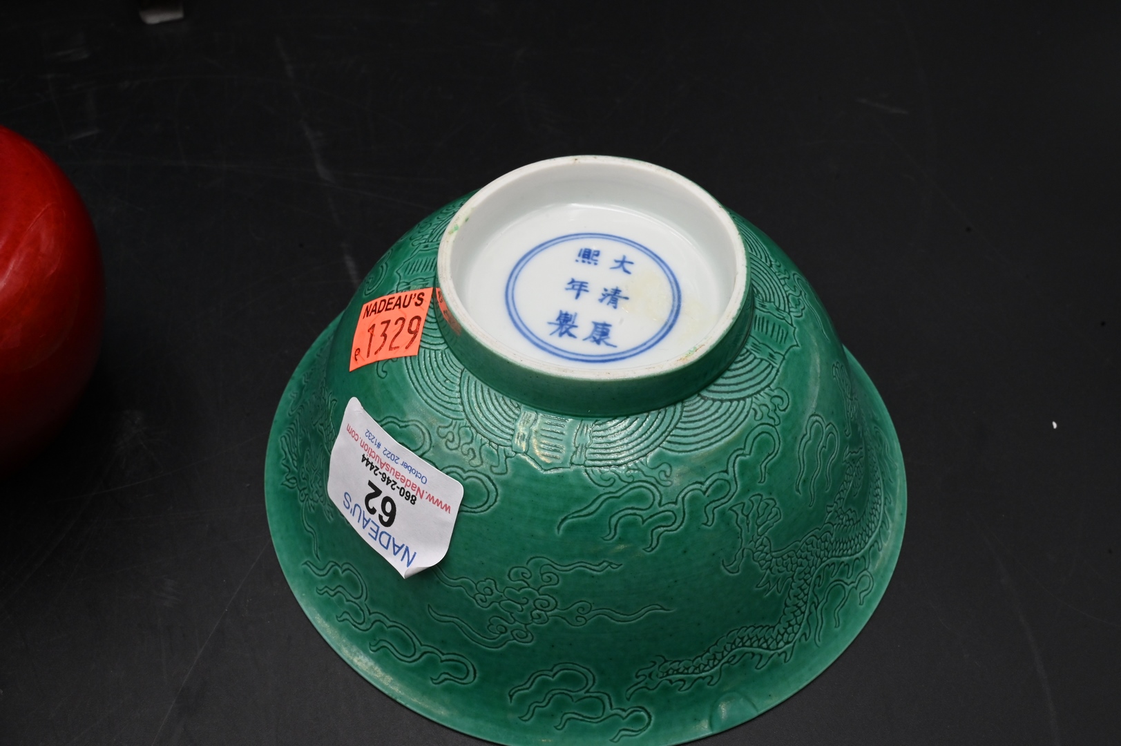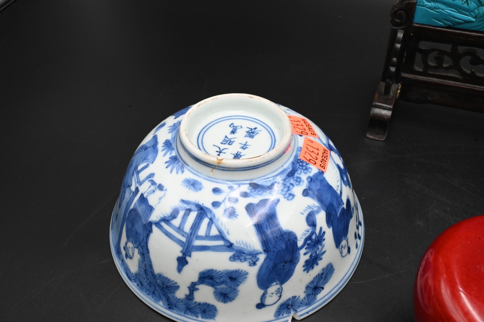 Group of Assorted Chinese Items, to include a small turquoise table screen on stand, a small red glazed bud vase, a bronze Guanyin, a blue and white bowl (repaired), along with a green dragon bowl, tallest height 7 1/2 inches.