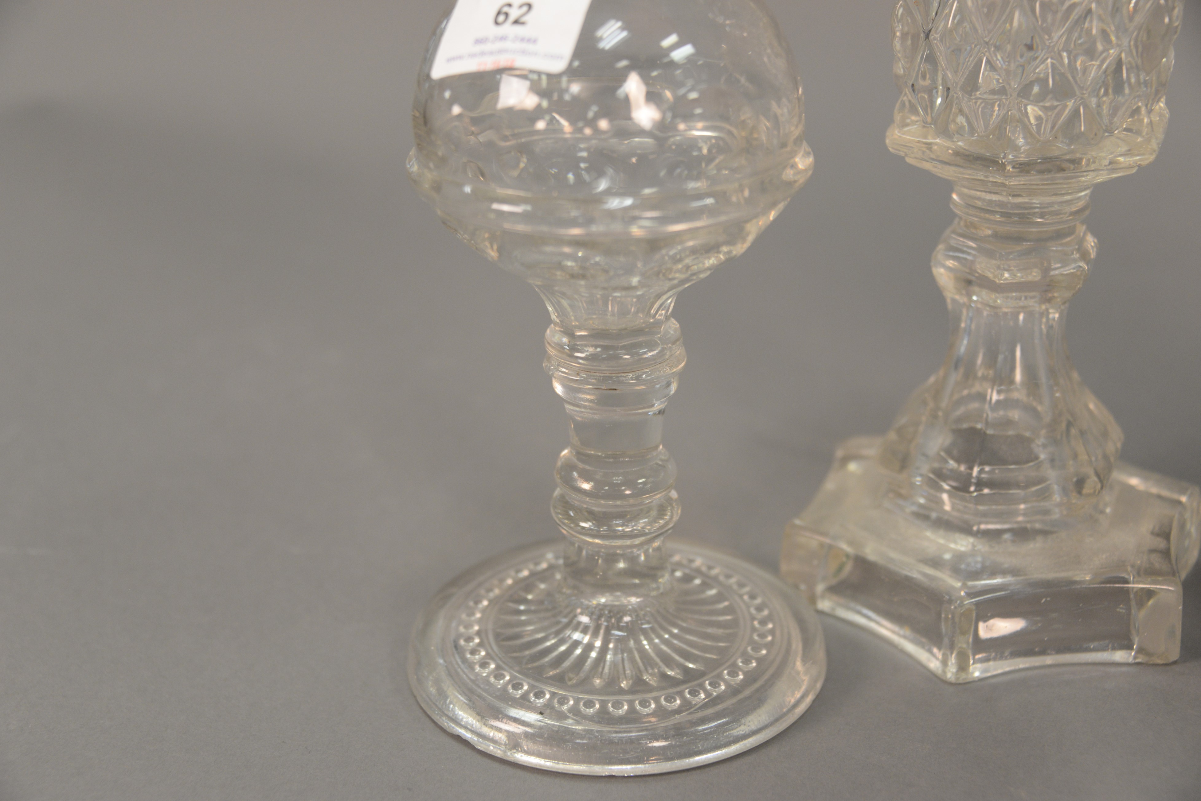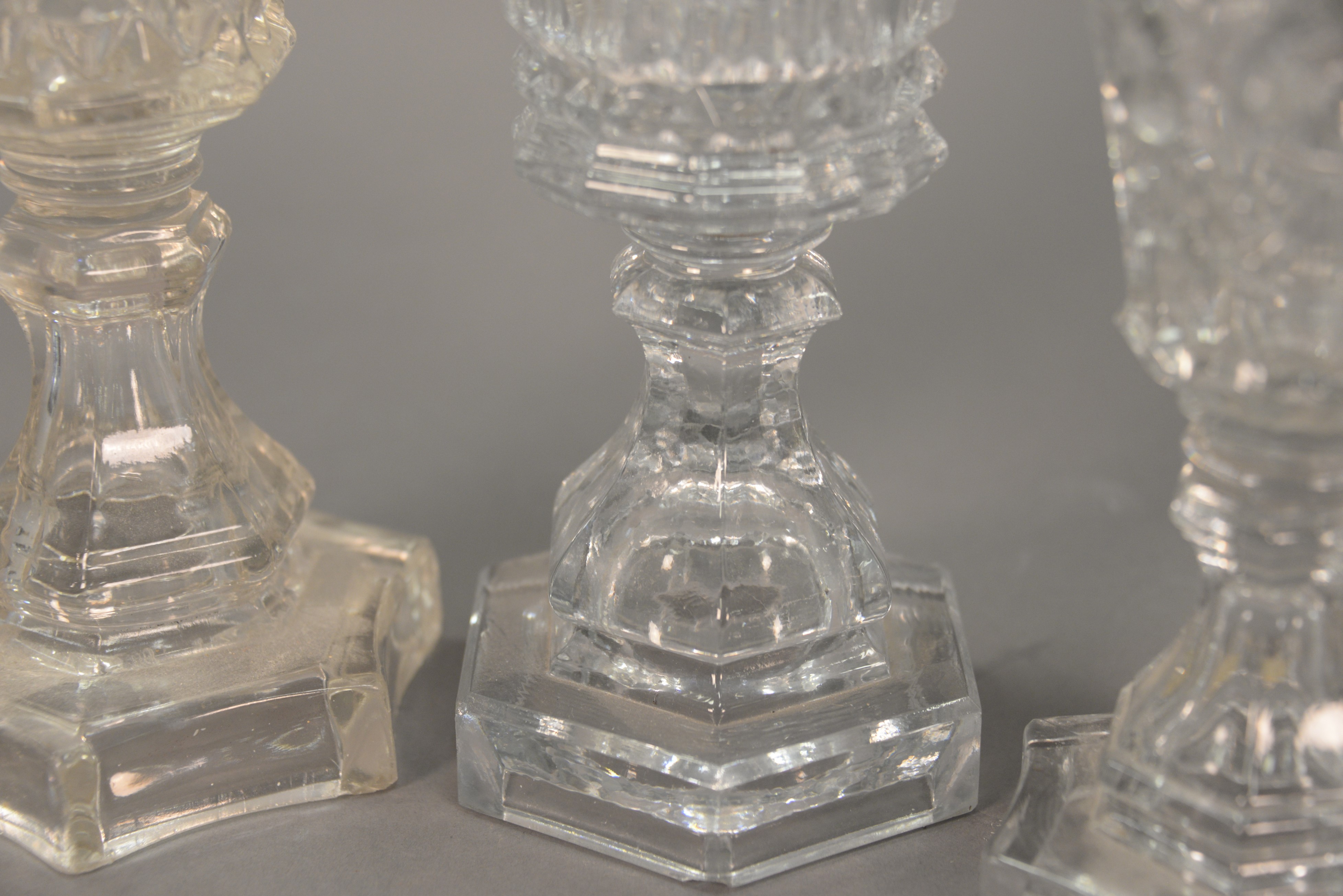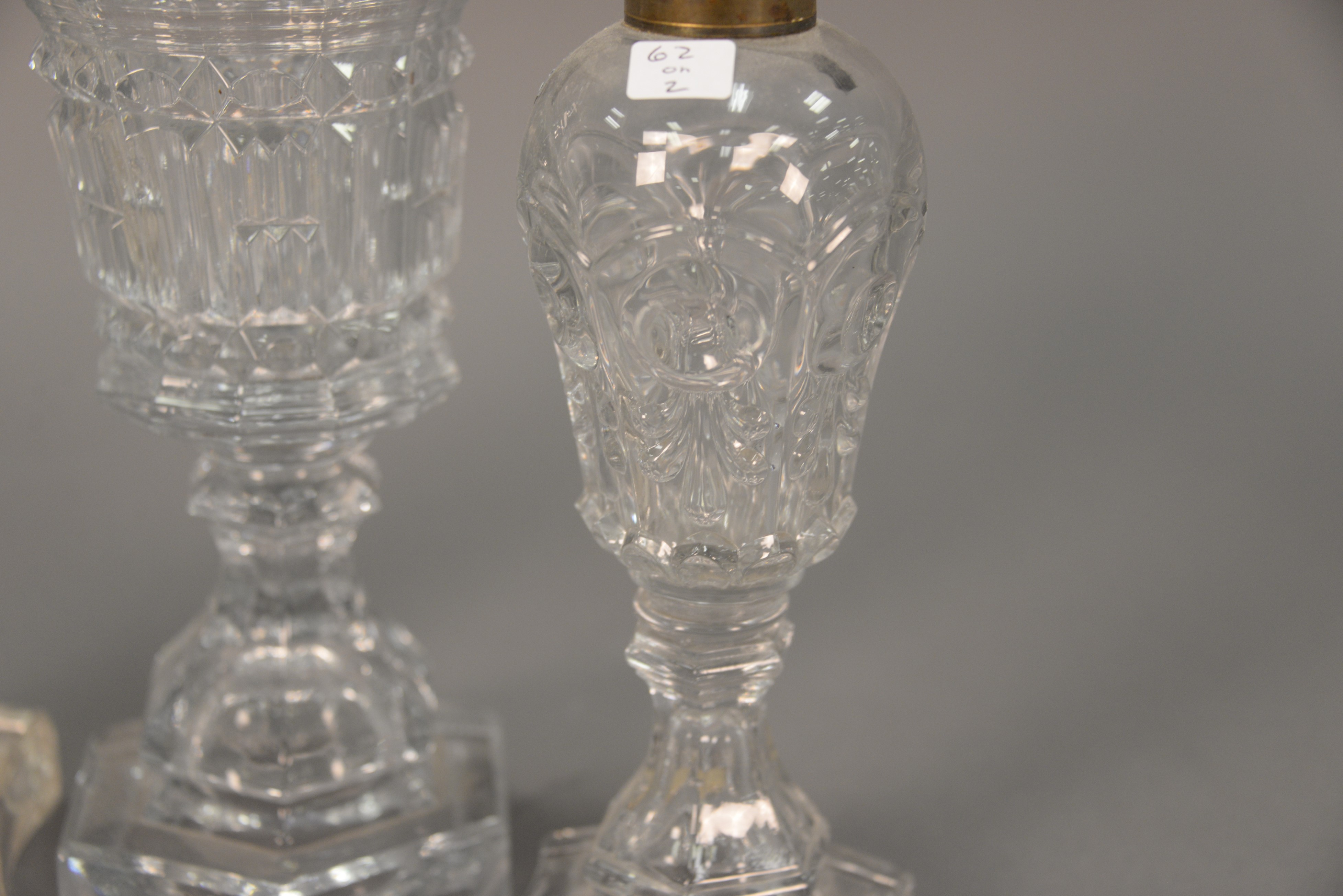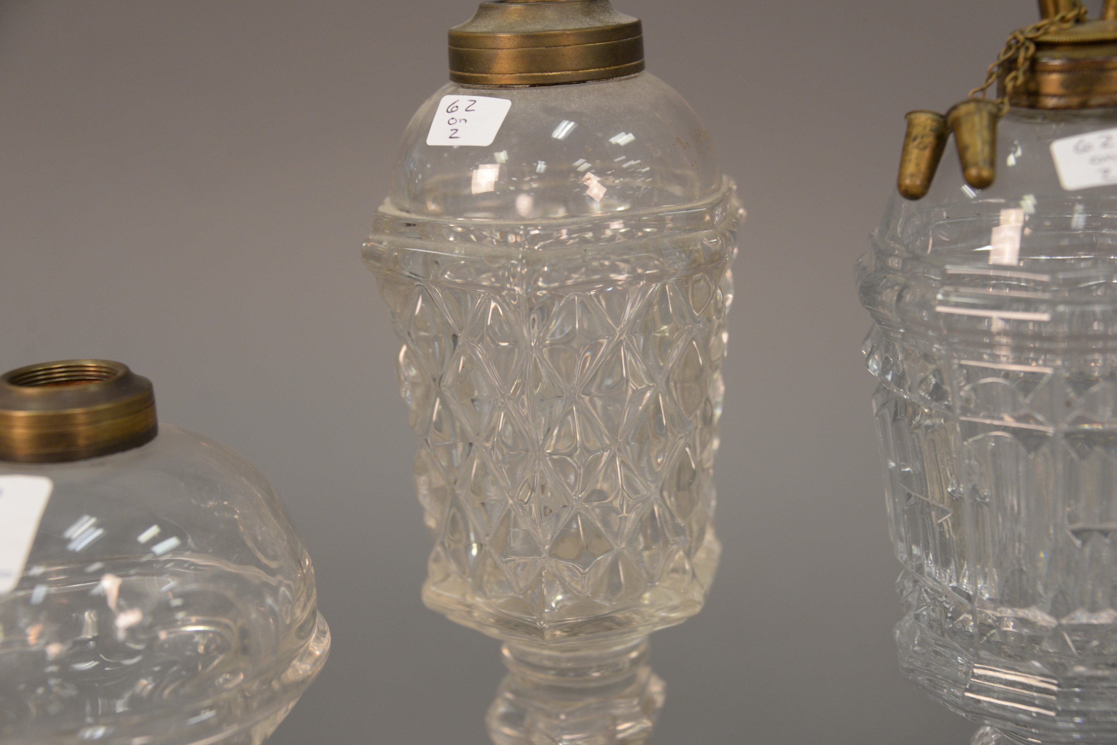 Group of four clear whale oil lamps, sandwich glass and pressed glass. ht. 8 in. to 12 in.