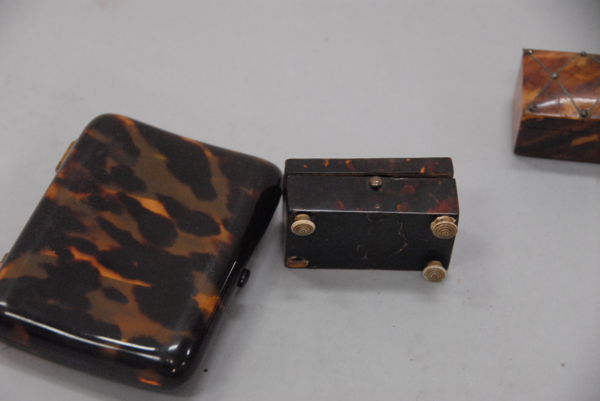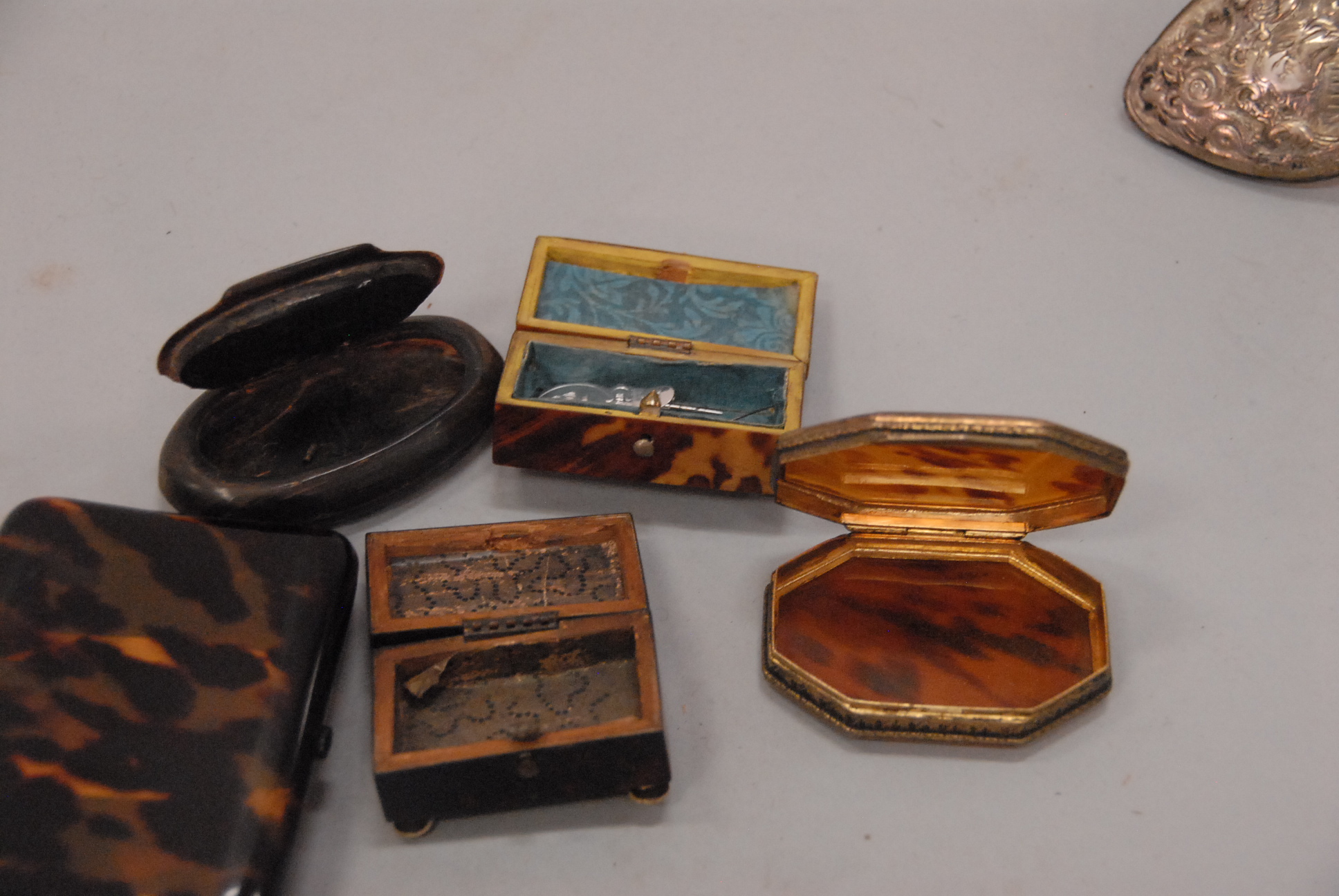 Lot 62: Group of six snuff and cigarette boxes to include four tortoise shell, one horn, and one trimmed in Continental silver one foot missing.