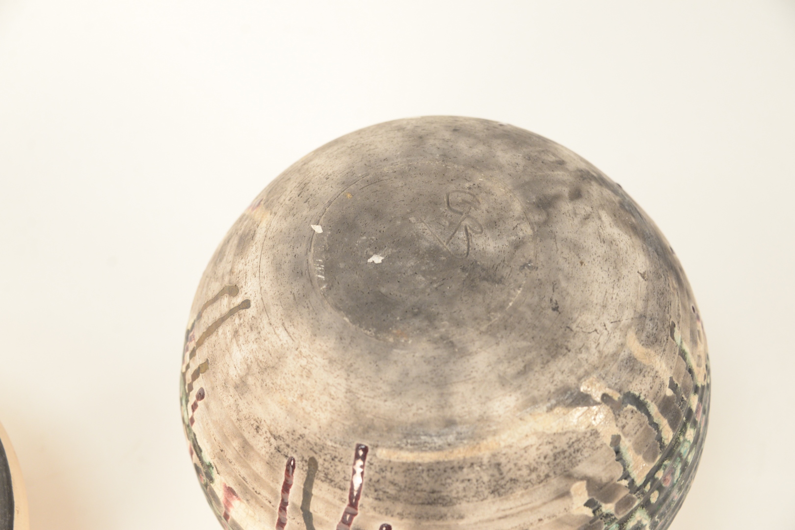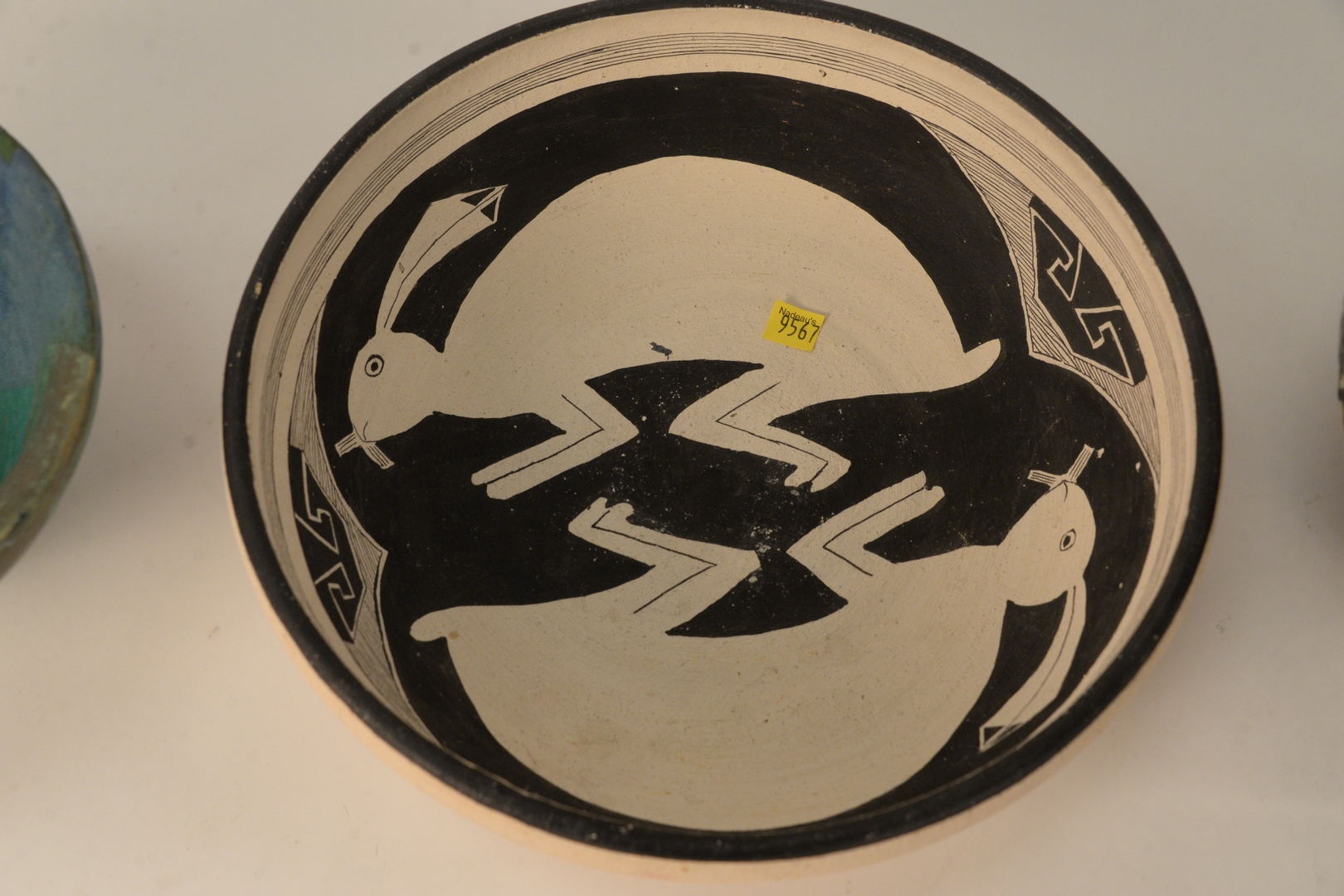 Group of Three Assorted Ceramic Bowls, to include one green and blue glazed; one done in black and white style with rabbits; and one glazed, initialed CB on bottom, height 9 inches, diameter 12 1/2 inches.