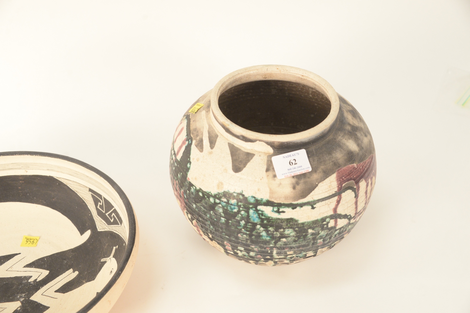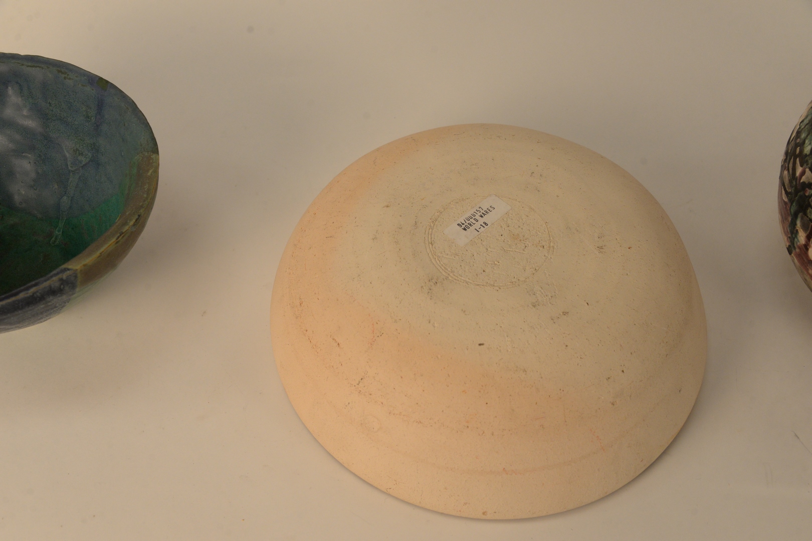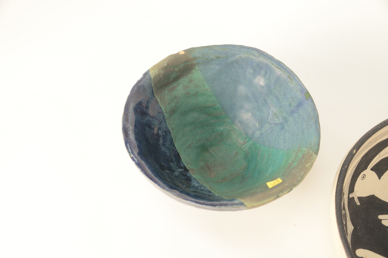 Lot 62: Group of Three Assorted Ceramic Bowls, to include one green and blue glazed; one done in black and white style with rabbits; and one glazed, initialed CB on bottom, height 9 inches, diameter 12 1/2 inches.