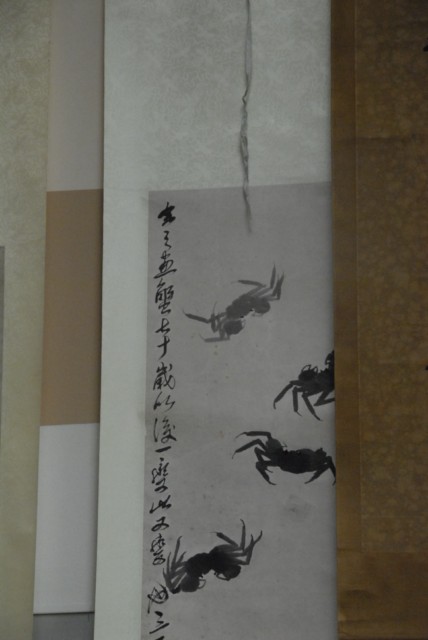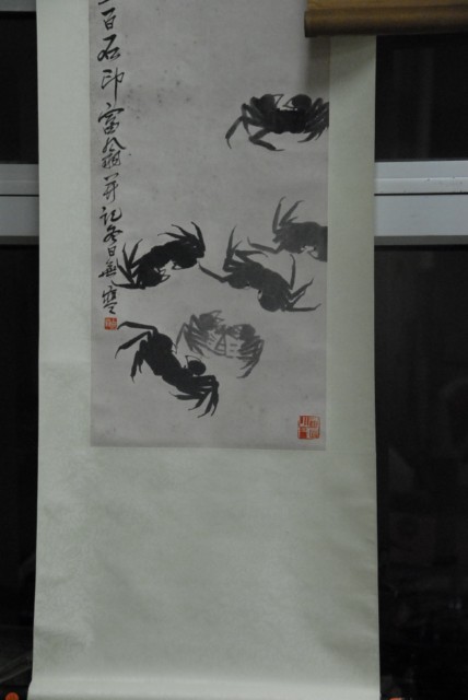 Oriental black and white scroll of characters and crabs, artist Qi Bai Shi
