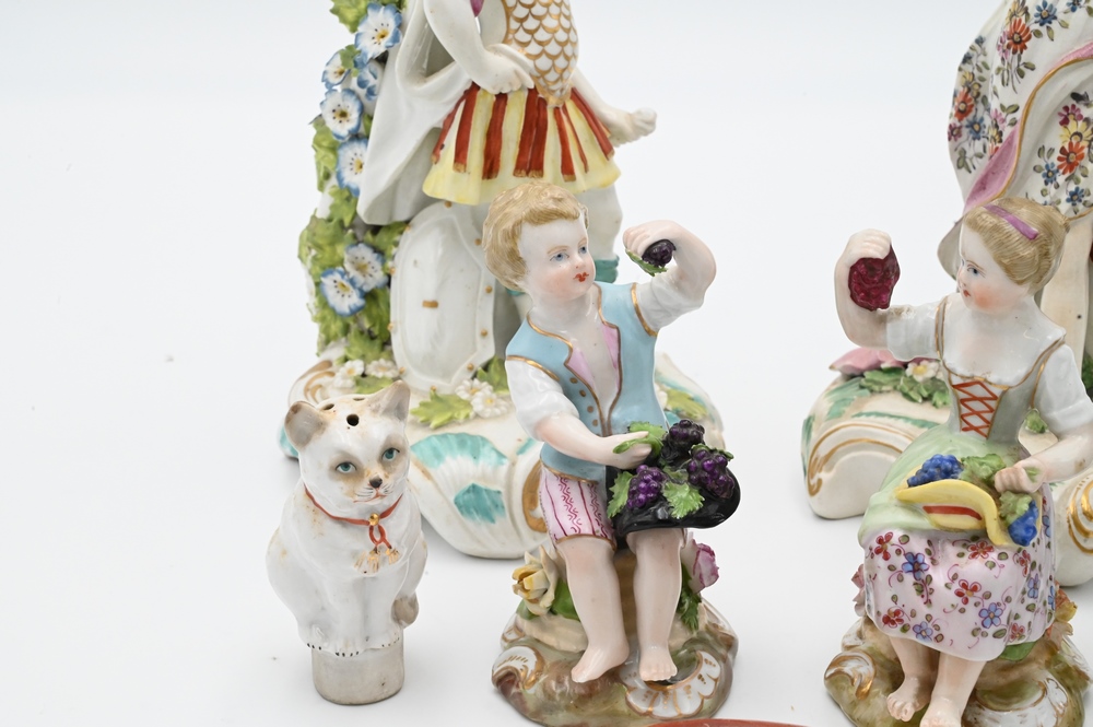 Seven Piece Porcelain Group, to include two cat shakers or bottle stops; a pair of figural candlesticks, height 10 3/4 inches.