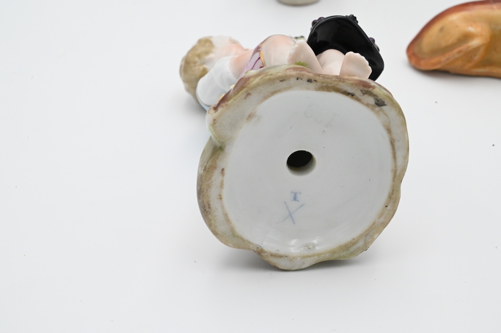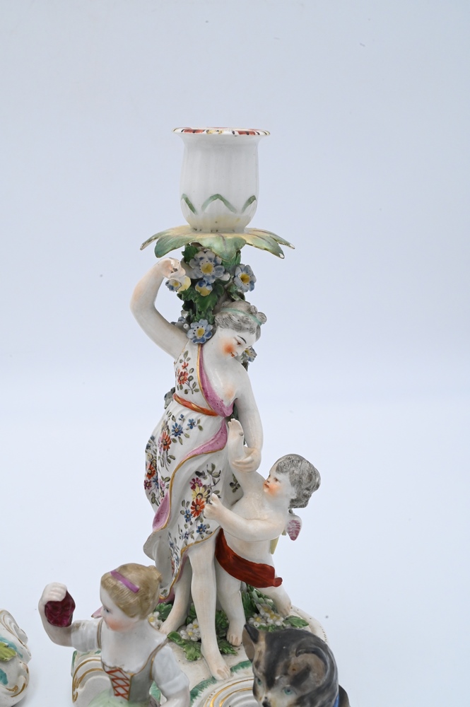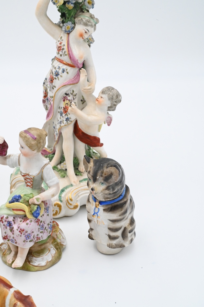 Lot 62: Seven Piece Porcelain Group, to include two cat shakers or bottle stops; a pair of figural candlesticks, height 10 3/4 inches.