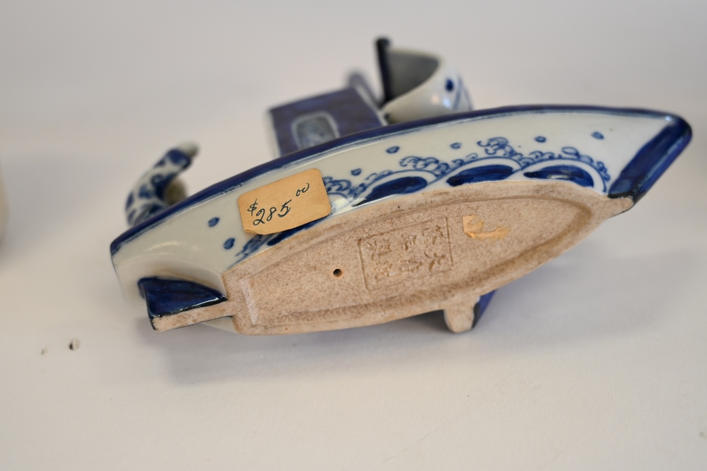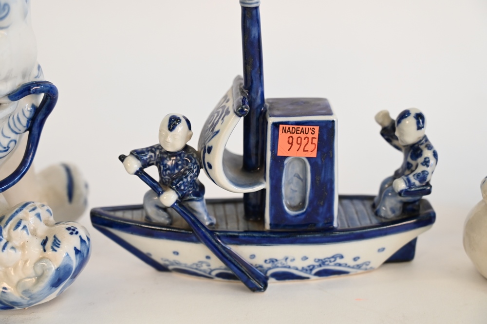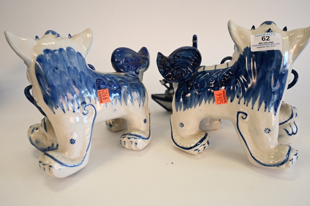 Lot 62: Three Piece Chinese Lot, to include pair of blue and white foo dogs along with a blue and white porcelain boat with figures, foo dog height 8 inches, boat height 6 1/2 inches.