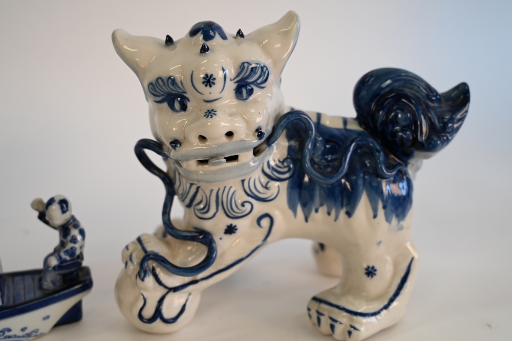 Three Piece Chinese Lot, to include pair of blue and white foo dogs along with a blue and white porcelain boat with figures, foo dog…