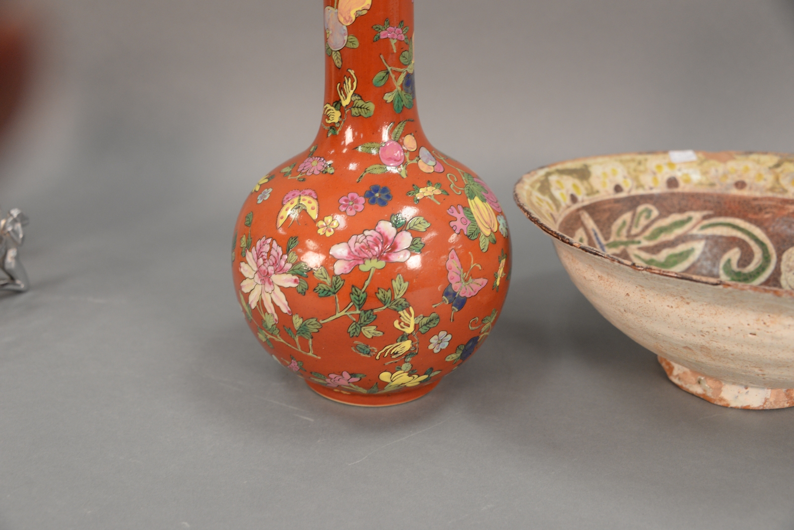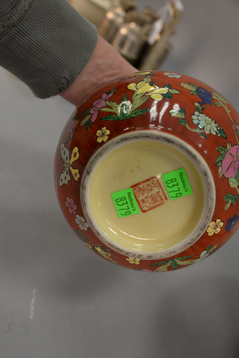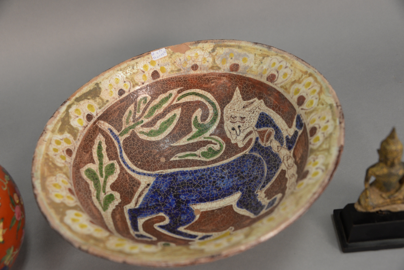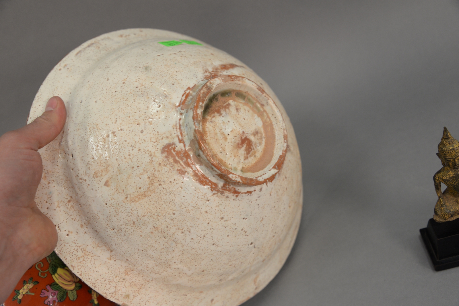 Lot 62: Three piece group to include Archaic Asian figure, porcelain globular vase with seal mark on bottom, and a red clay bowl paint decor…
