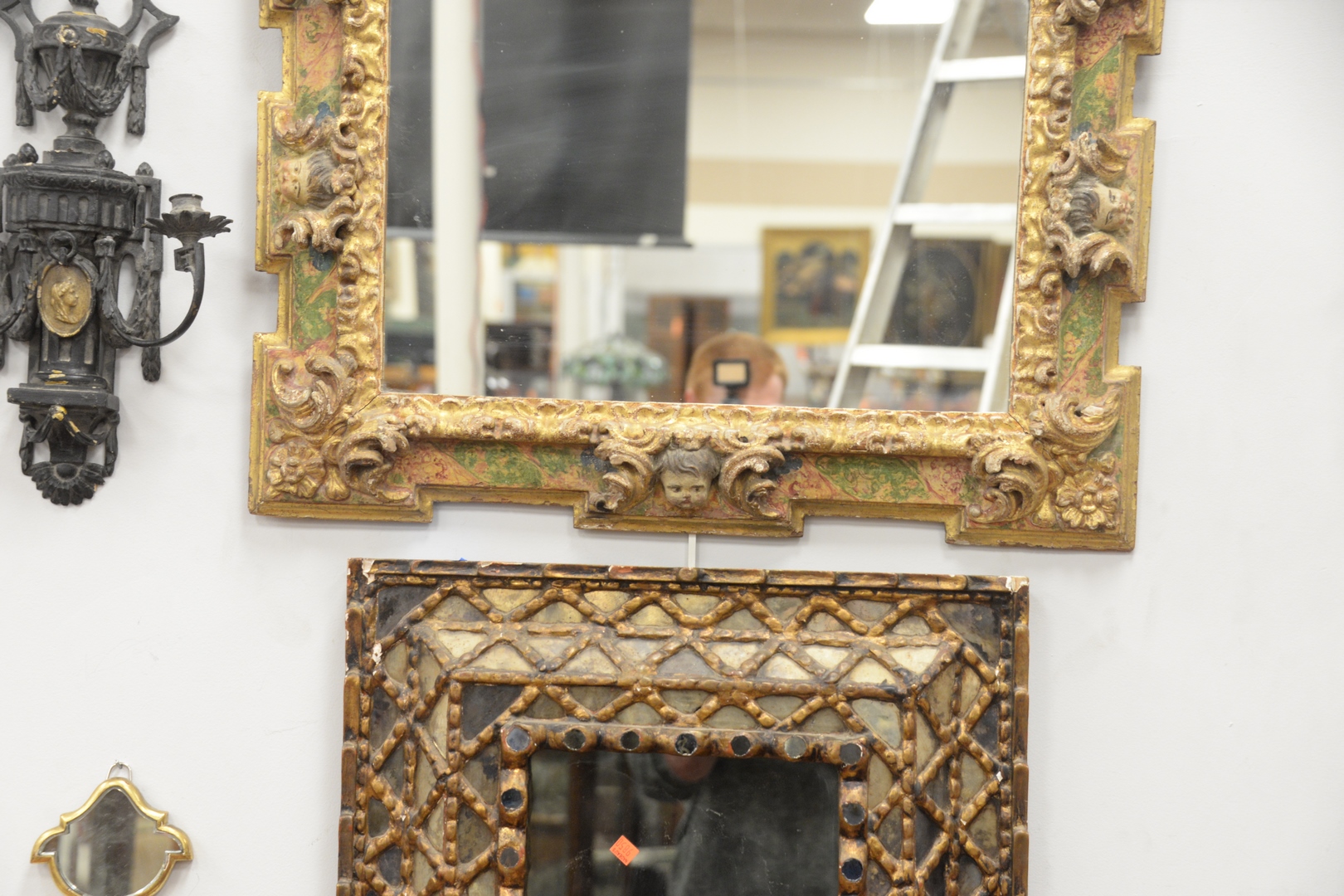 Two Continental Framed Mirrors, to include one rectangle with gilt basket style frame, 28 x 34 the other rectangle having painted and gilt frame with putti figures, 24 x 31.