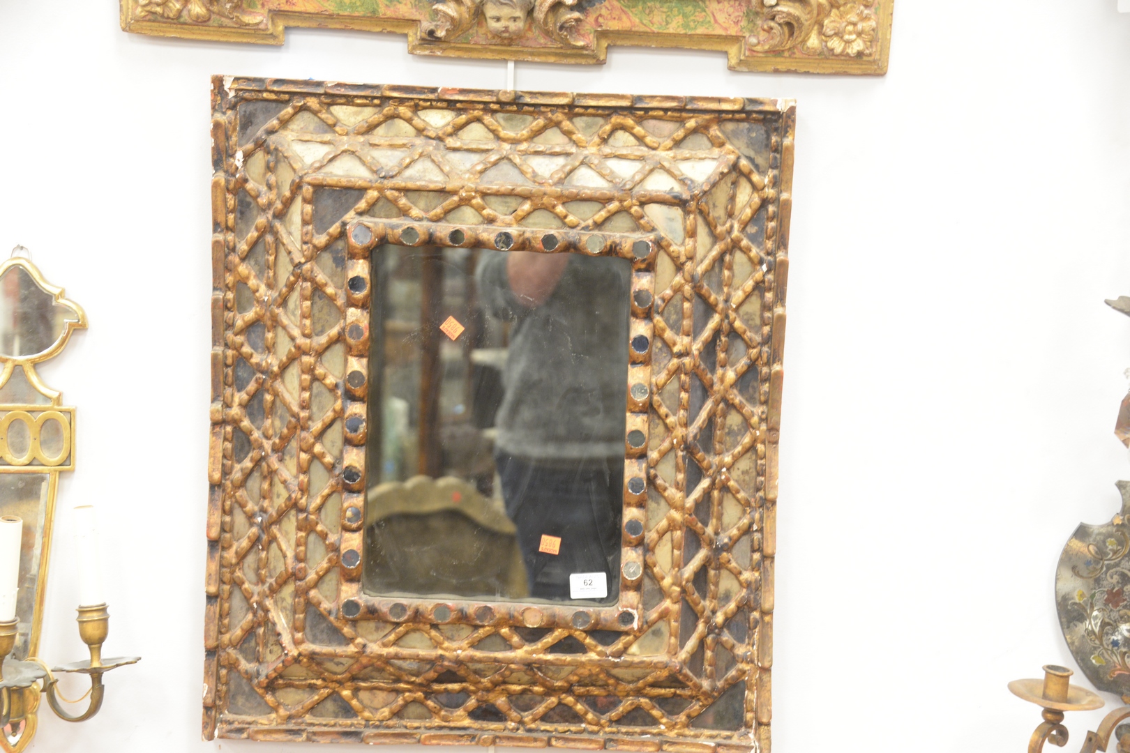 Lot 62: Two Continental Framed Mirrors, to include one rectangle with gilt basket style frame, 28 x 34 the other rectangle having painted and gilt frame with putti figures, 24 x 31.