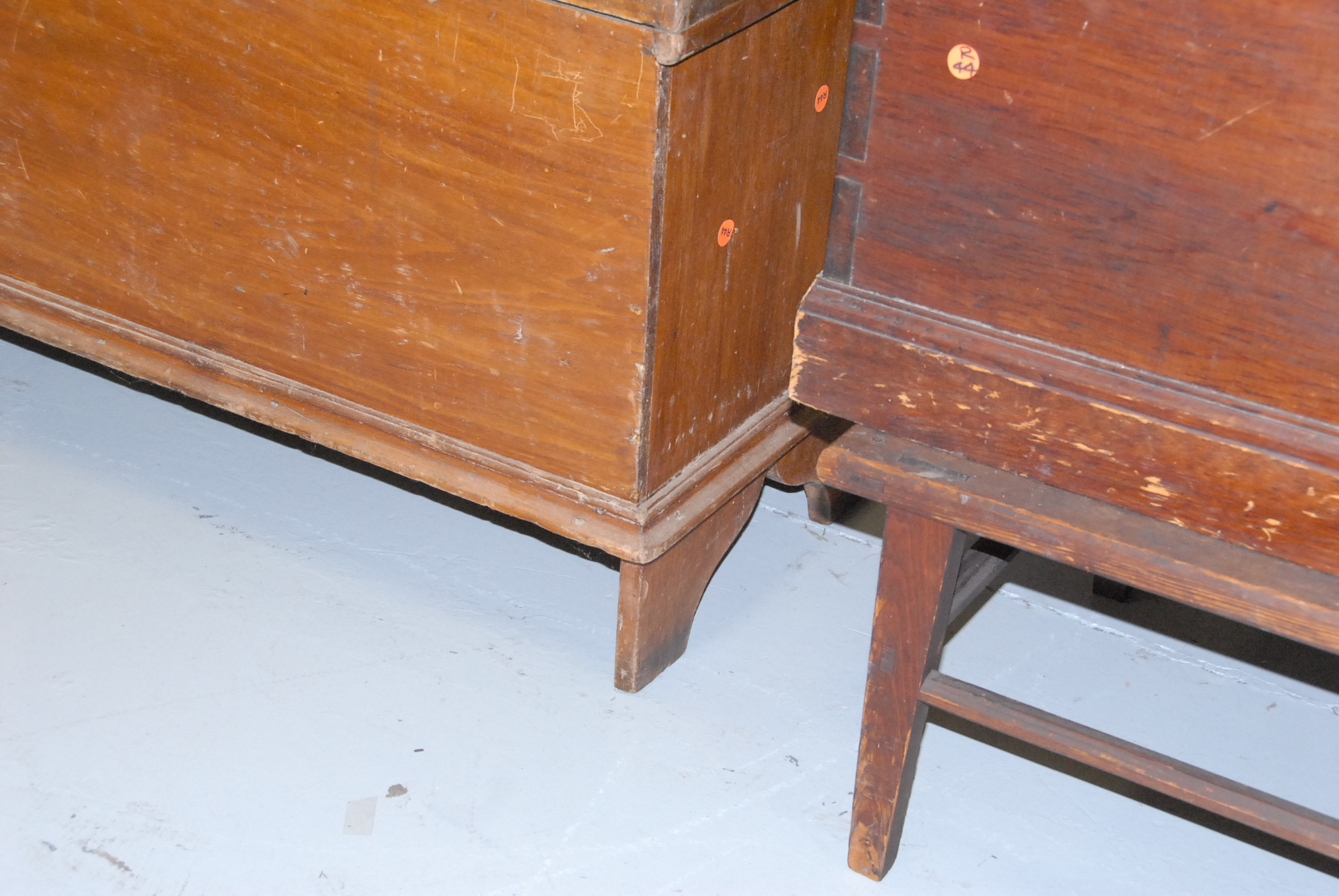 Two primitive lift top chests, one with rope handles.