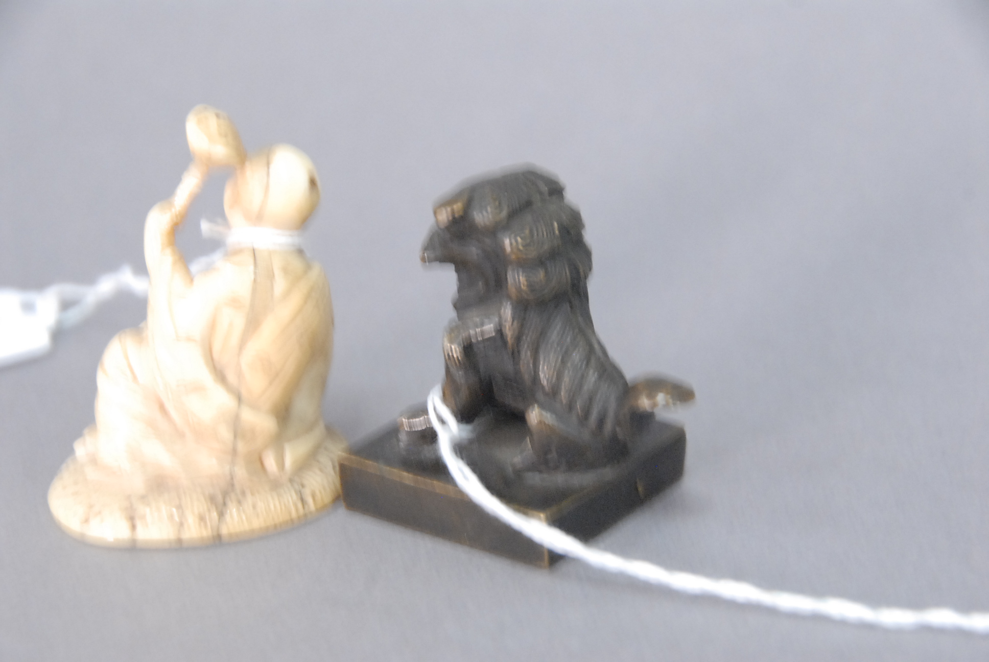 Lot 62: Two small oriental pieces to include, a small carved ivory figure of a man and boy, ht 2, along with a bronze foo dog seal, 1 3/4.