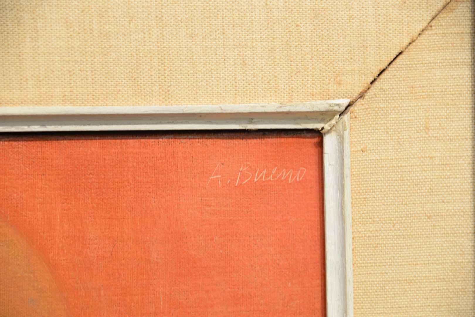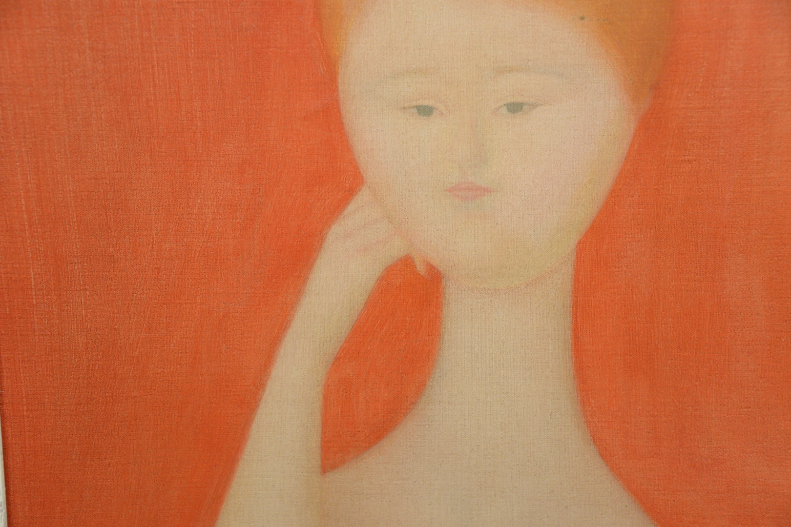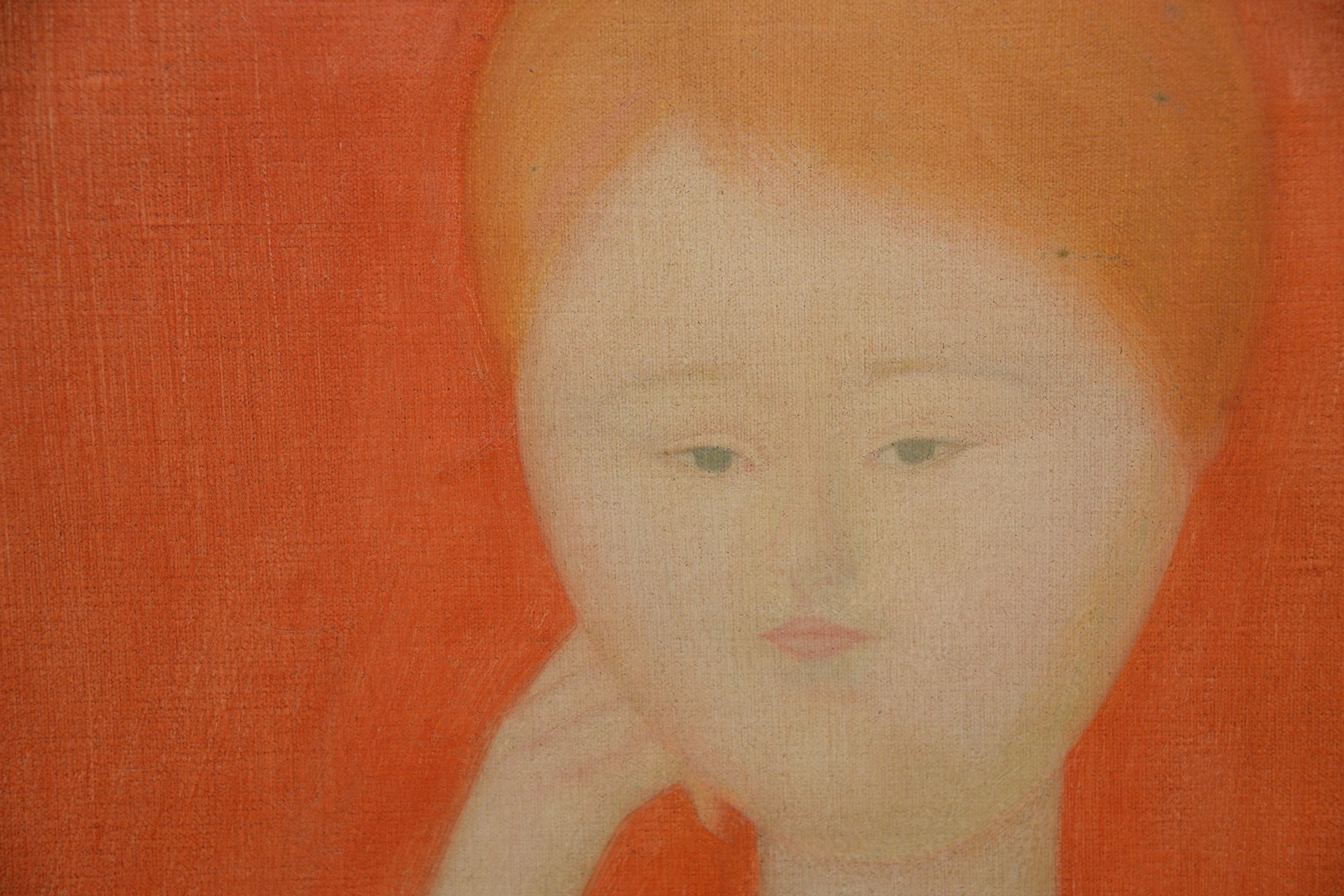 Lot 620: Antonio Bueno 1918 – 1984 Portrait of a Girl with Red Background oil on canvas signed top right A. Bueno 17 3/4 x 16