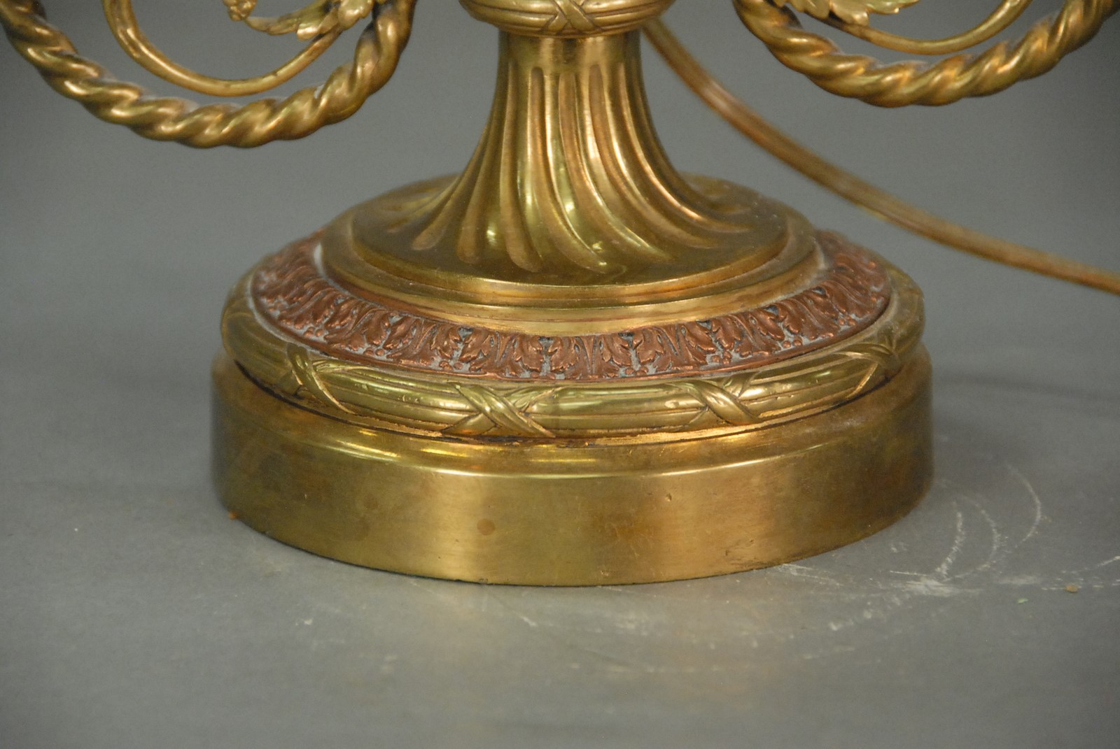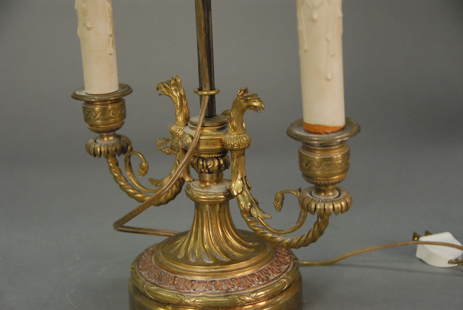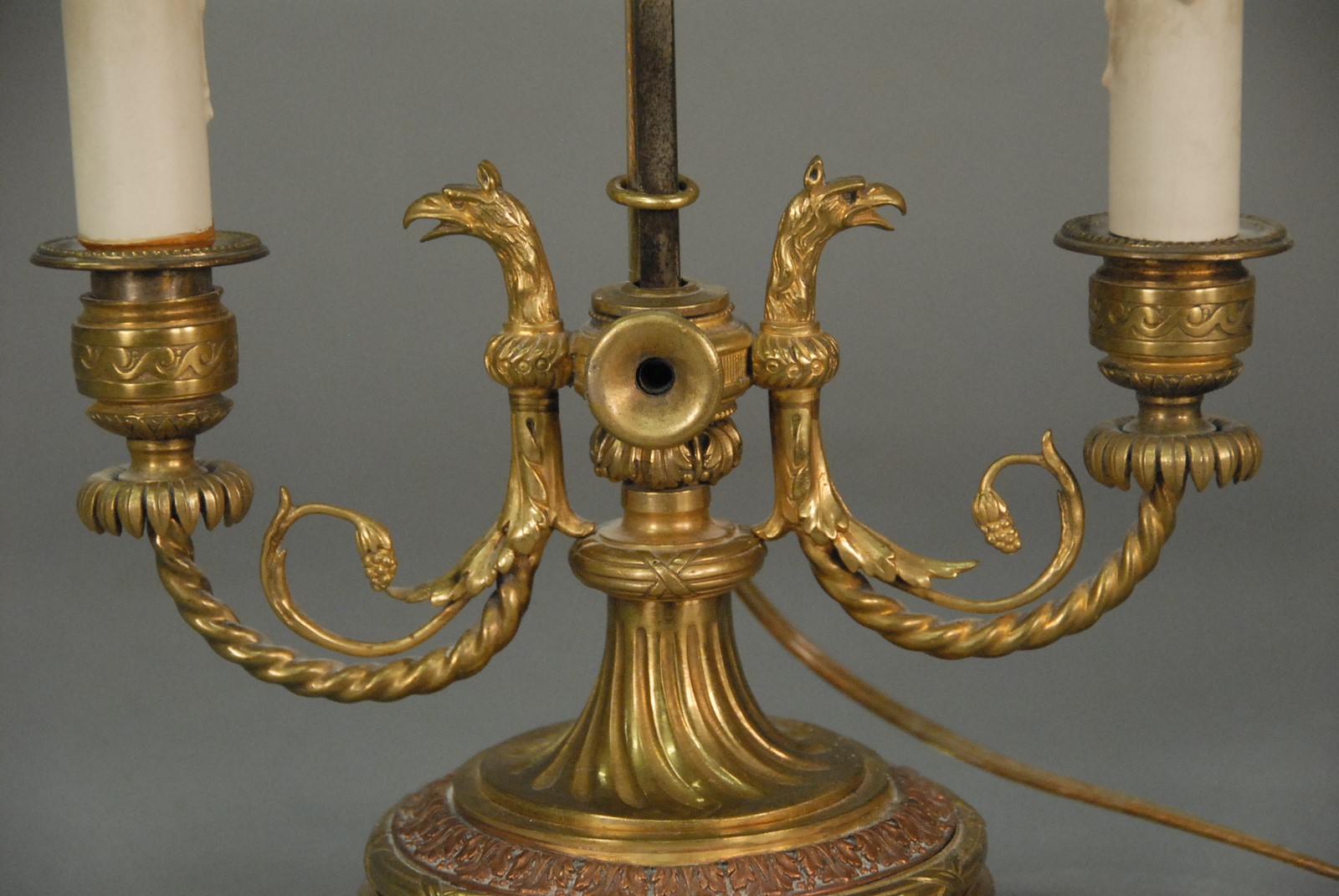 Lot 620: Empire bronze and copper Bouillotte two light lamp with adjustable tole metal shade. ht. 18 in.