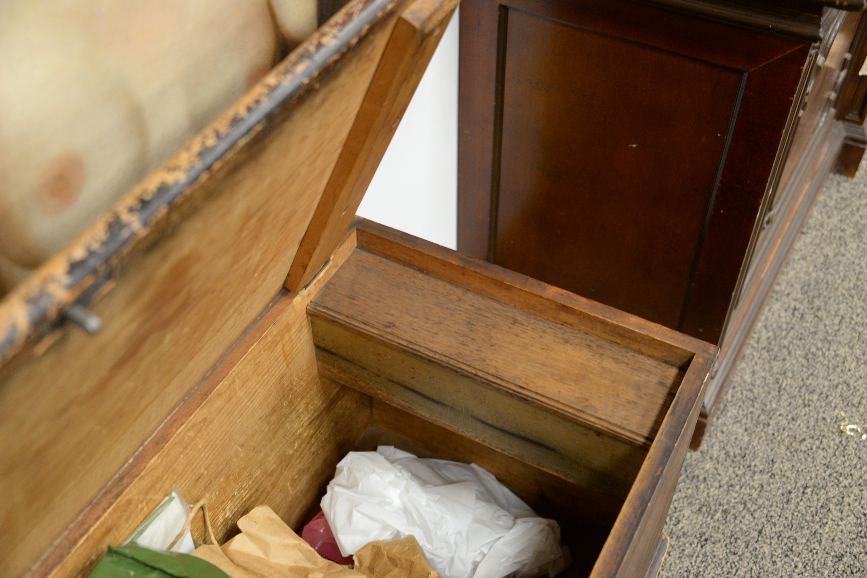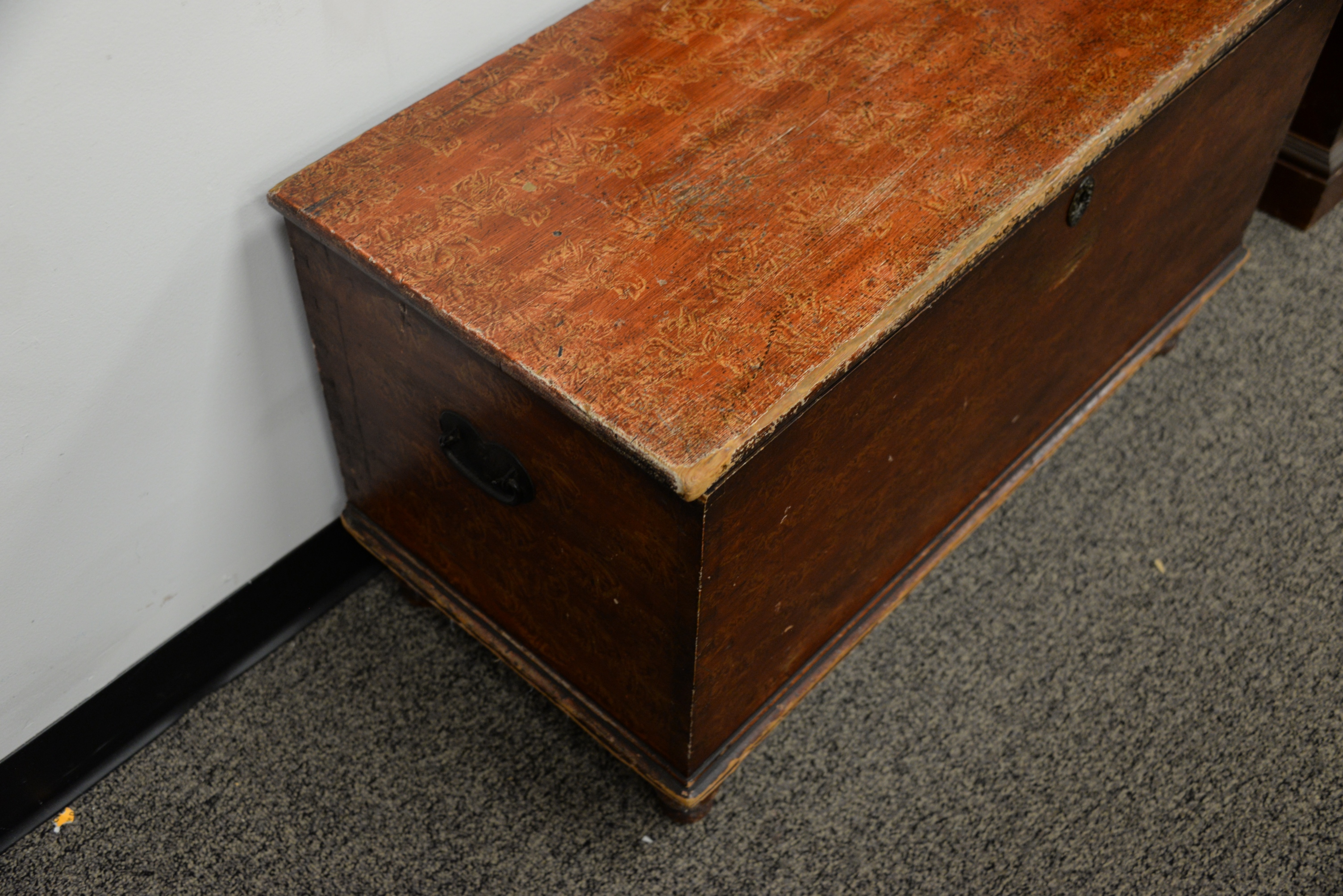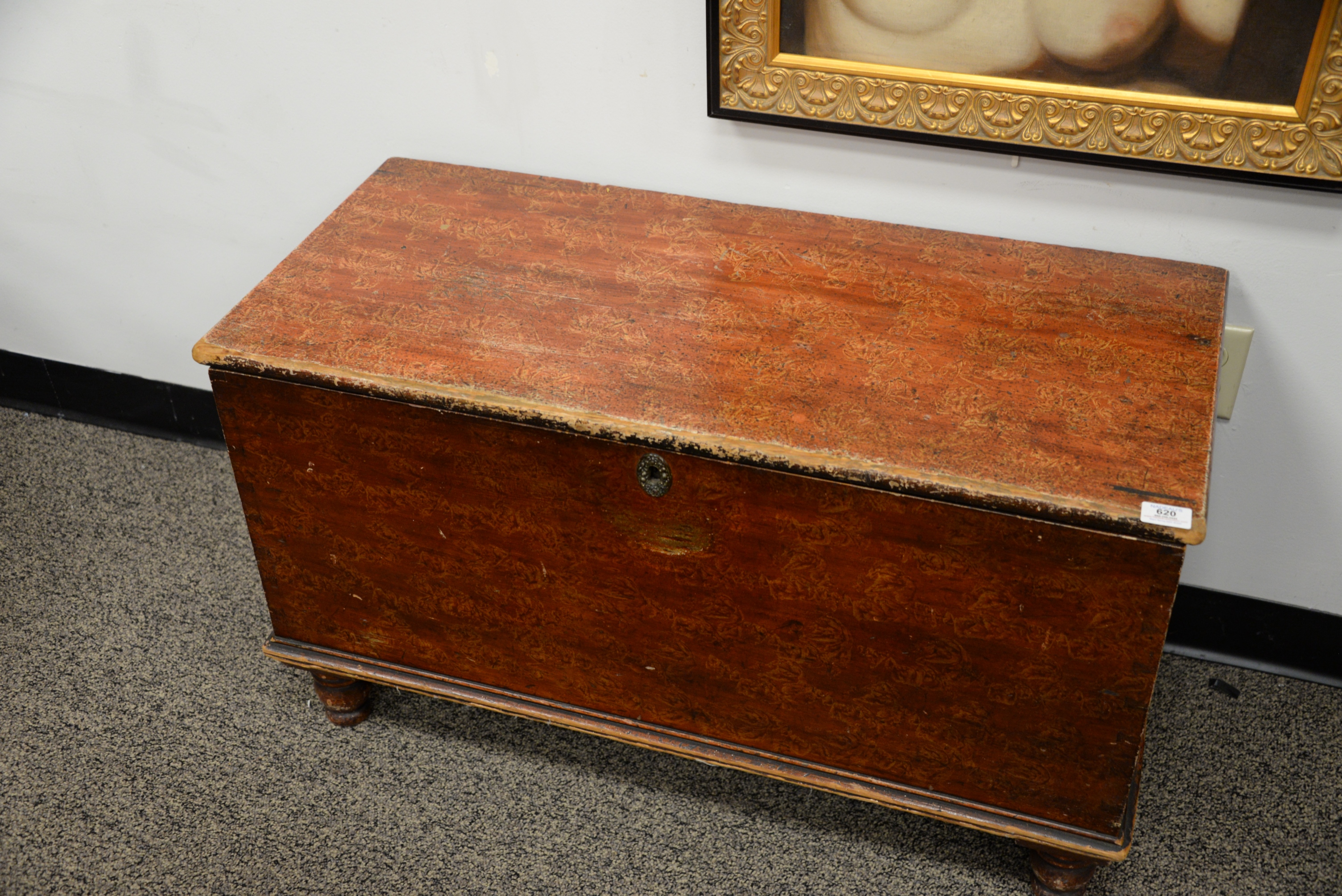 Paint Decorated Lift Top Chest, having iron handles on turned legs, early 19th century, height 21 inches, top 17″ x 37″.