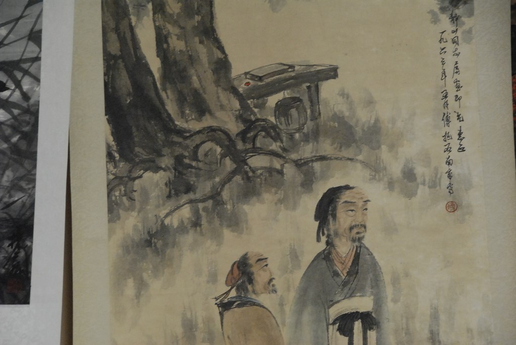 Two Oriental scrolls: watercolor on paper landscape with two scholars. 50 x 22 watercolor on paper of crane. 23 x 23