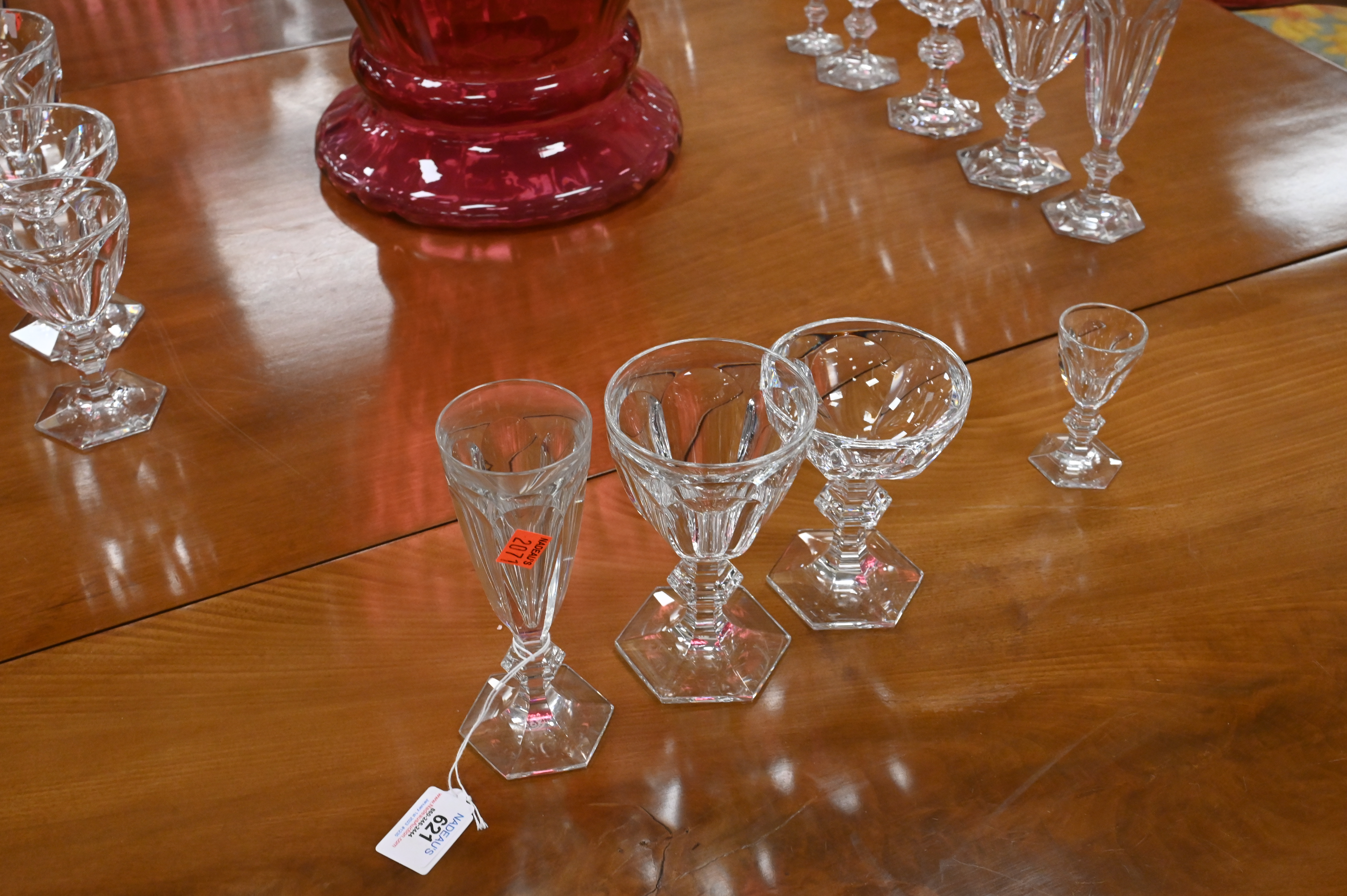 12 white wine glasses, 4 collins glasses, 9 sherbert glasses, 6 cordials glasses, 4 rocks glasses