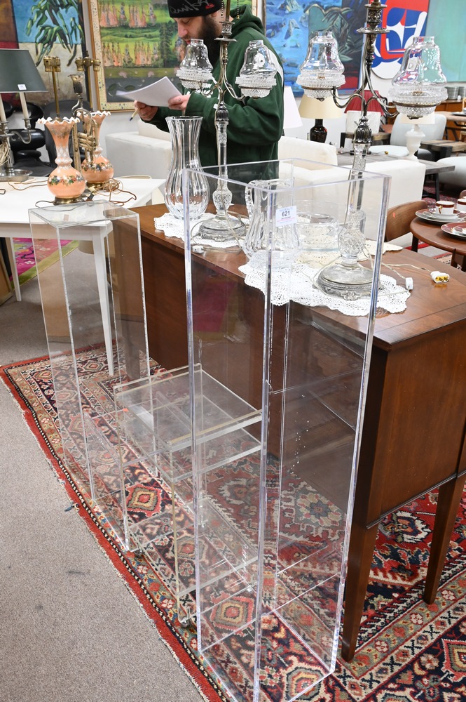 Lot 621: Four Piece Lucite Group, to include two pedestals and two small stands (one pedestal is missing top), tallest in height 47 1/2 inches.