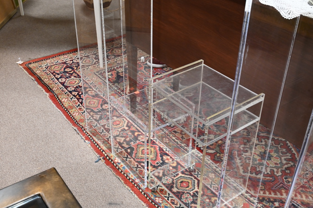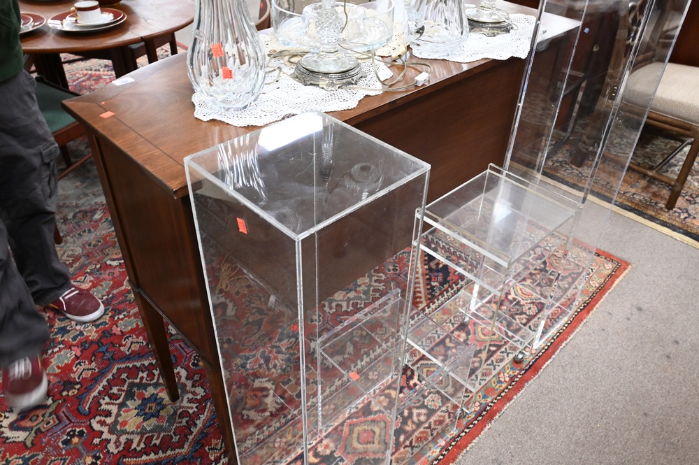 Four Piece Lucite Group, to include two pedestals and two small stands (one pedestal is missing top), tallest in height 47 1/2 inches.